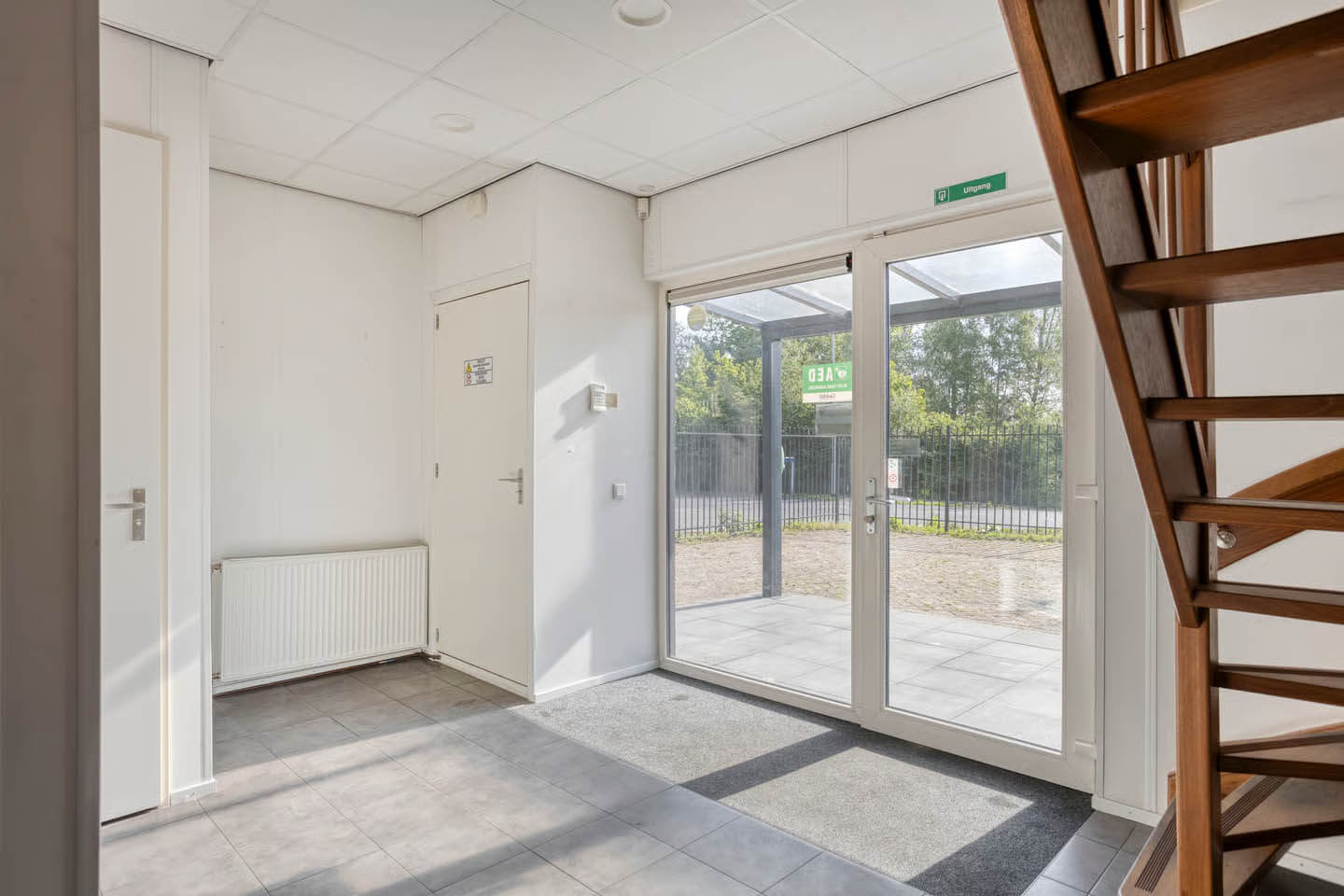 - Entree, v.v. betonnen vloer gedekt met tegels, systeemplaten wanden, systeemplafond, trapopgang naar eerste verdieping, keukenblok met koelkast, twee toiletruimtes, loopdeur met toegang naar de loods en meterkast.