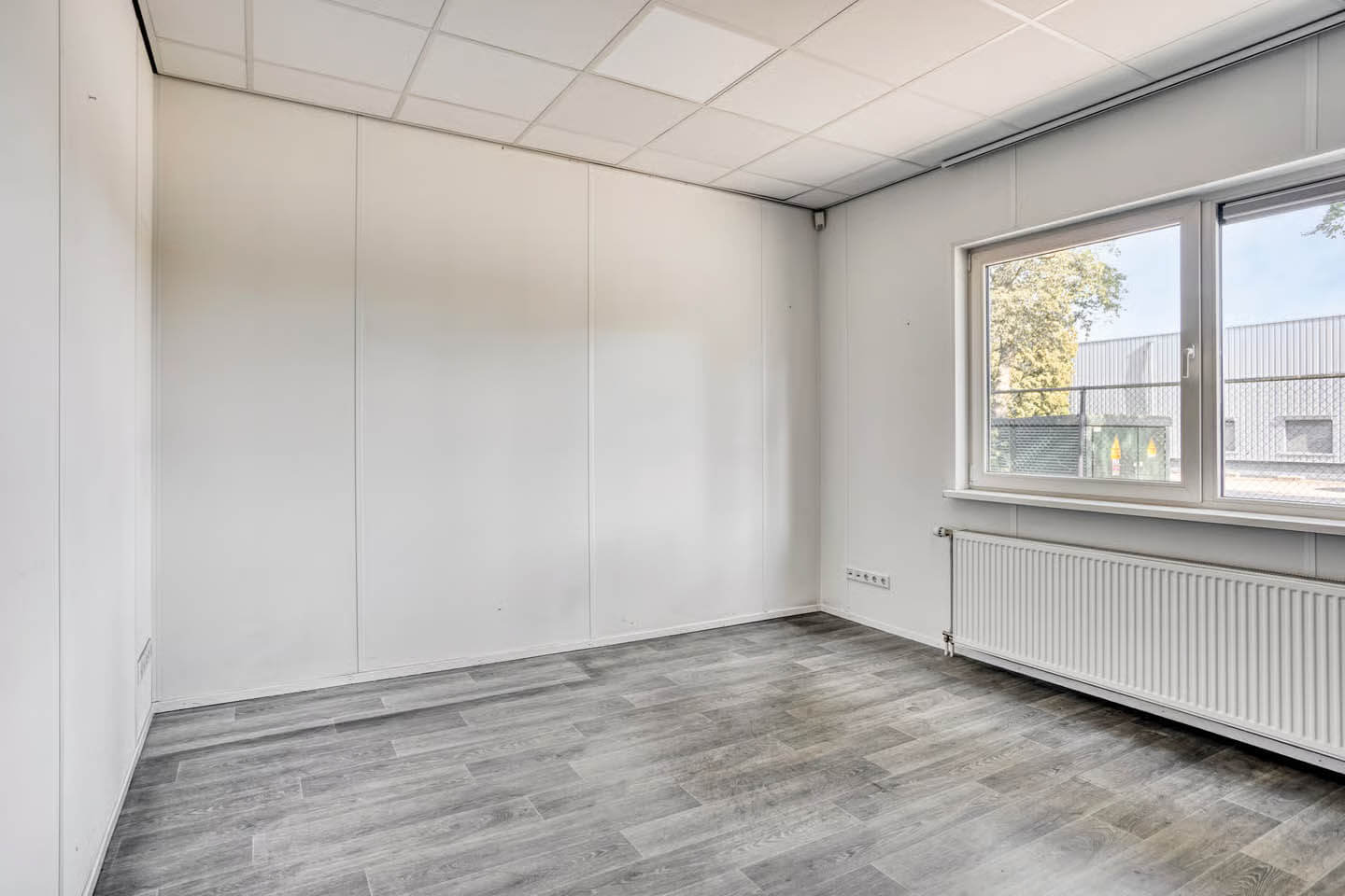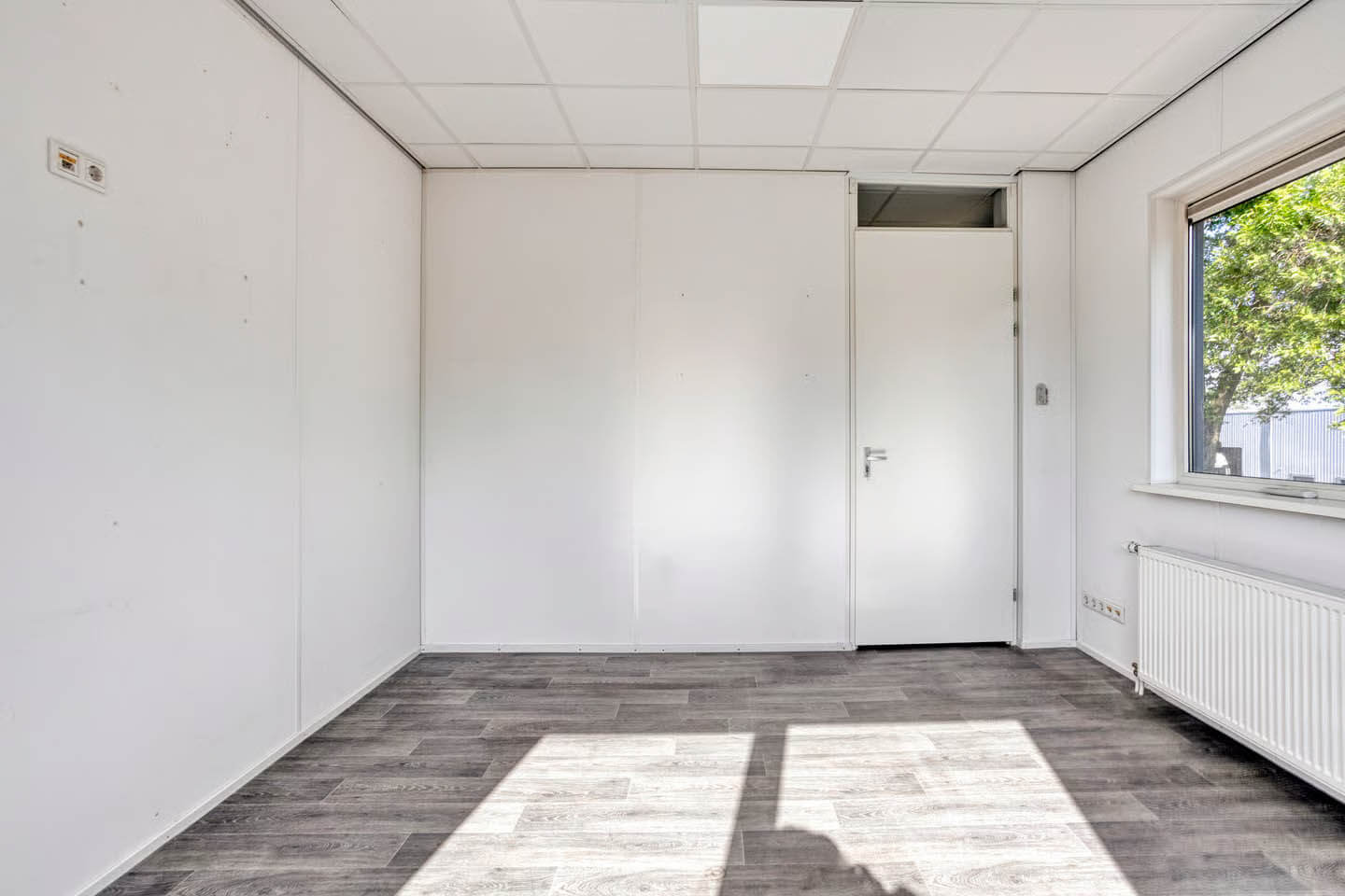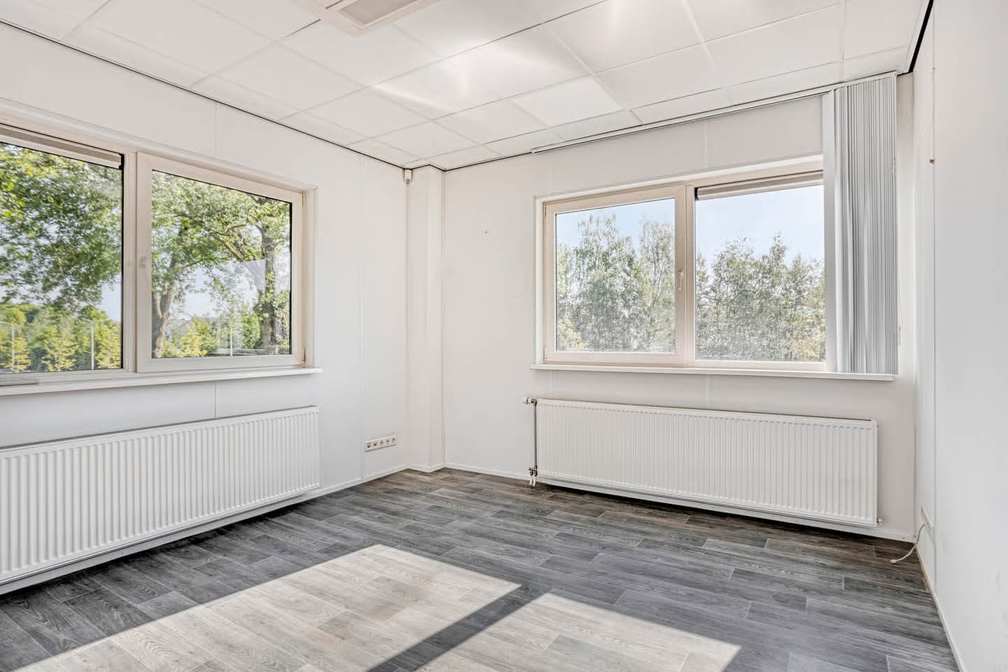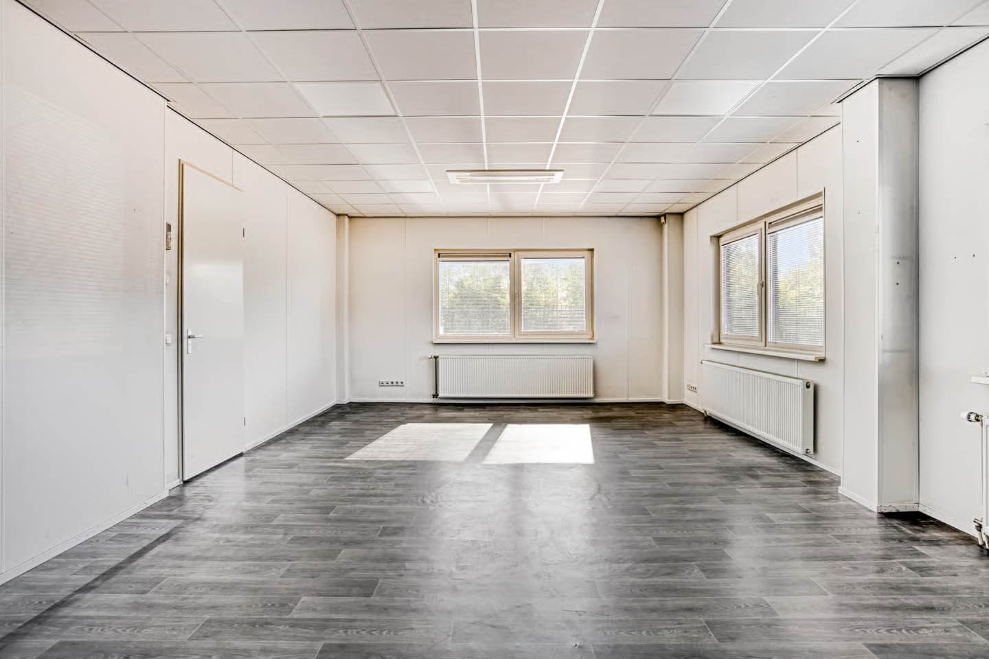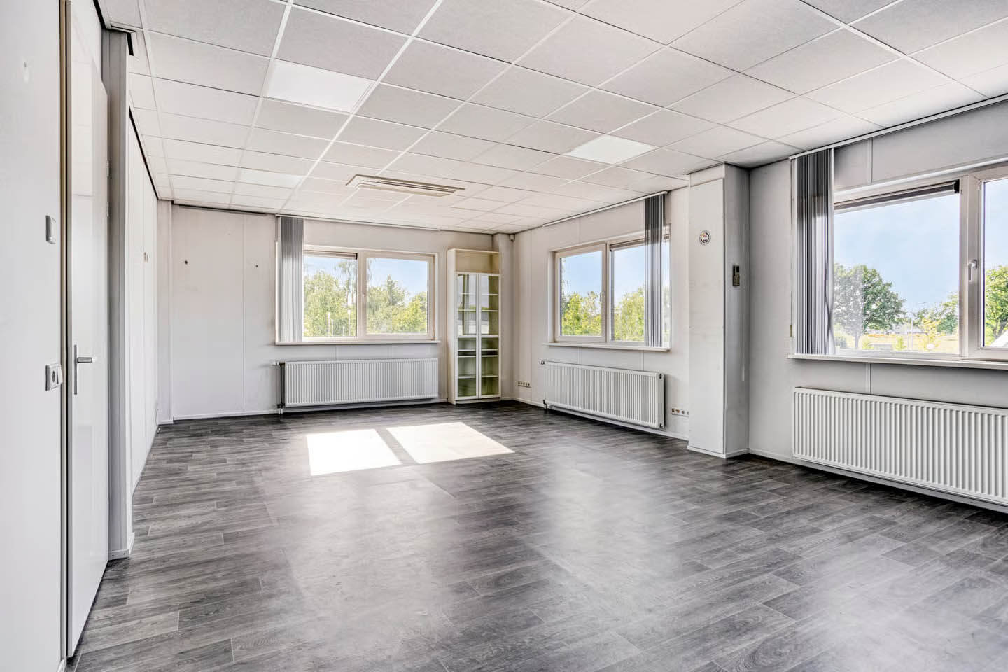 - kantoor II, v.v. betonnen vloer gedekt met laminaat, systeemwanden, systeemplafond en airco.