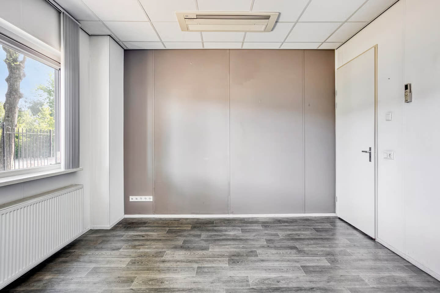 - Kantoor V, v.v. houten vloer gedekt met laminaat, systeemwanden, systeemplafond en airco.