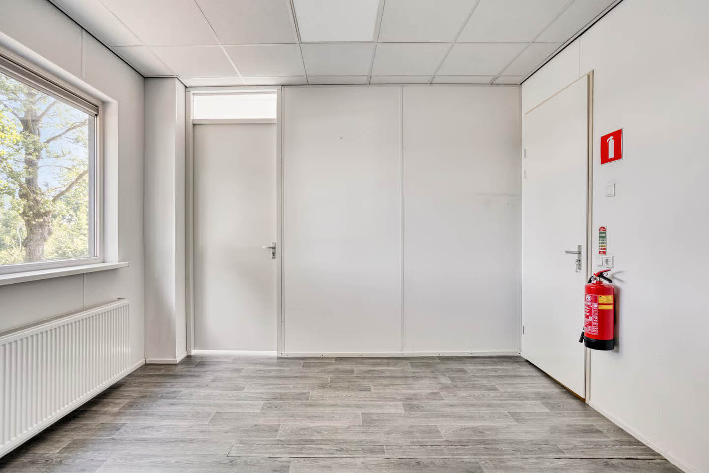 - Kantoor II, v.v. houten vloer gedekt met laminaat, systeemwanden, systeemplafond en airco.