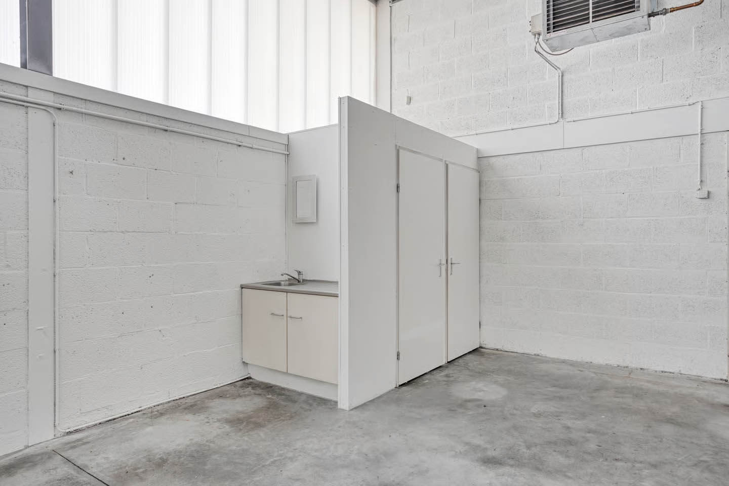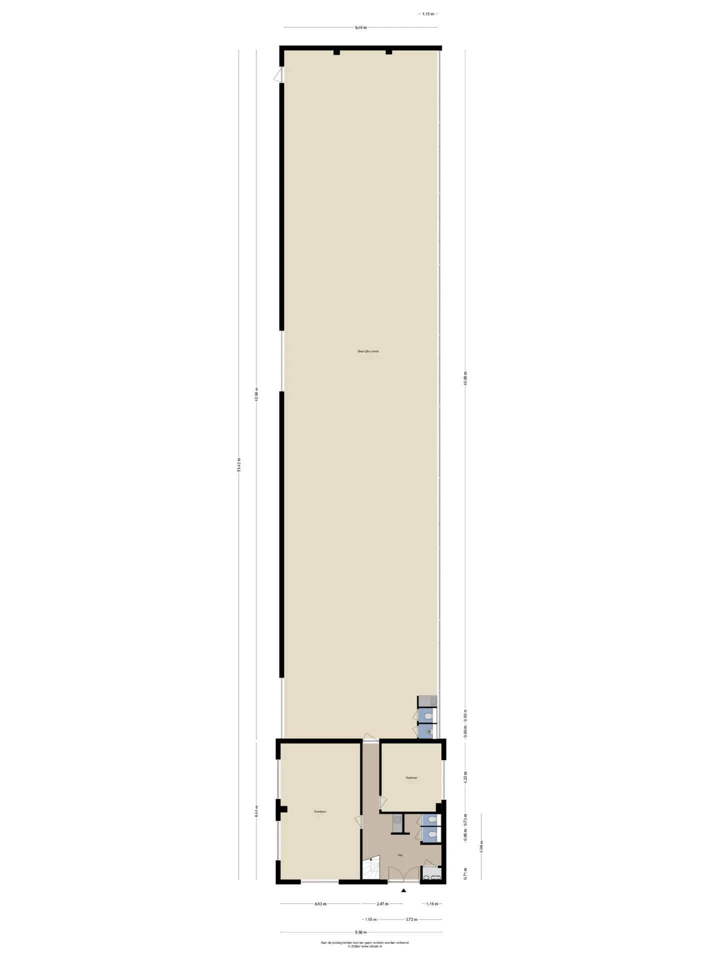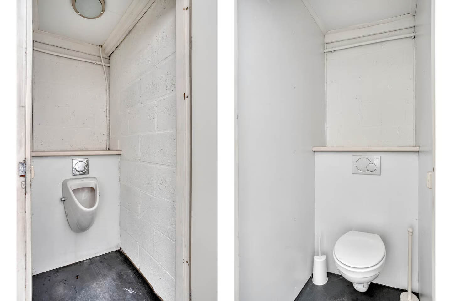 - Loods, v.v. betonnen vloer, betonblok wanden, golfplaten plafond, twee overheaddeuren, loopdeur naar buiten, keukenblok, twee toiletruimtes en mechanische ventilatie.