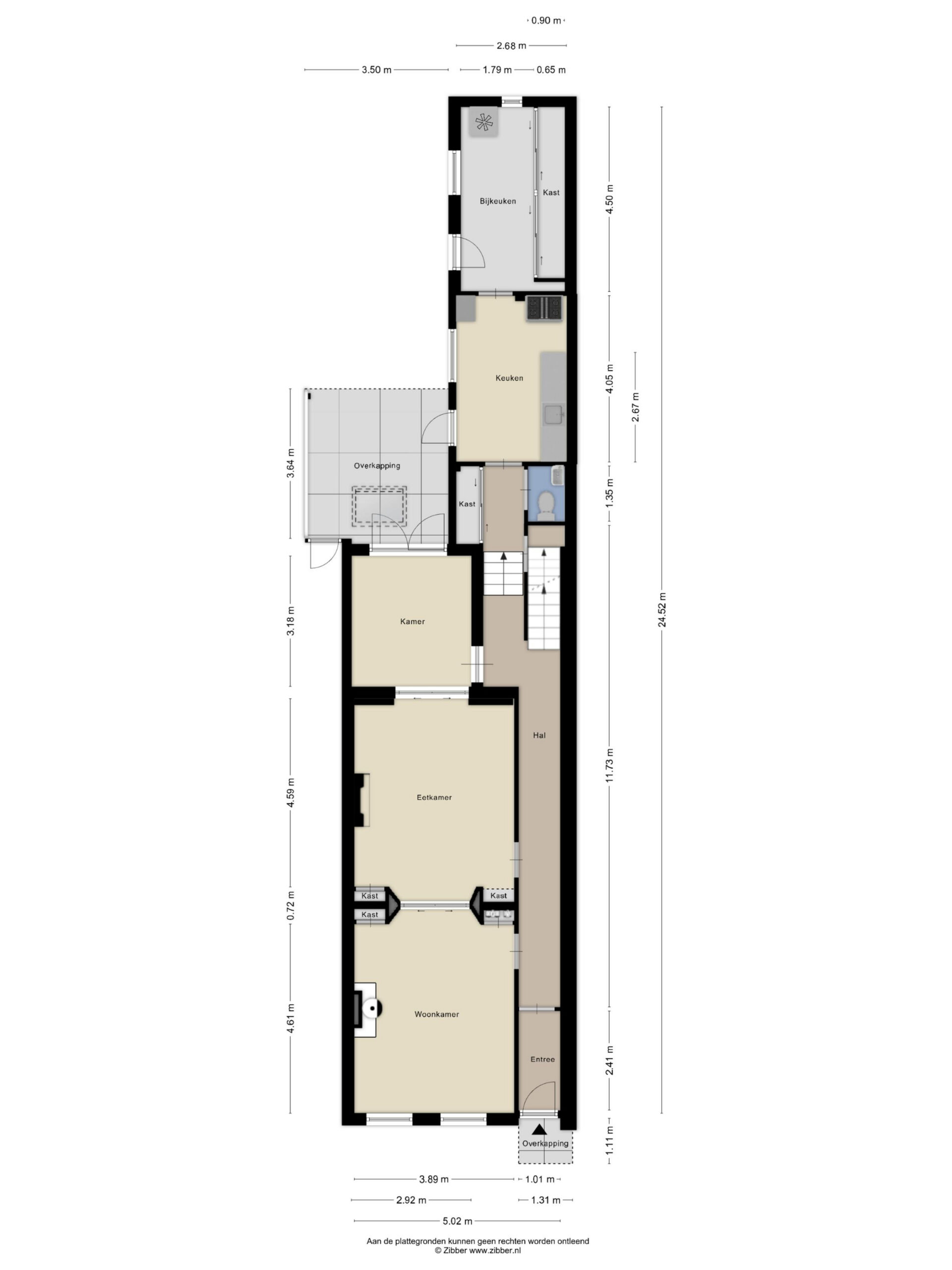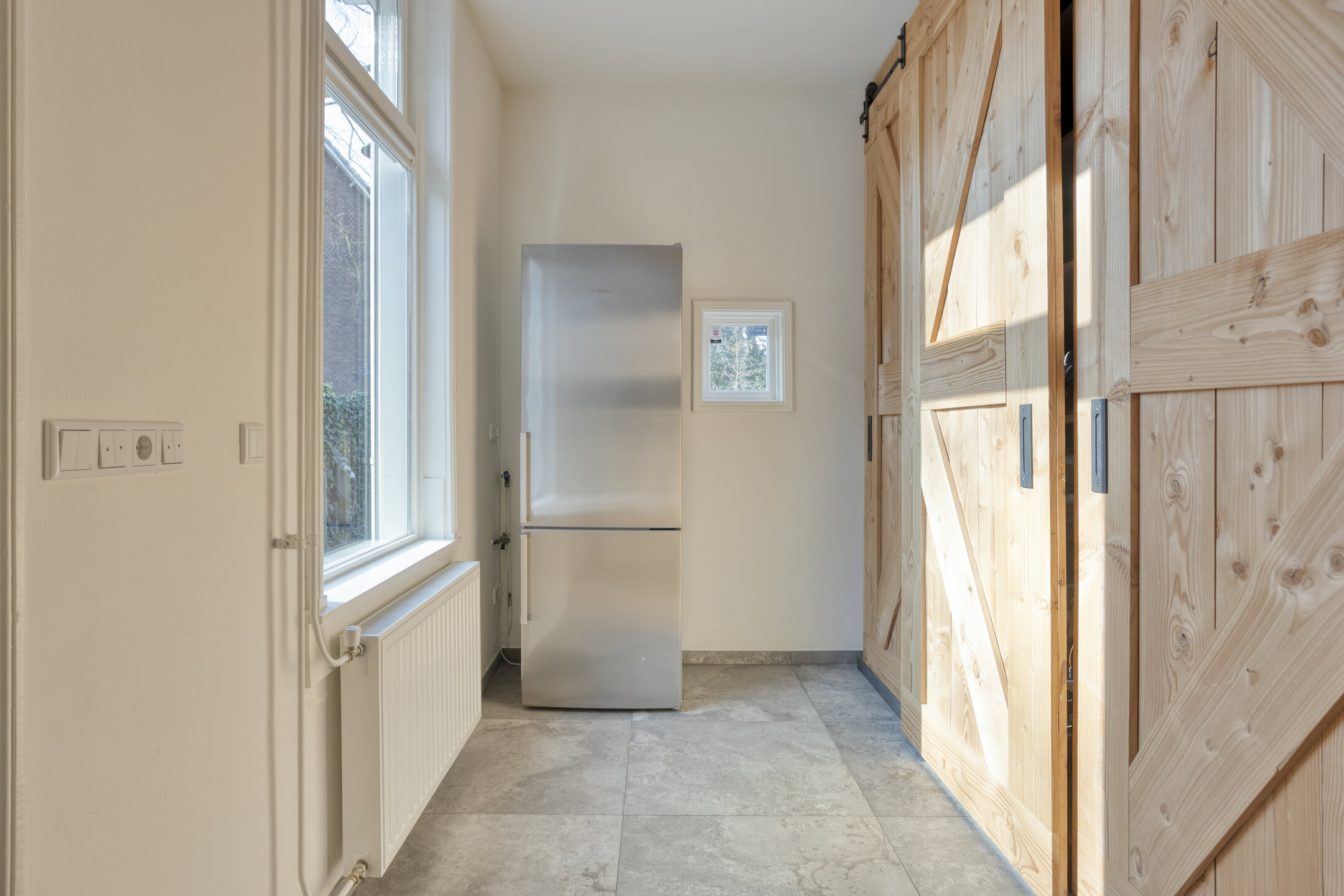 Vanuit de keuken bereik je de zeer ruime bijkeuken met vaste kastenwand over de volle breedte. Tevens geeft ook de bijkeuken toegang tot de achtertuin.
