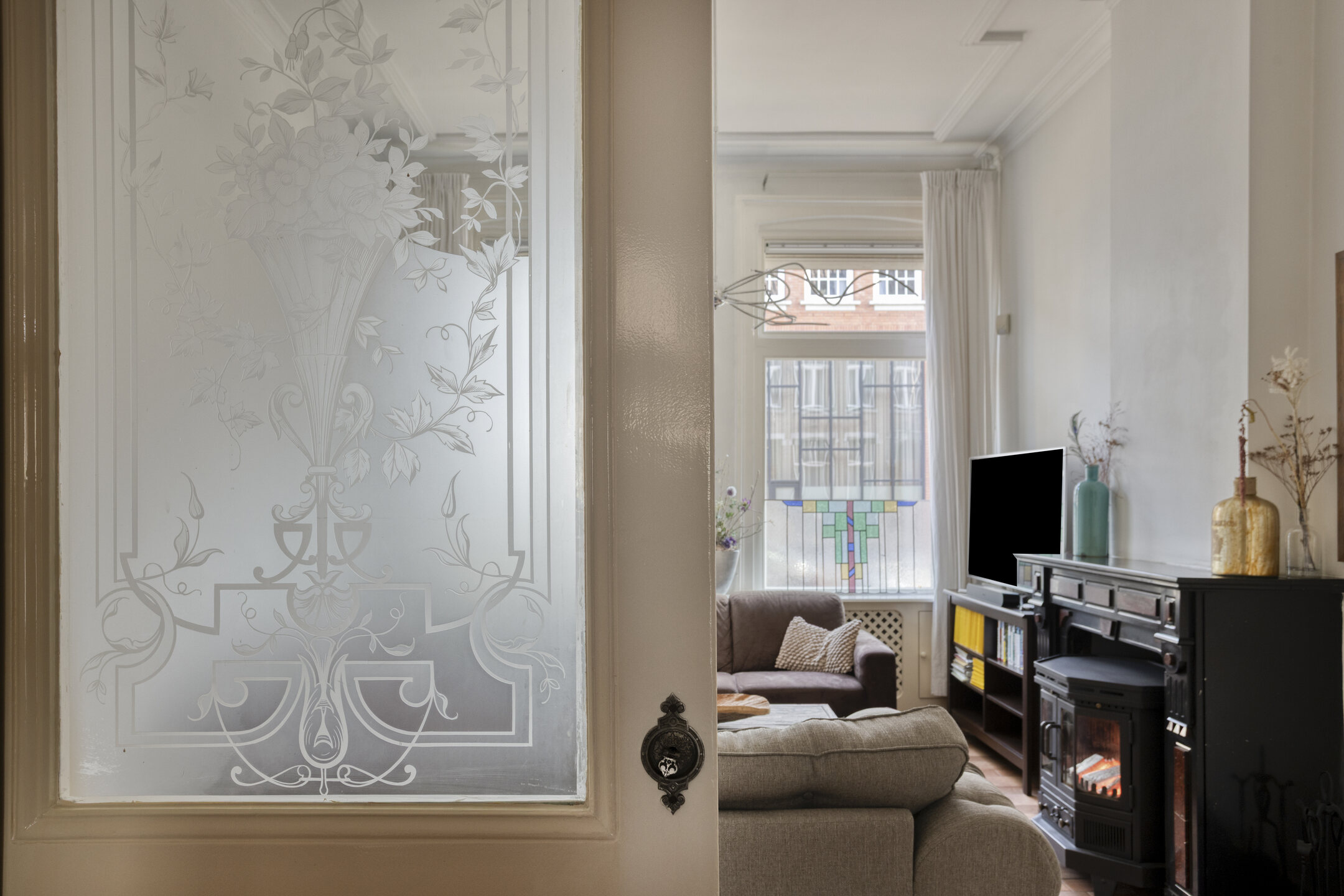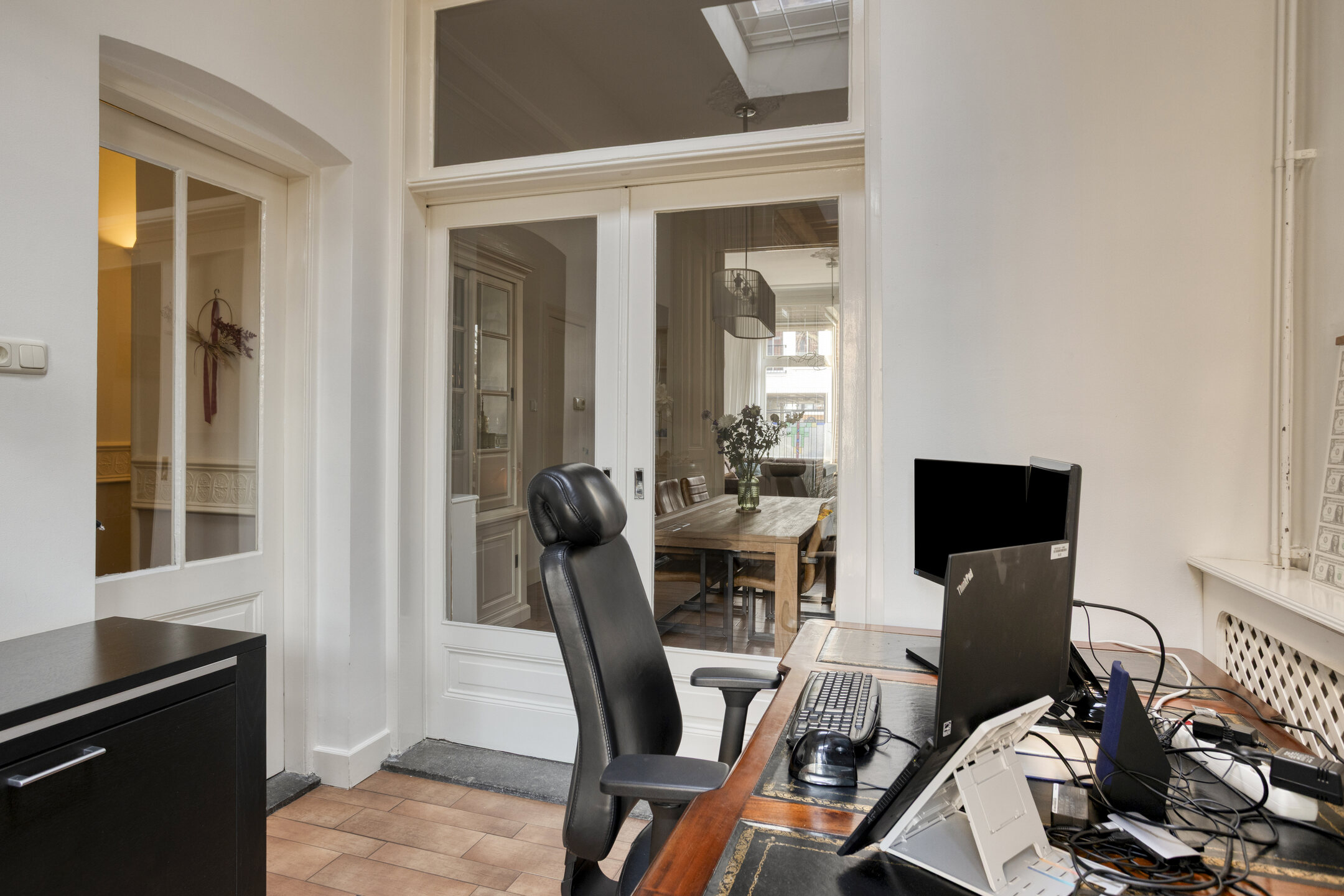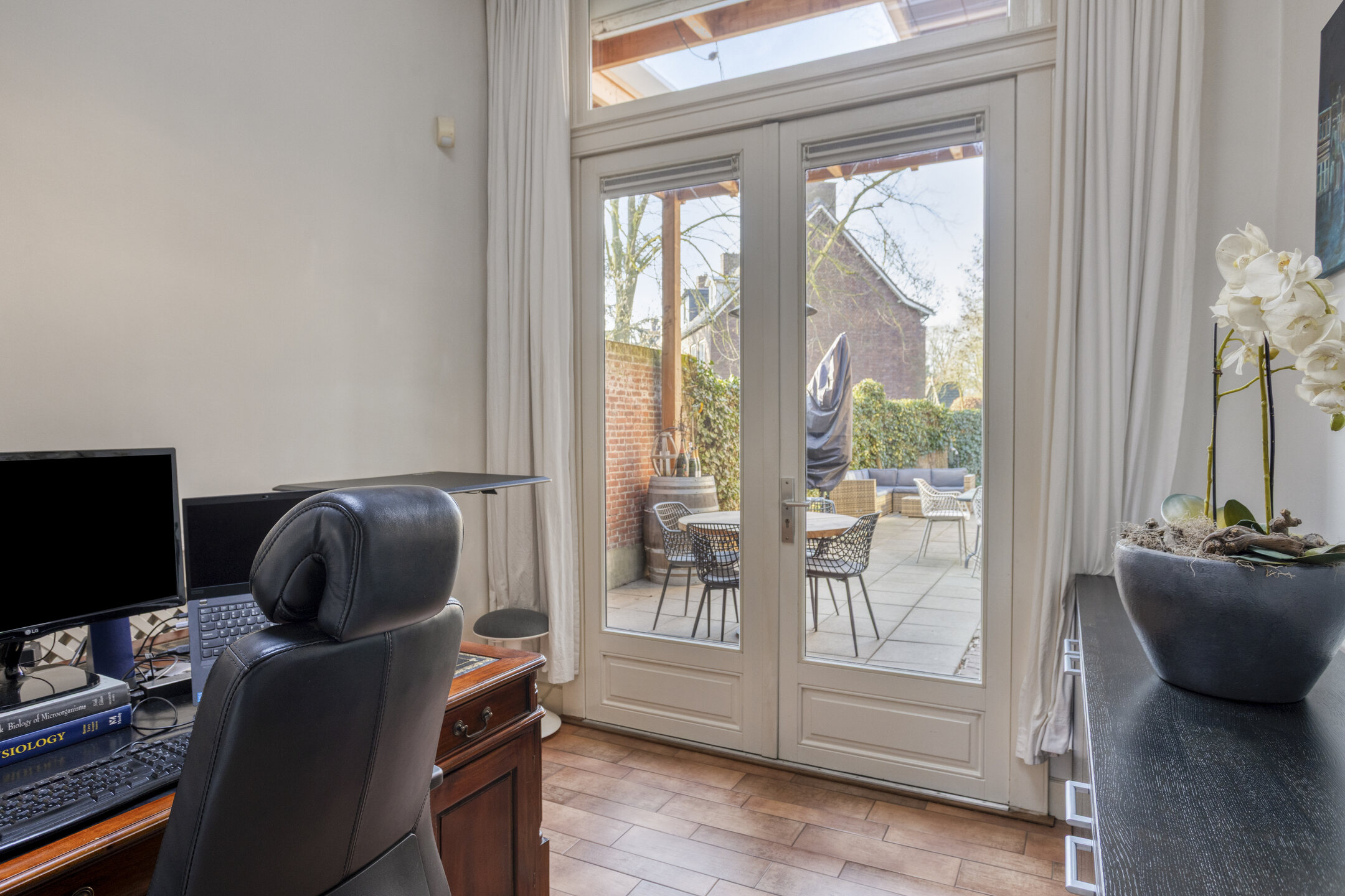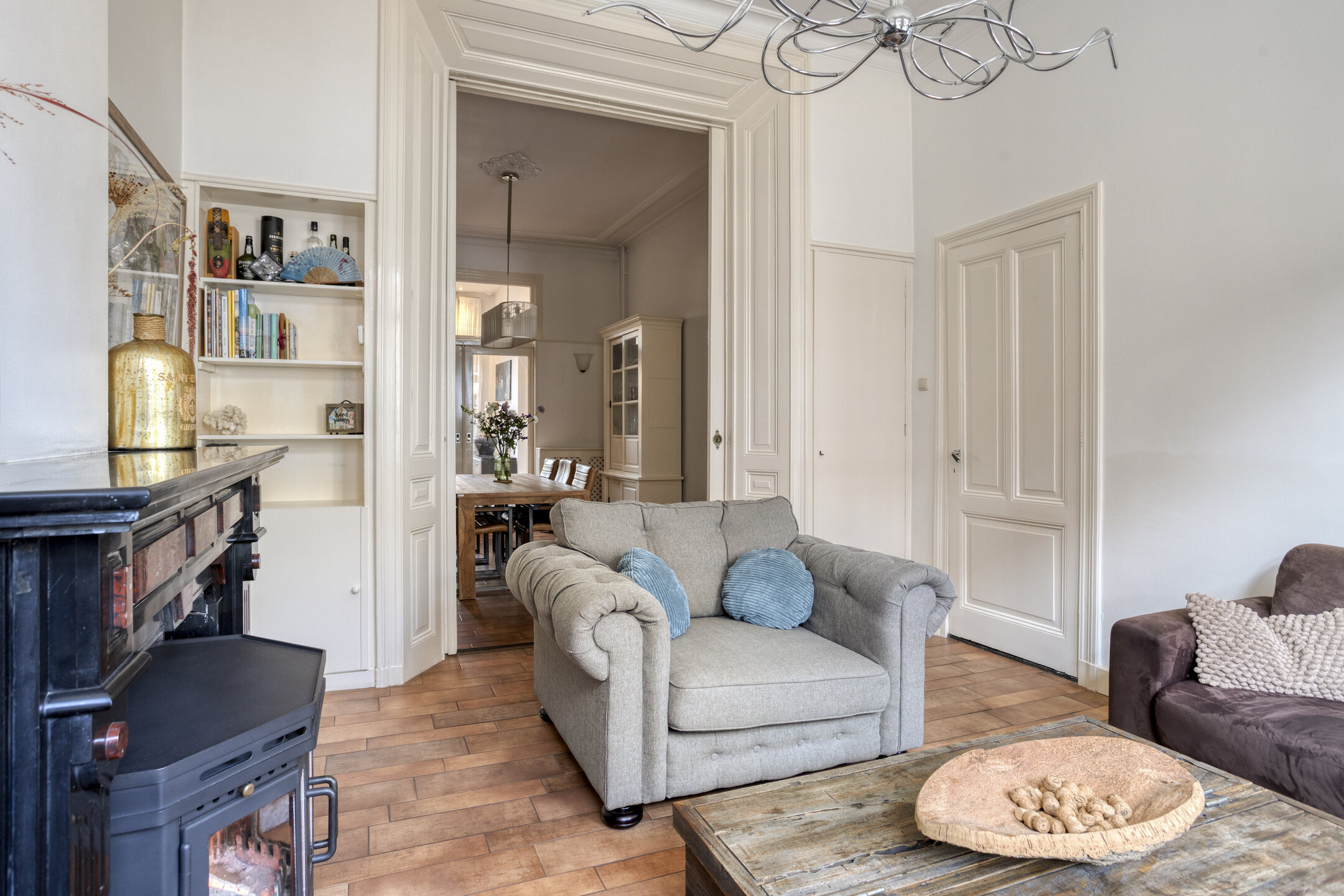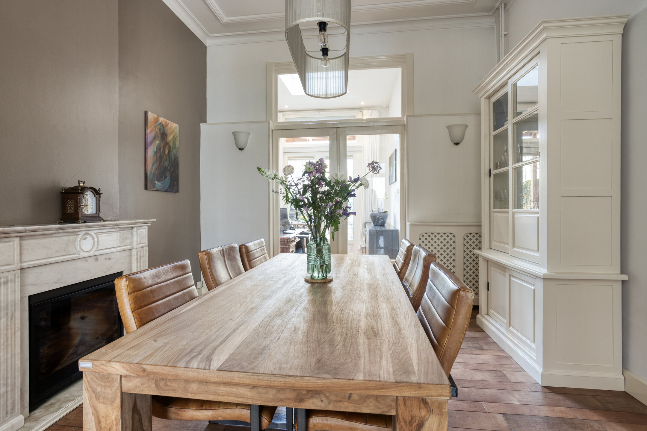 Via de fraaie entree met voorportaal komt je in een imposante gang met authentieke tegelvloer en vaste kasten. De royale woonkamer en suite (totaal circa 40 m²) beschikt over een tegelvloer met vloerverwarming, prachtige schuifdeuren met vaste kasten en twee karakteristieke schouwen. De schouw aan de voorzijde is in gebruik en voorzien van een houtkachel. Vanuit de woonkamer bereik je de lichte tuin-/werkkamer met openslaande deuren naar het terras en de tuin.