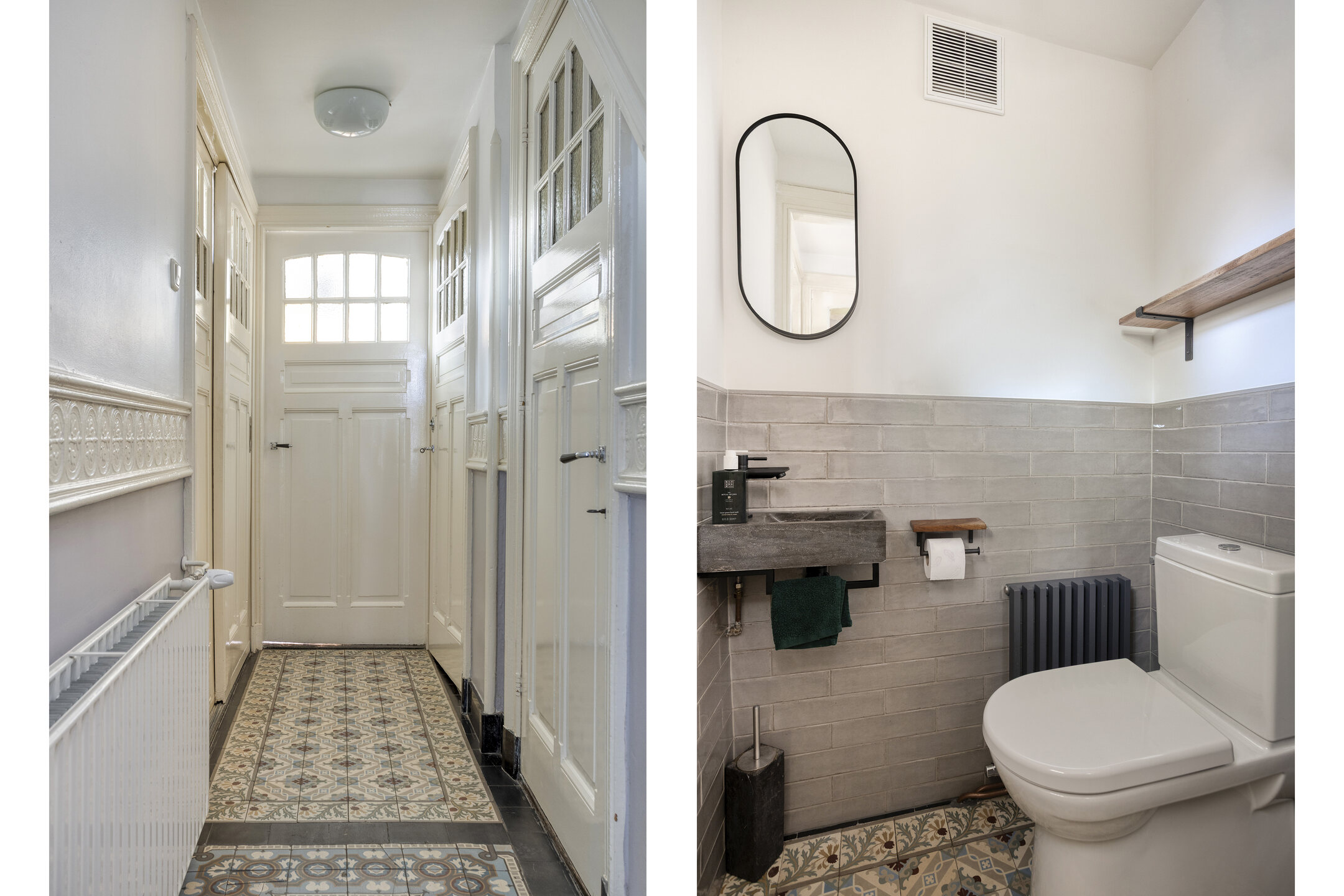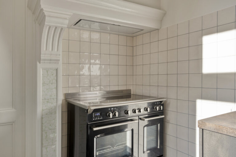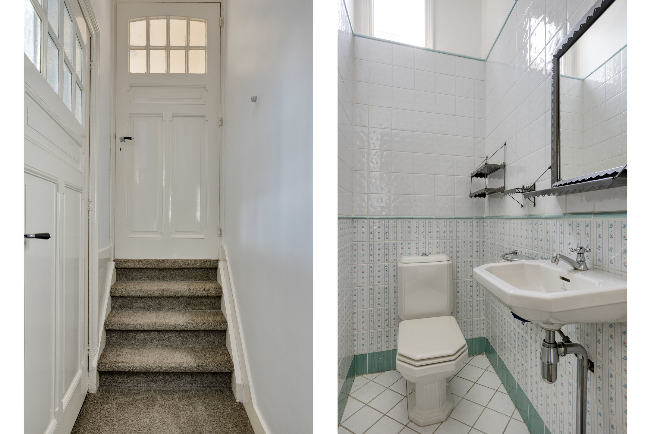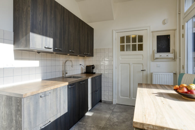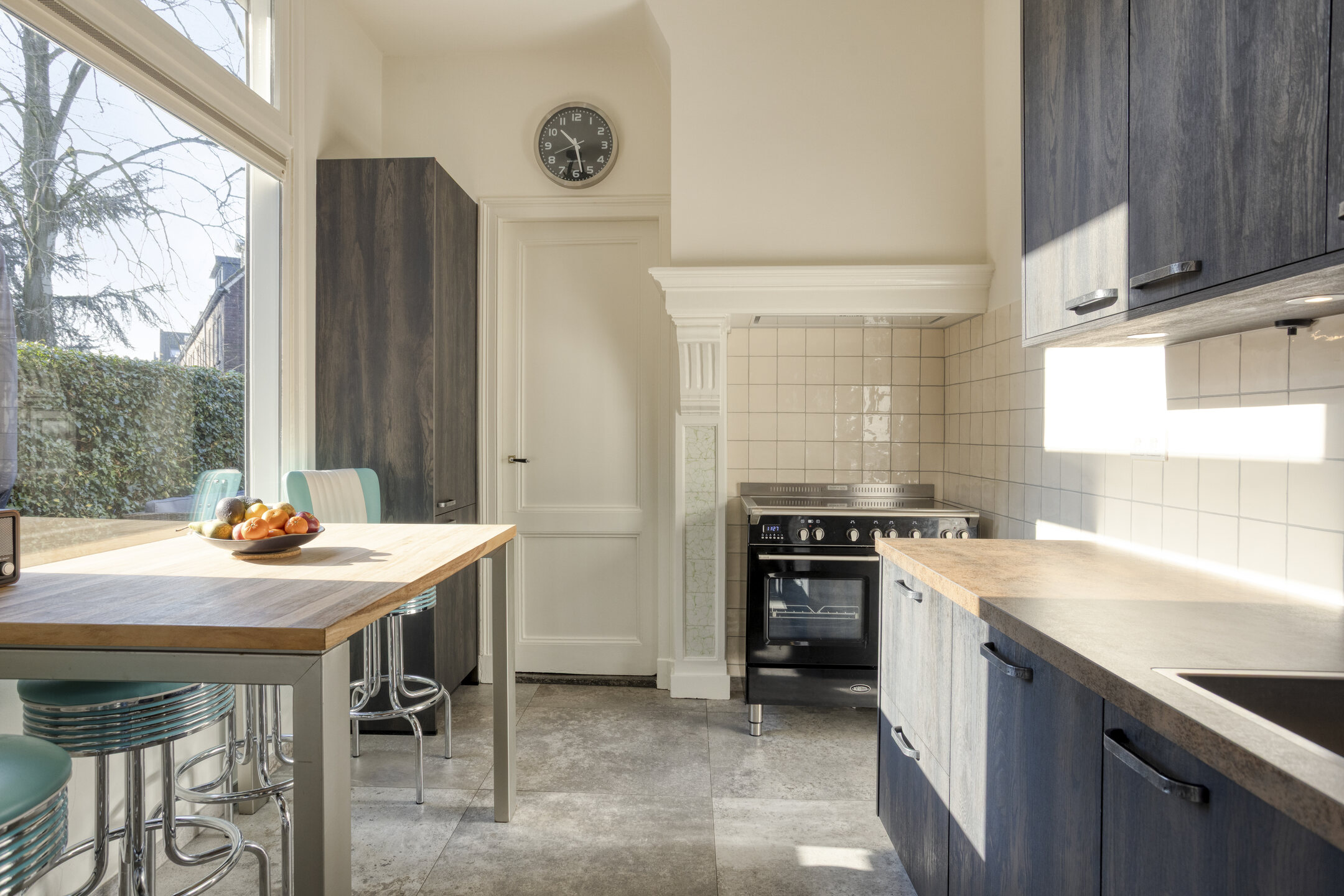 Verder is er op de begane grond toegang tot een kelder, een vernieuwd toilet met authentieke tegelvloer, een sfeervolle woonkeuken met moderne inrichting (2022) voorzien van een keramisch werkblad en diverse (inbouw)apparatuur te weten een los Boretti fornuis met 2 ovens, afzuigkap, vaatwasser, koel-/vriescombinatie en Quooker. De keuken is voorzien van een moderne tegelvloer en een deur naar de achtertuin.