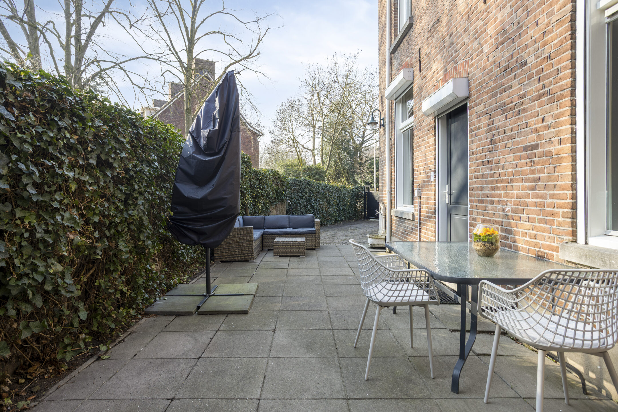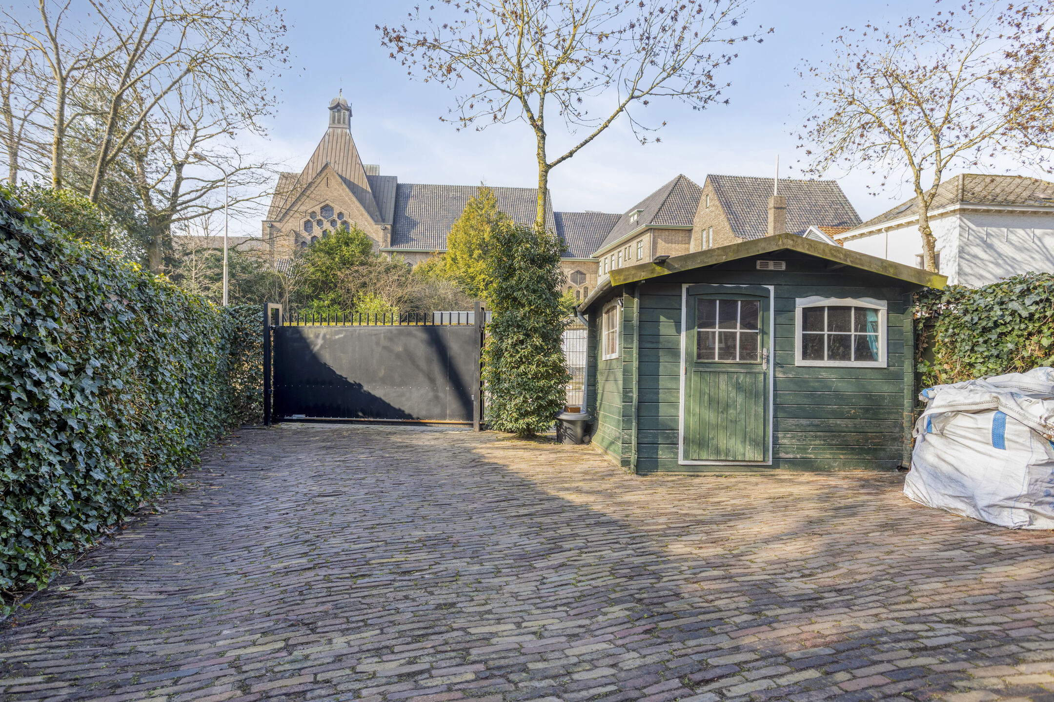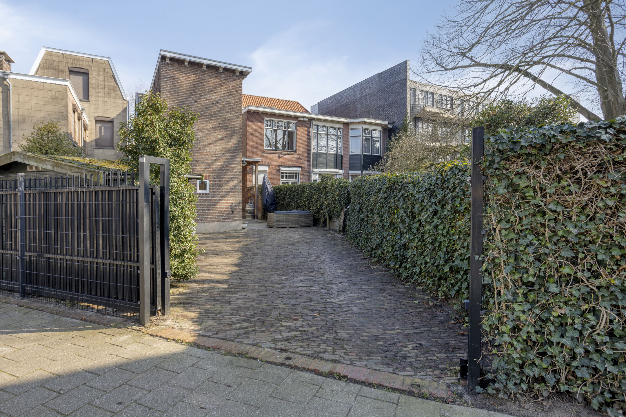 De woning beschikt over een beschutte achtertuin gelegen op het Zuiden, met grote overkapping, terras en berging/tuinhuis. Via een brede poort (elektrisch en op afstand bedienbaar) aan de achterzijde (Burgemeester Prinsensingel) is er toegang tot het perceel met parkeermogelijkheid voor auto’s op eigen terrein. De achtertuin beschikt tevens over een elektrisch oplaadpunt. Daarnaast is er een praktische zijgang naast de woning.