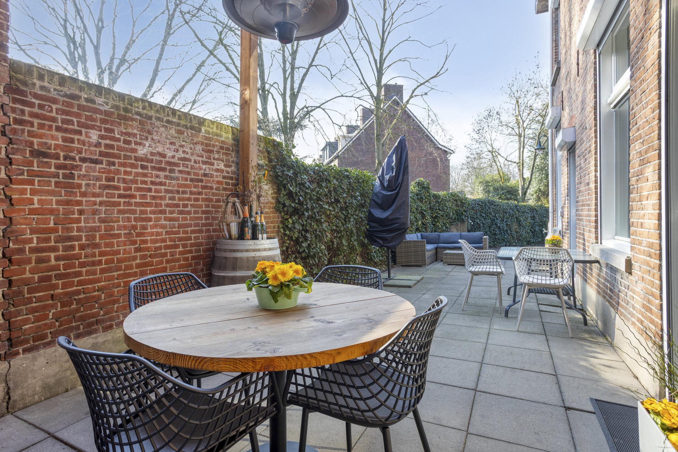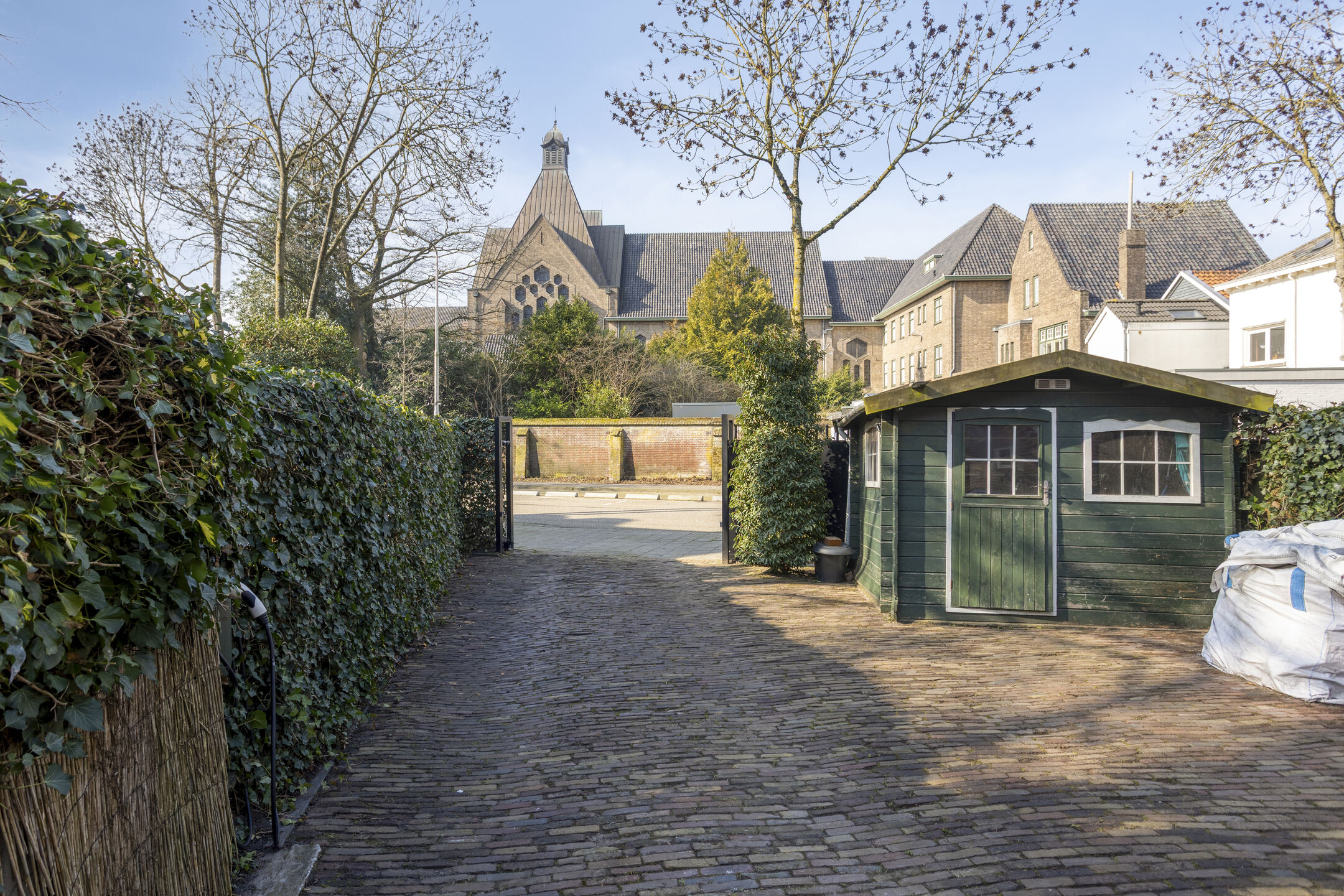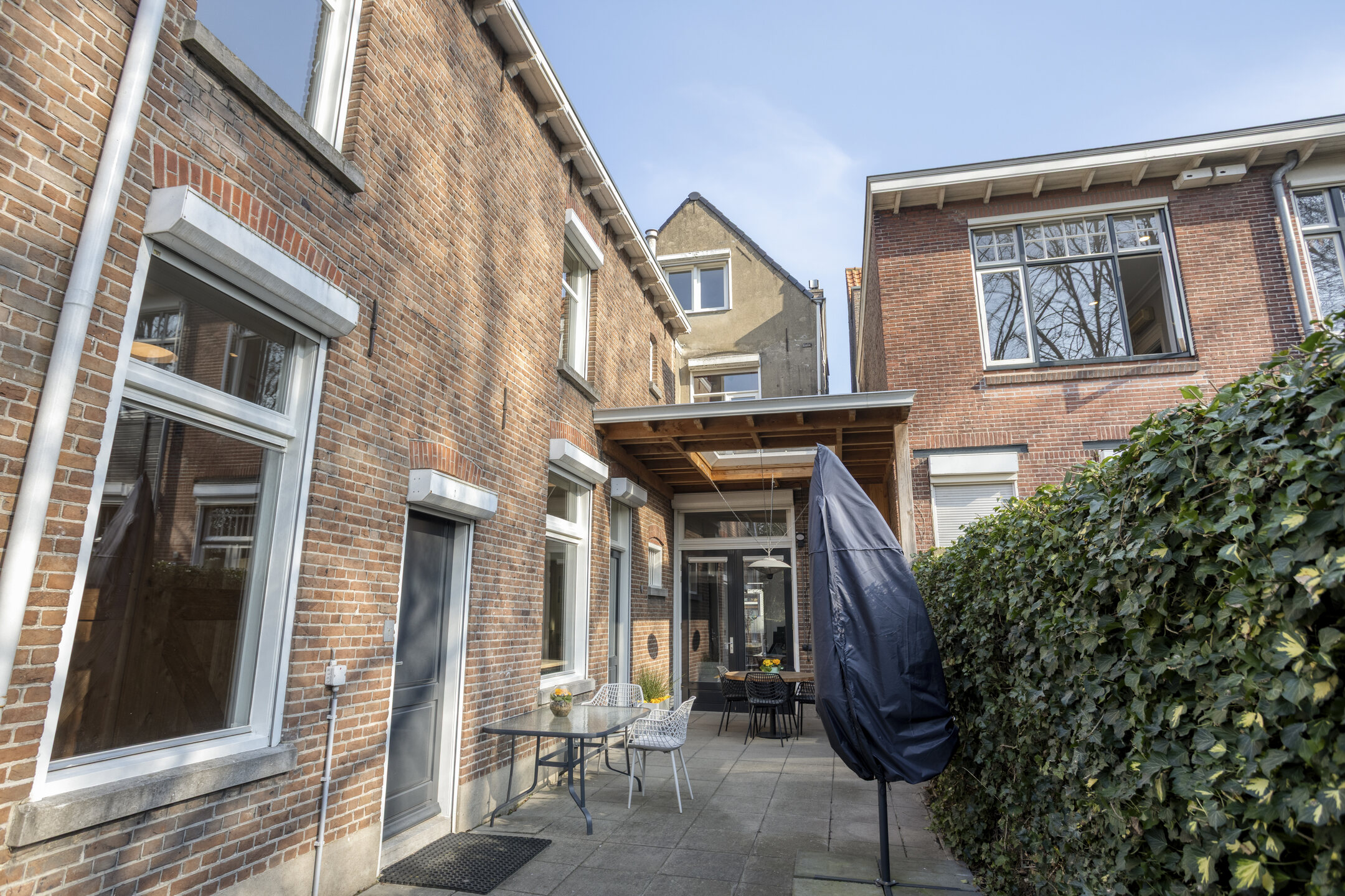 De woning beschikt over een beschutte achtertuin gelegen op het Zuiden, met grote overkapping, terras en berging/tuinhuis. Via een brede poort (elektrisch en op afstand bedienbaar) aan de achterzijde (Burgemeester Prinsensingel) is er toegang tot het perceel met parkeermogelijkheid voor auto’s op eigen terrein. De achtertuin beschikt tevens over een elektrisch oplaadpunt. Daarnaast is er een praktische zijgang naast de woning.