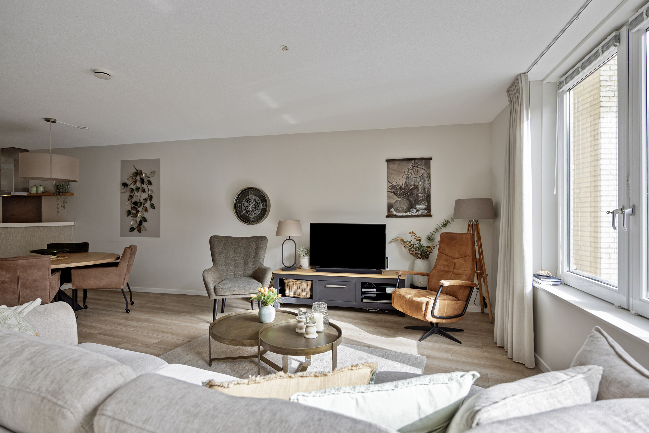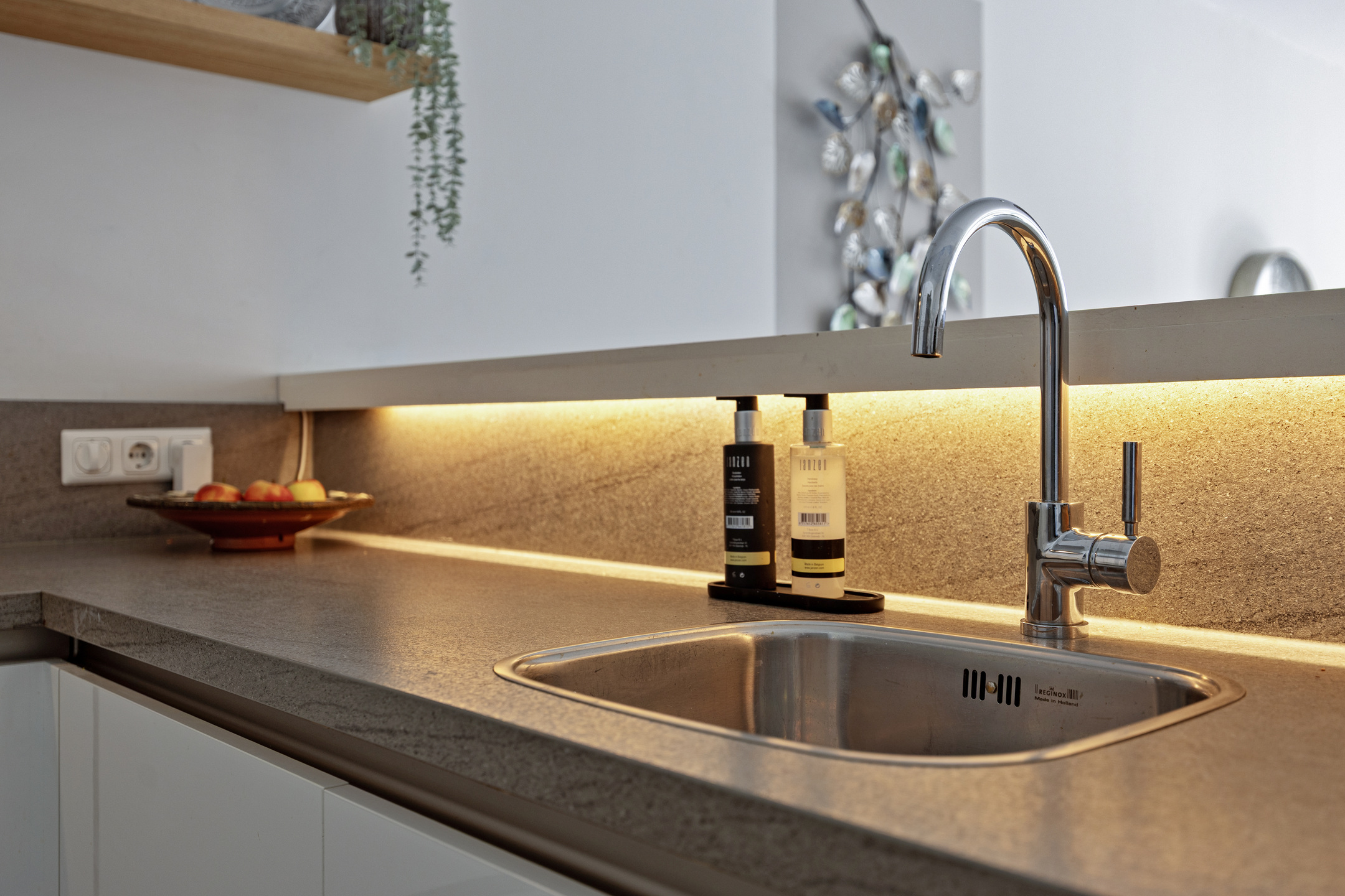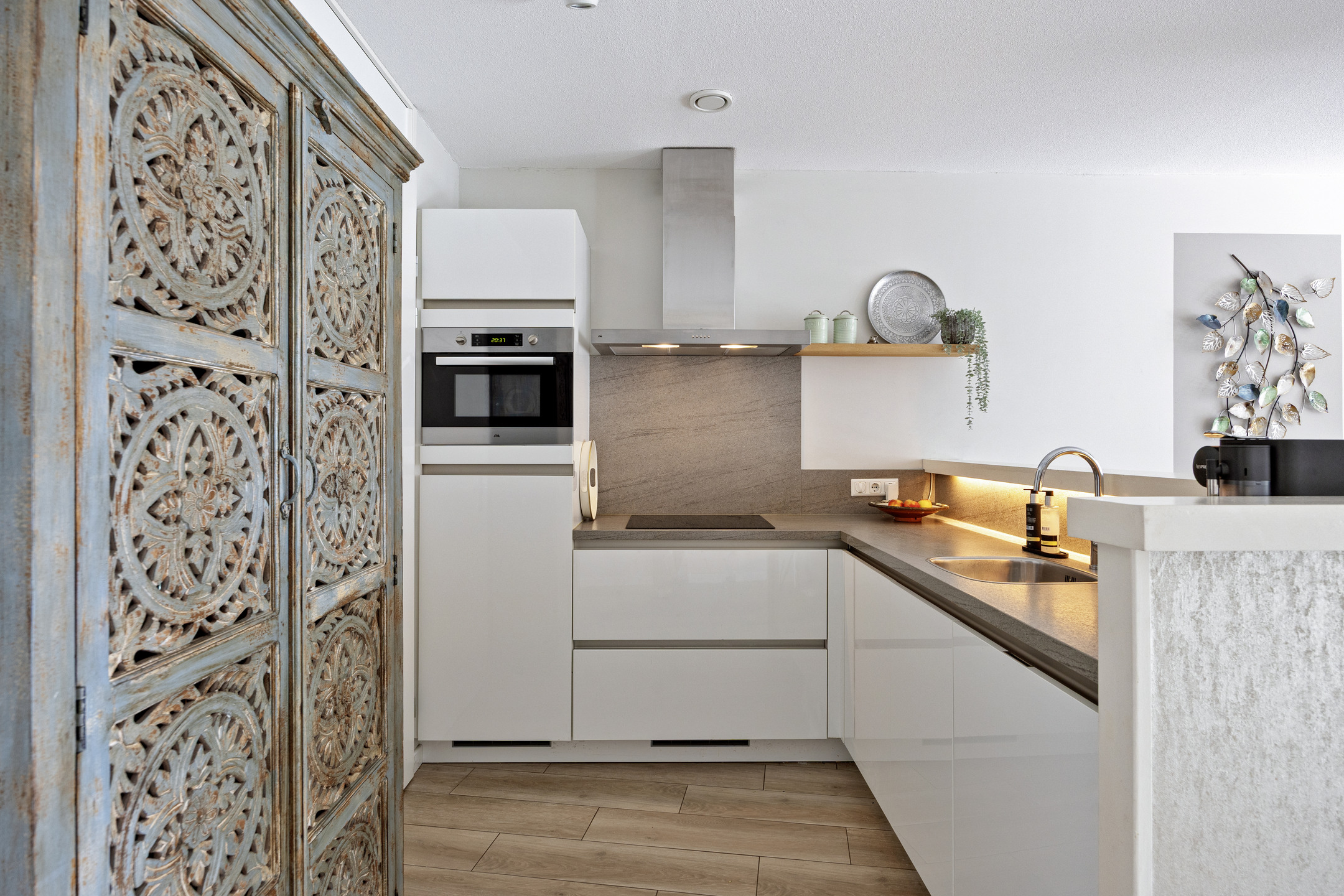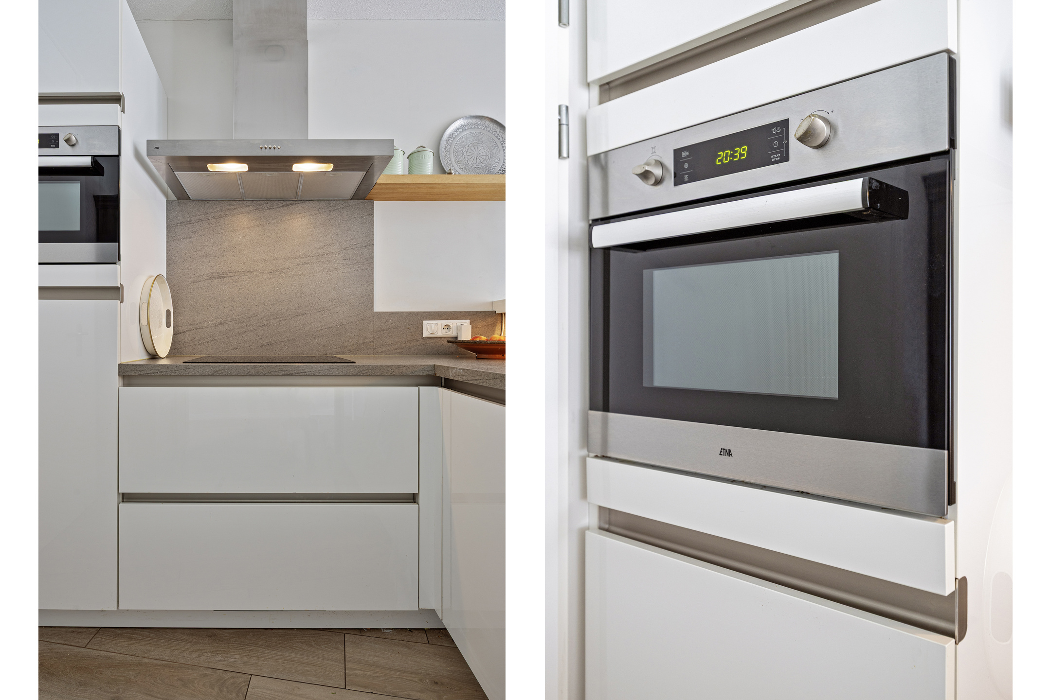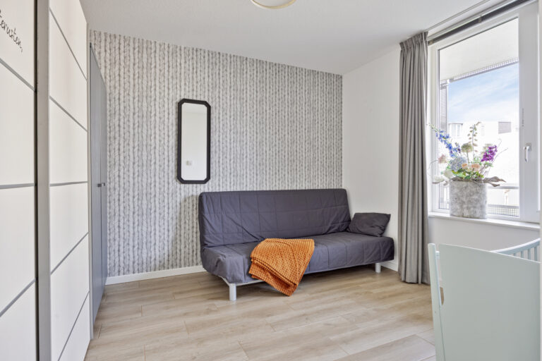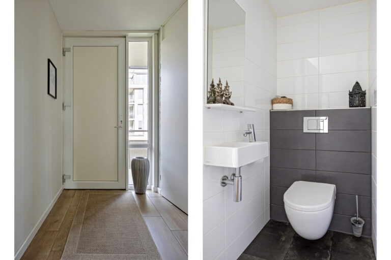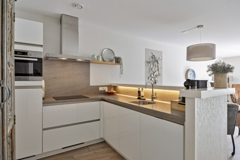 U betreedt het appartement via de centrale hal met brievenbussen, intercom en videosysteem, met toegang via trap of lift. Bij binnenkomst vindt u de hal met modern toilet en toegang tot de tweede slaapkamer (ca. 12 m²). De lichte woonkamer met aluminium schuifpui naar het balkon is, samen met de open keuken, ca. 38 m² groot. De L-vormige keuken is modern ingericht en uitgerust met koelkast (2024), afzuigkap, vaatwasser (2025), inductiekookplaat en combi-oven.