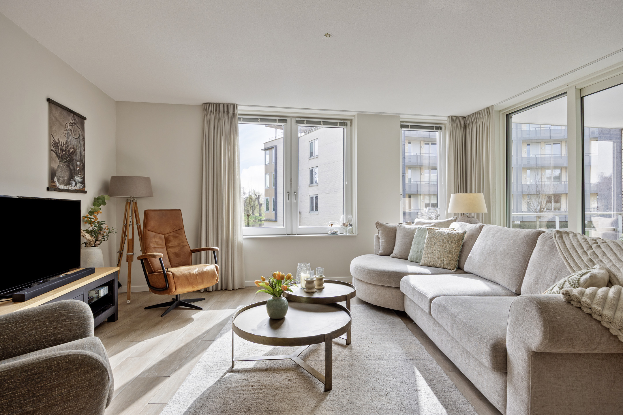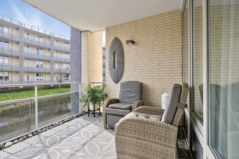 Het balkon is vrij gelegen, biedt veel privacy en een prachtig uitzicht over het water. Het gehele appartement is voorzien van een houtlook plavuizenvloer met comfortabele vloerverwarming. Energielabel A en volledig gasloos. Servicekosten ca. € 190 per maand (inclusief parkeerplaats).