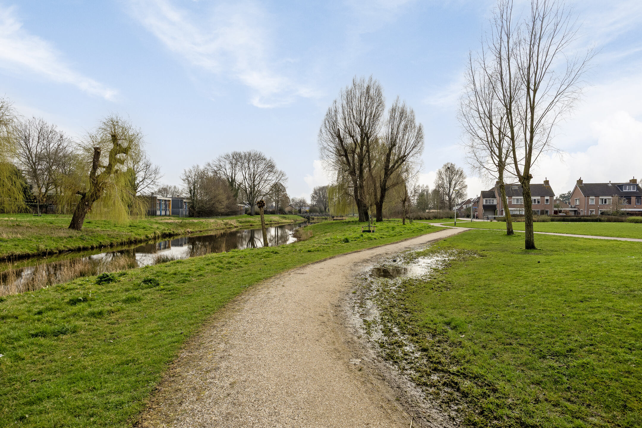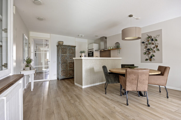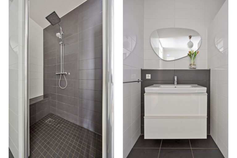 Vanuit de keuken bereikt u de technische ruimte/berging. Deze is voorzien van een aansluiting voor wasmachine en droger, de WTW-installatie en de installatie t.b.v. de WKO (Warmte Koude Opslag Installatie). De hoofdslaapkamer (ca. 14 m²) is bereikbaar vanuit de woonkamer en geeft toegang tot de moderne badkamer met inloopdouche, wastafelmeubel met spiegelverwarming en tweede toilet.