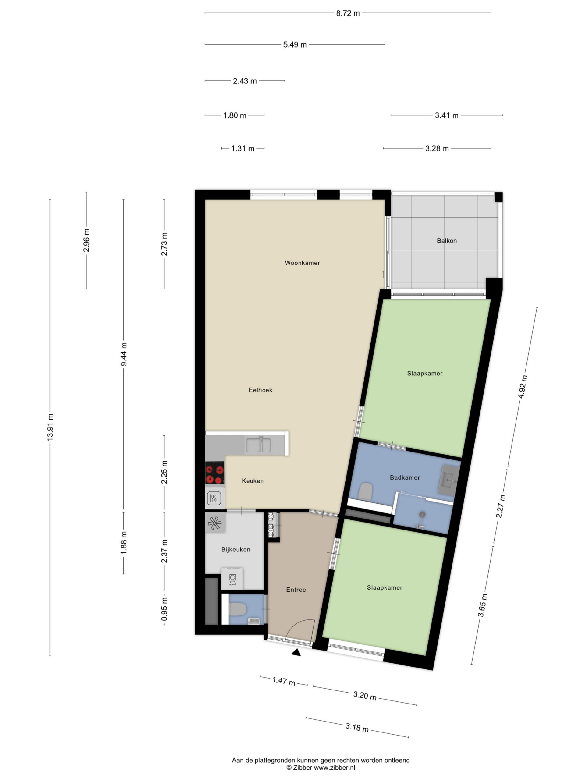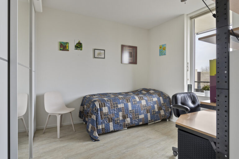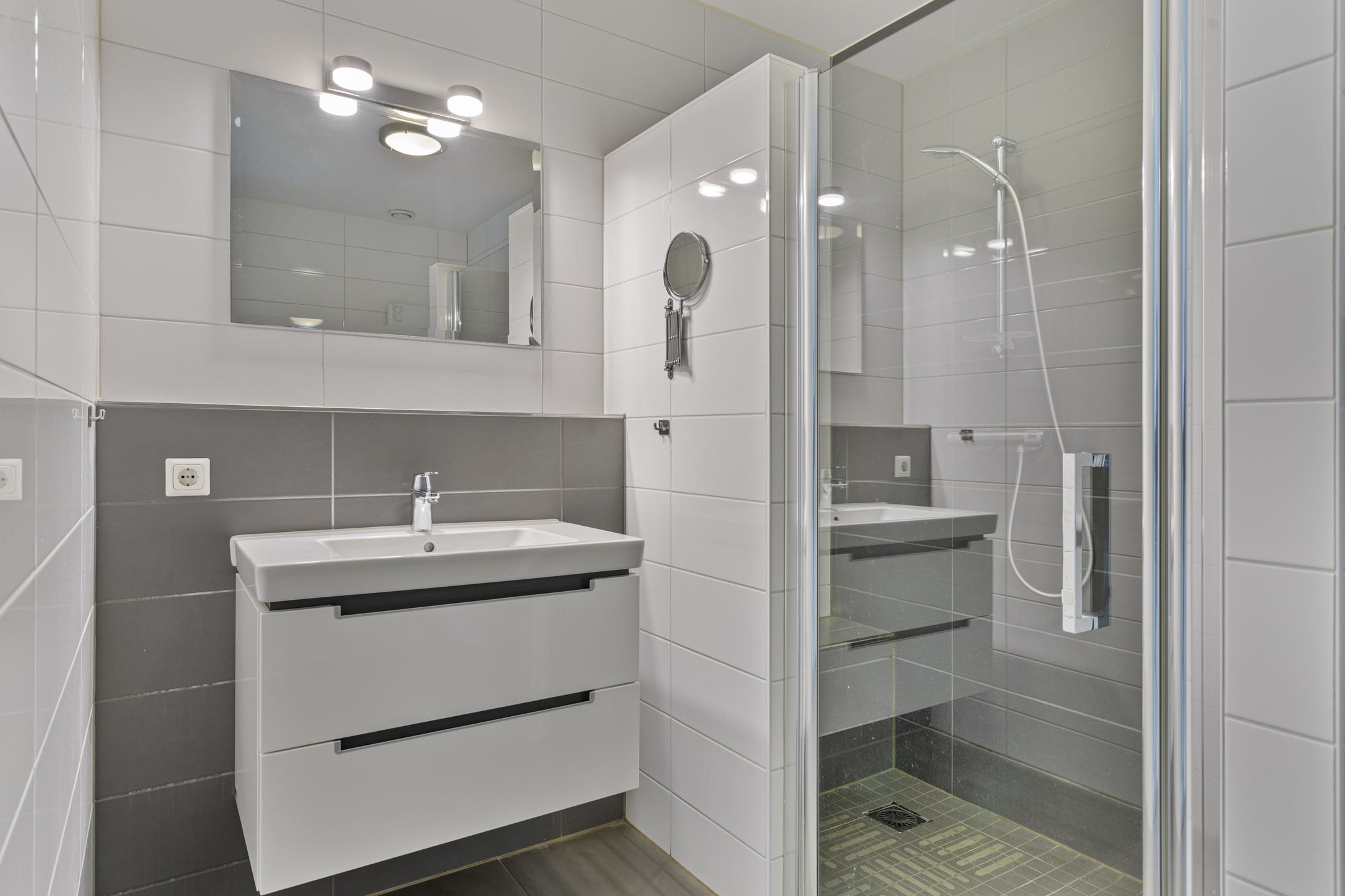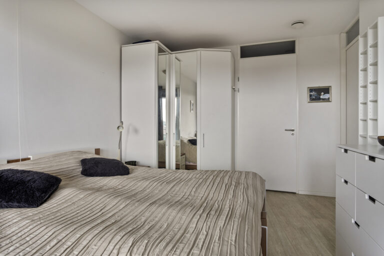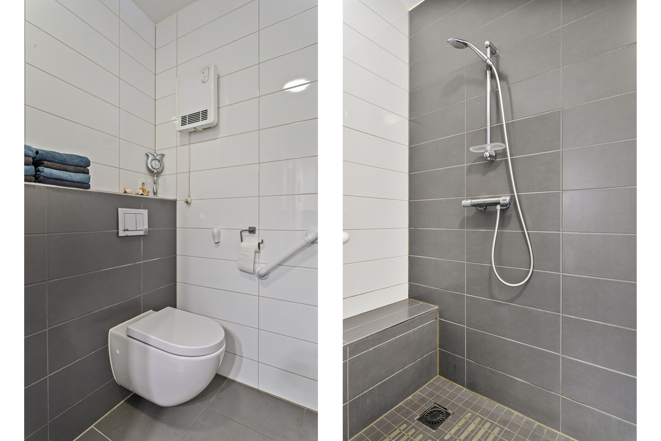 Het appartement beschikt over twee slaapkamers met een oppervlakte van ca. 12 m² en 14 m², waarvan de royale hoofdslaapkamer directe toegang biedt tot de luxe, moderne badkamer met inloopdouche, wastafel en tweede toilet. Daarnaast is er een separate toiletruimte in de hal. In de technische ruimte bevinden zich de aansluitingen voor wasmachine en droger, evenals de WTW-unit en de WKO-installatie.