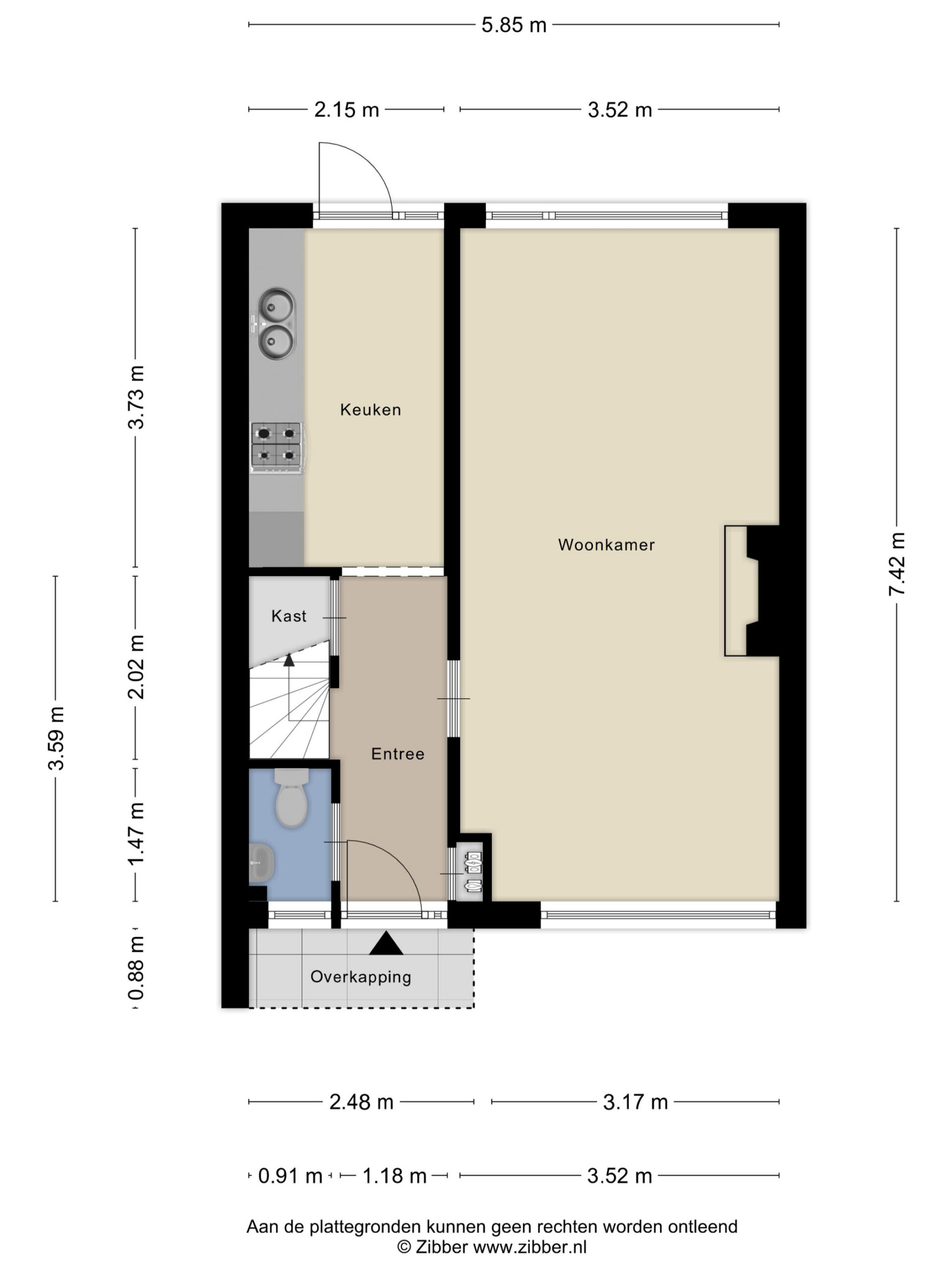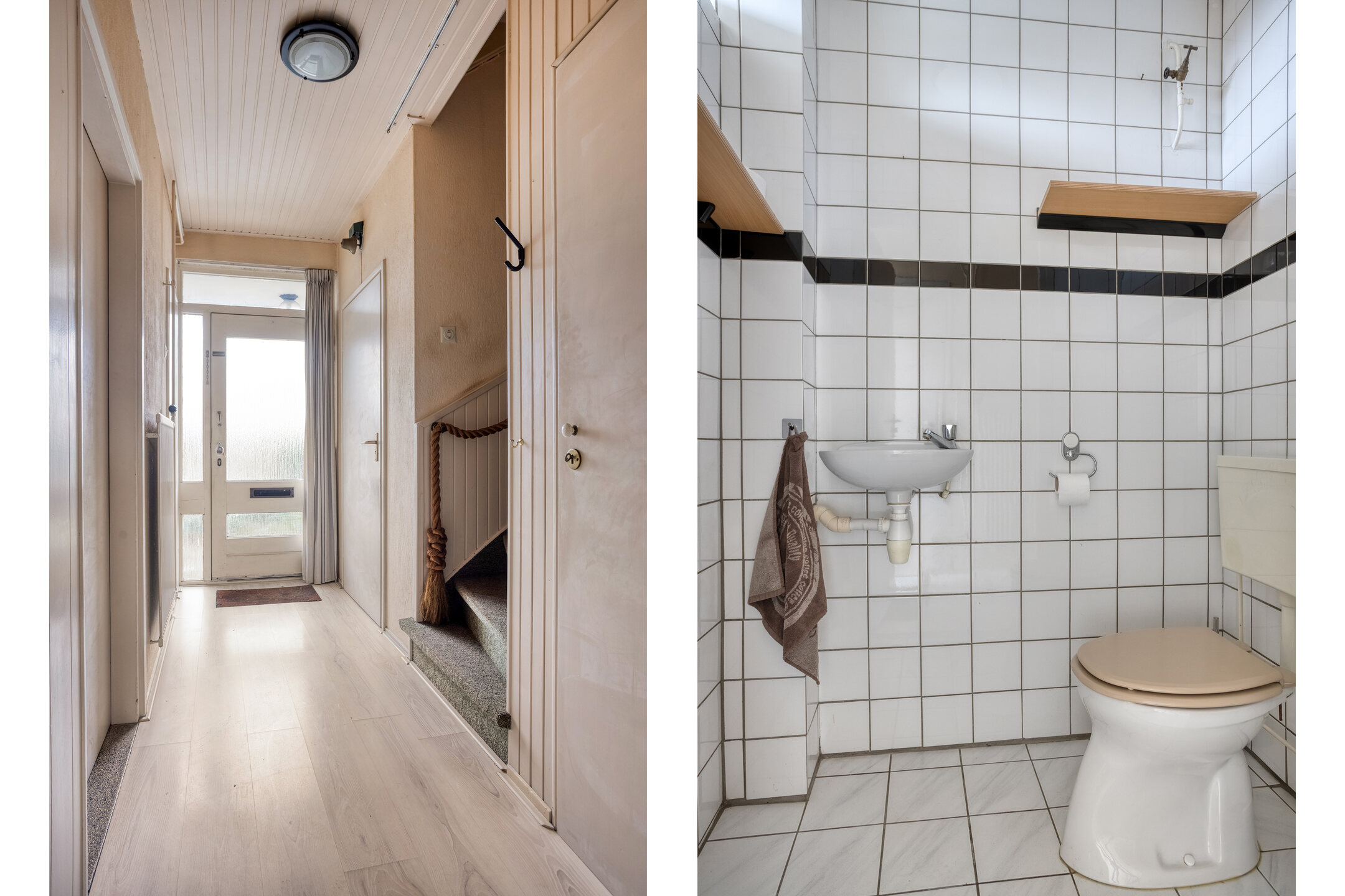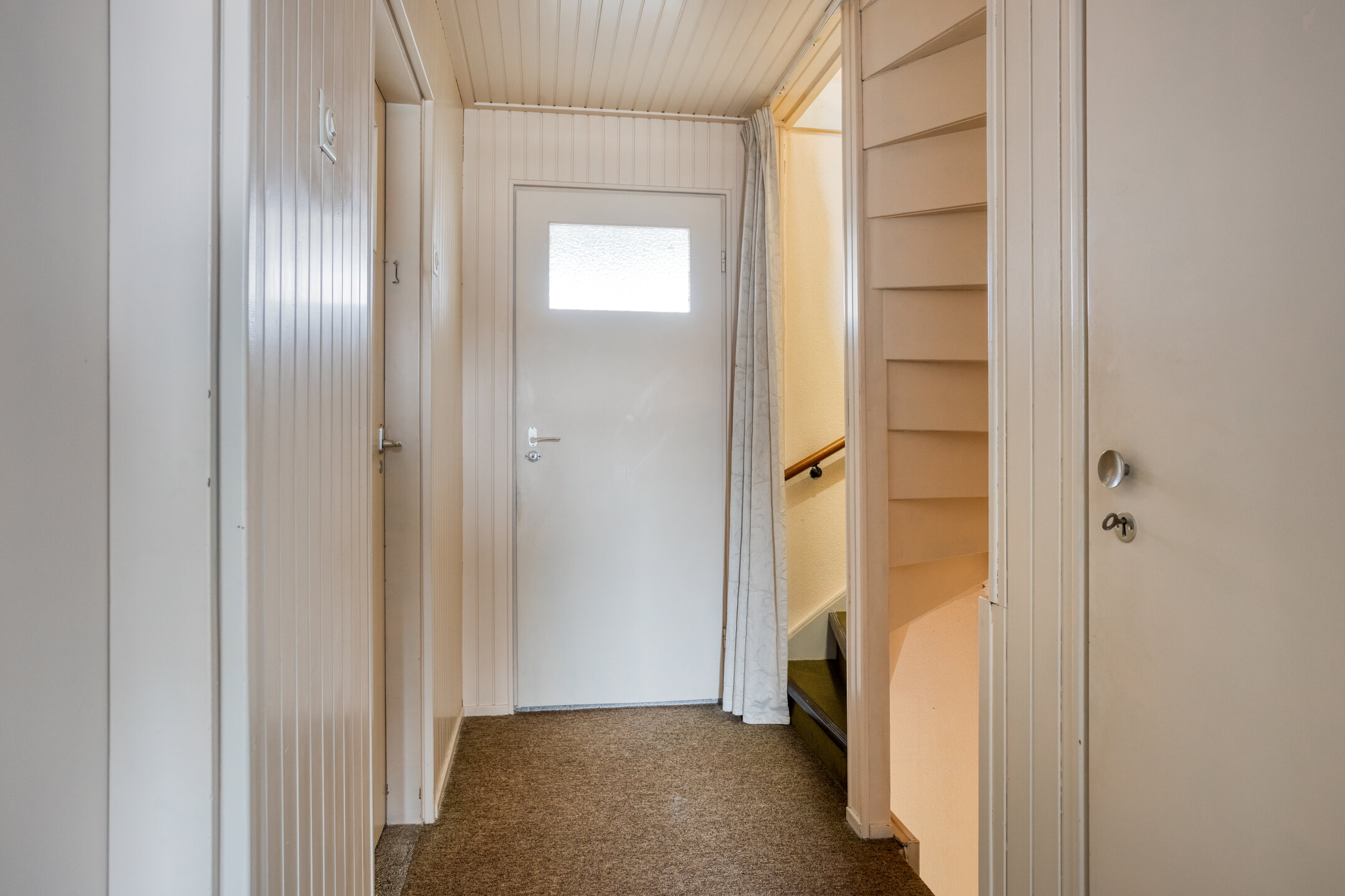 Via de entree kom je in de hal met trapopgang en een vaste kast met meterkast. Vanuit hier heb je toegang tot de keuken, het toilet en de woonkamer.