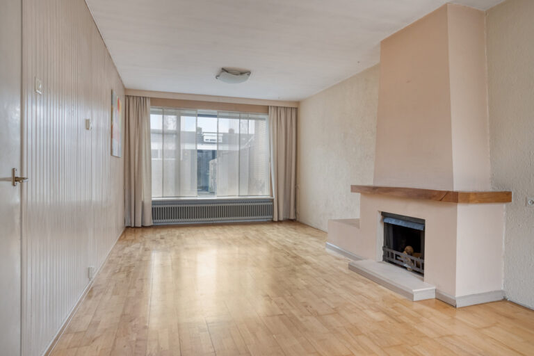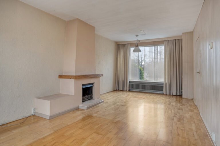 De doorzon woonkamer van ongeveer 26 m² is licht en kijkt uit op de zonnige achtertuin. De woonkamer beschikt over een schouw met open haardpartij en een parketvloer. Aansluitend bevindt zich de gesloten keuken, ingericht met een functionele eenvoudige opstelling met diverse inbouwapparatuur.