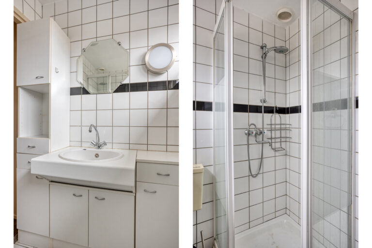 De badkamer is volledig betegeld en voorzien van een douche, wastafel en 2e toilet.
