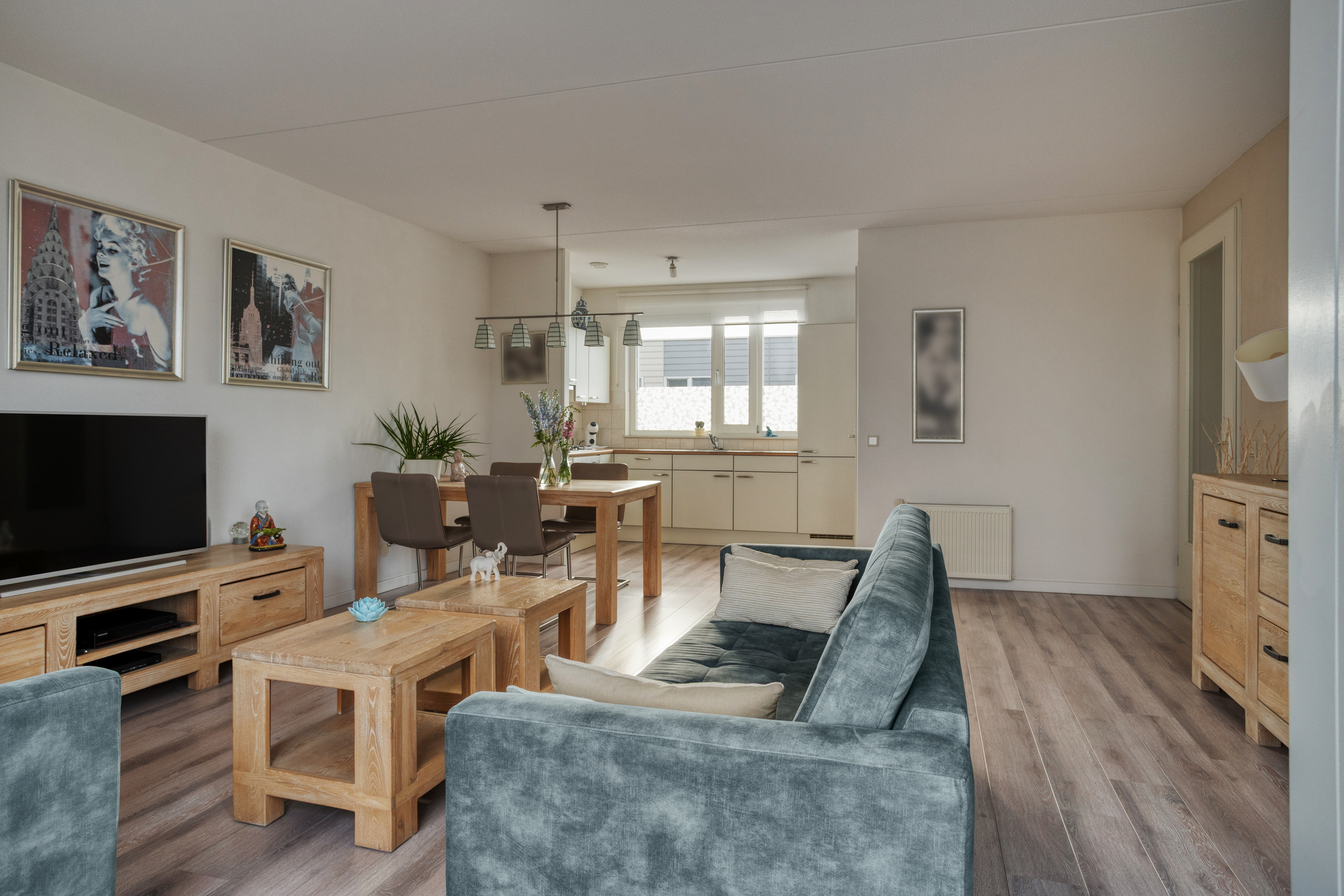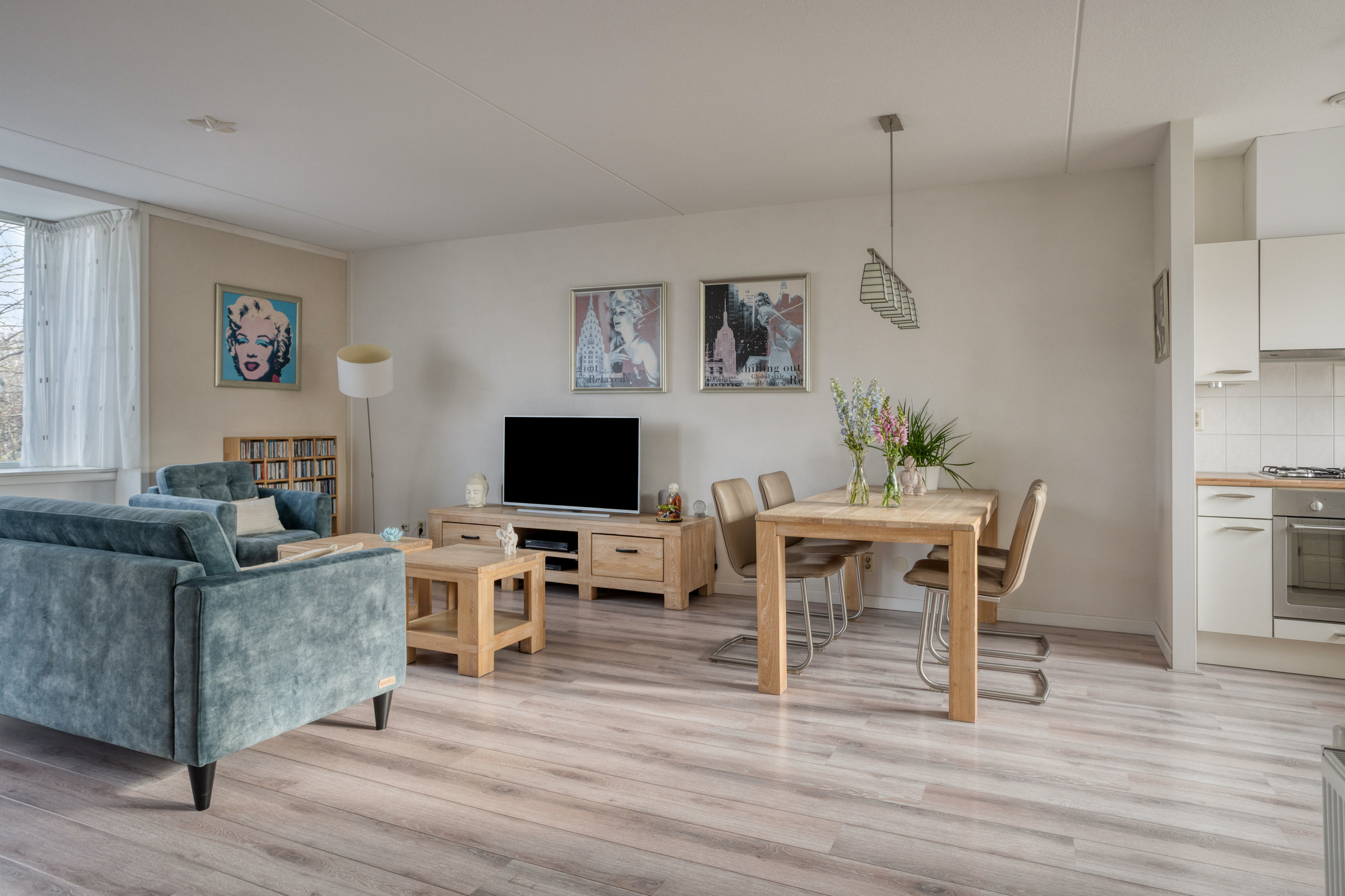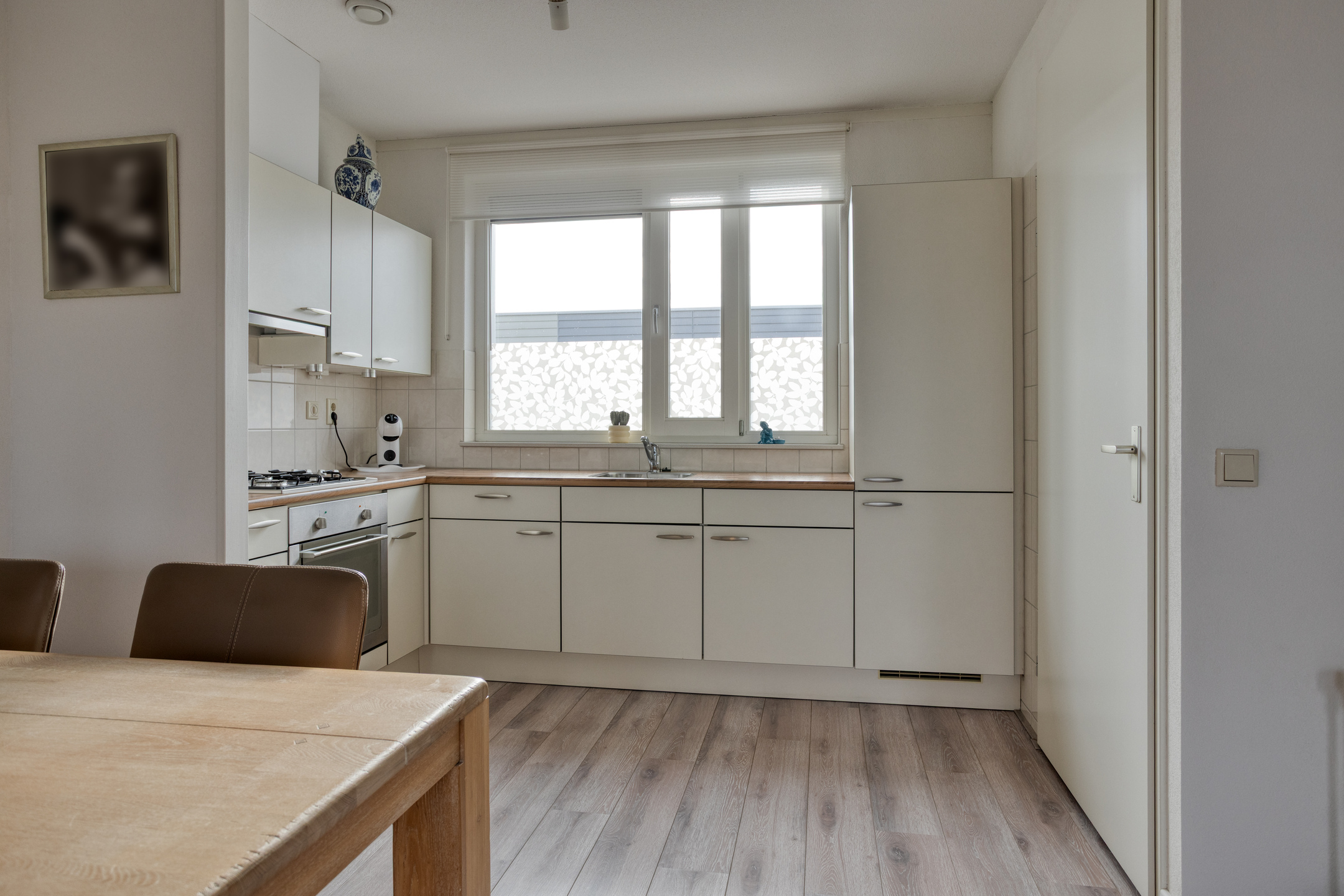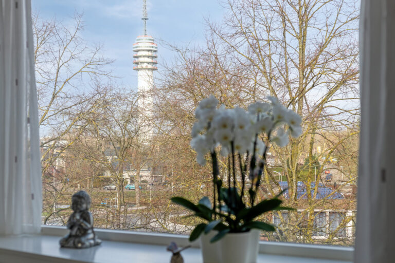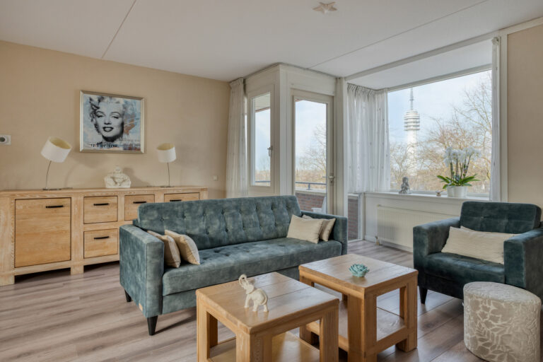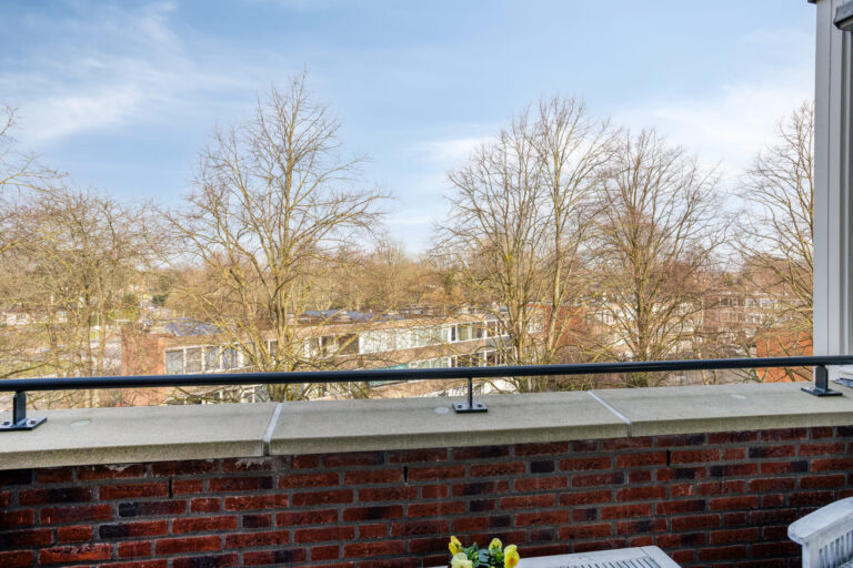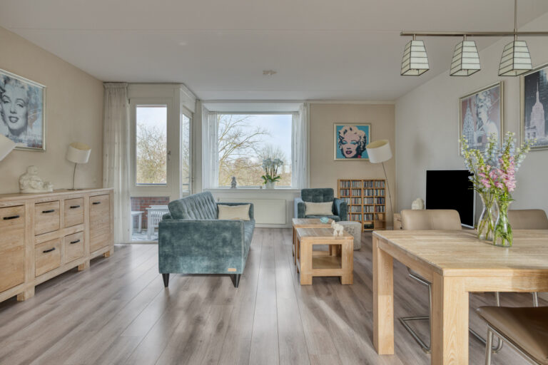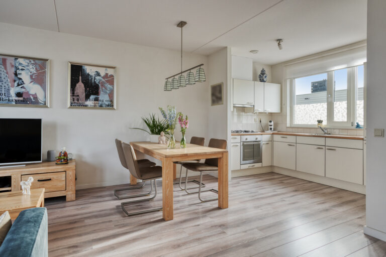 De lichte woonkamer met open keuken (samen ca. 36 m²) vormt het hart van het appartement en biedt toegang tot het ruime, vrij gelegen balkon (ca. 6 m²) met leuk uitzicht. De woonkamer is voorzien van een moderne laminaatvloer en stucwerk wanden.