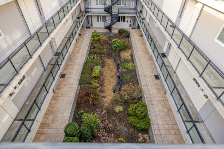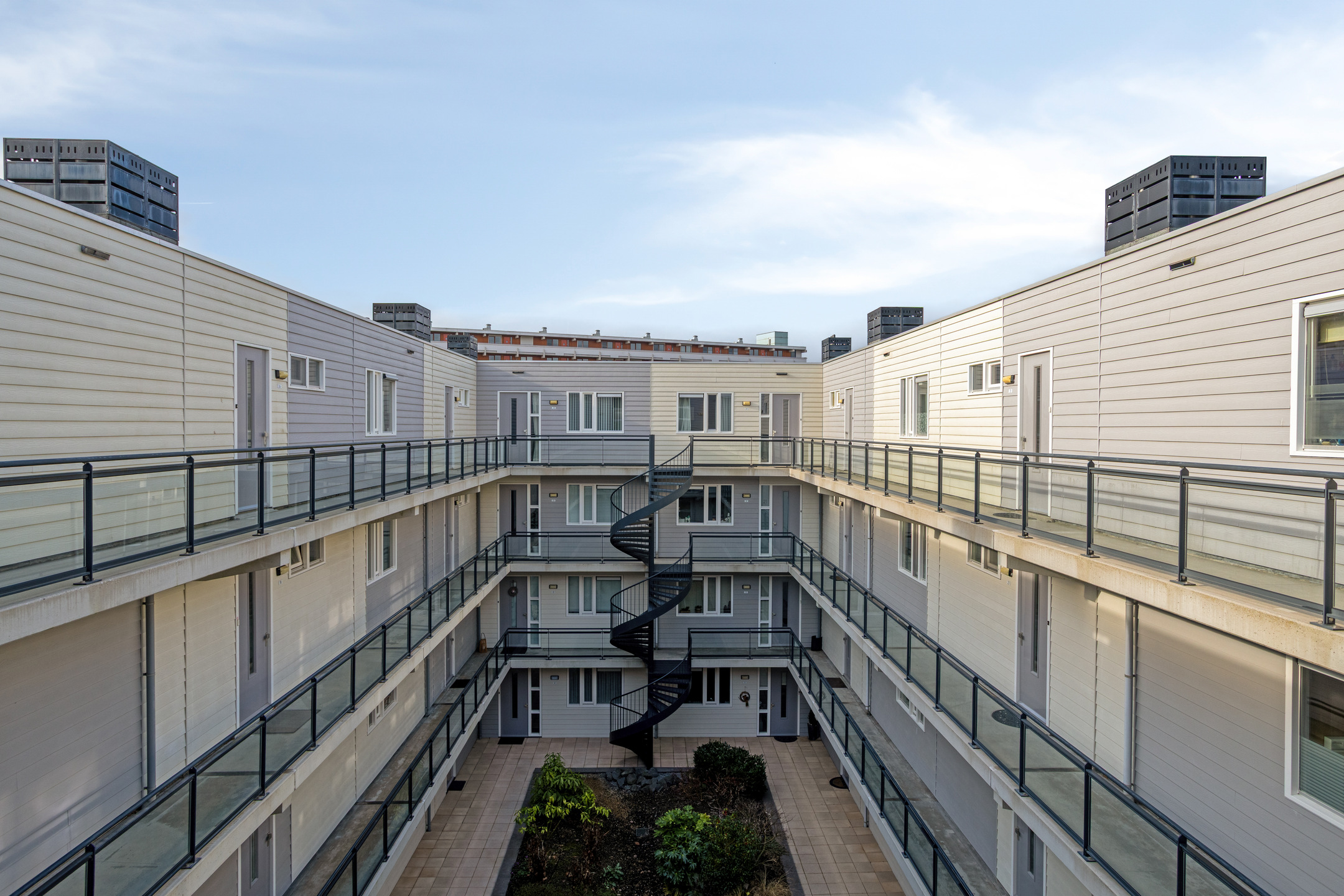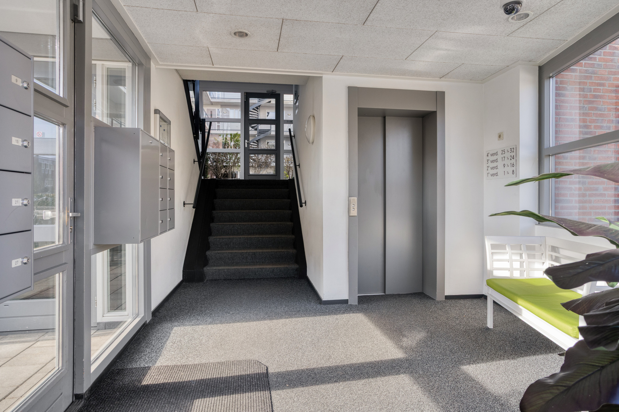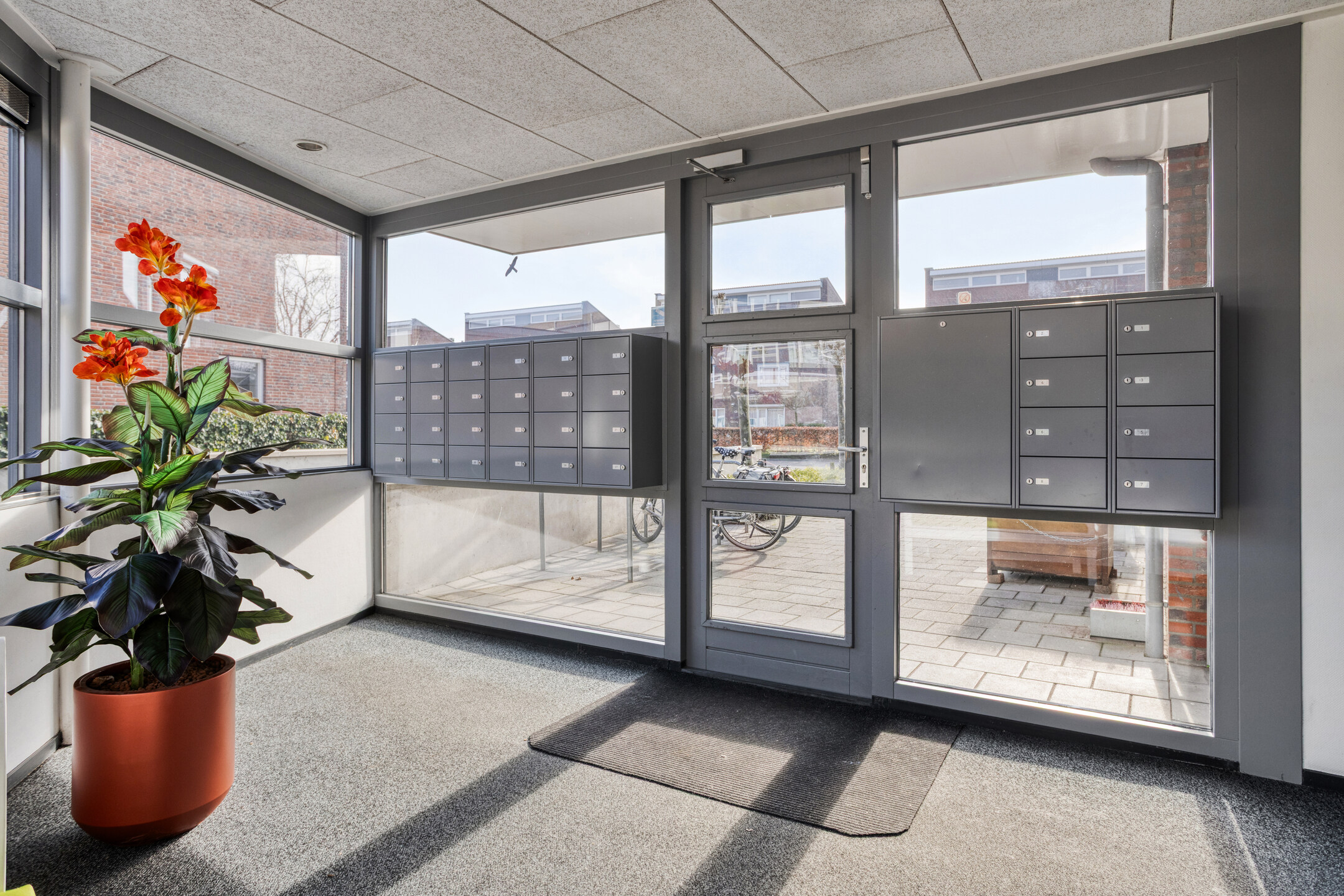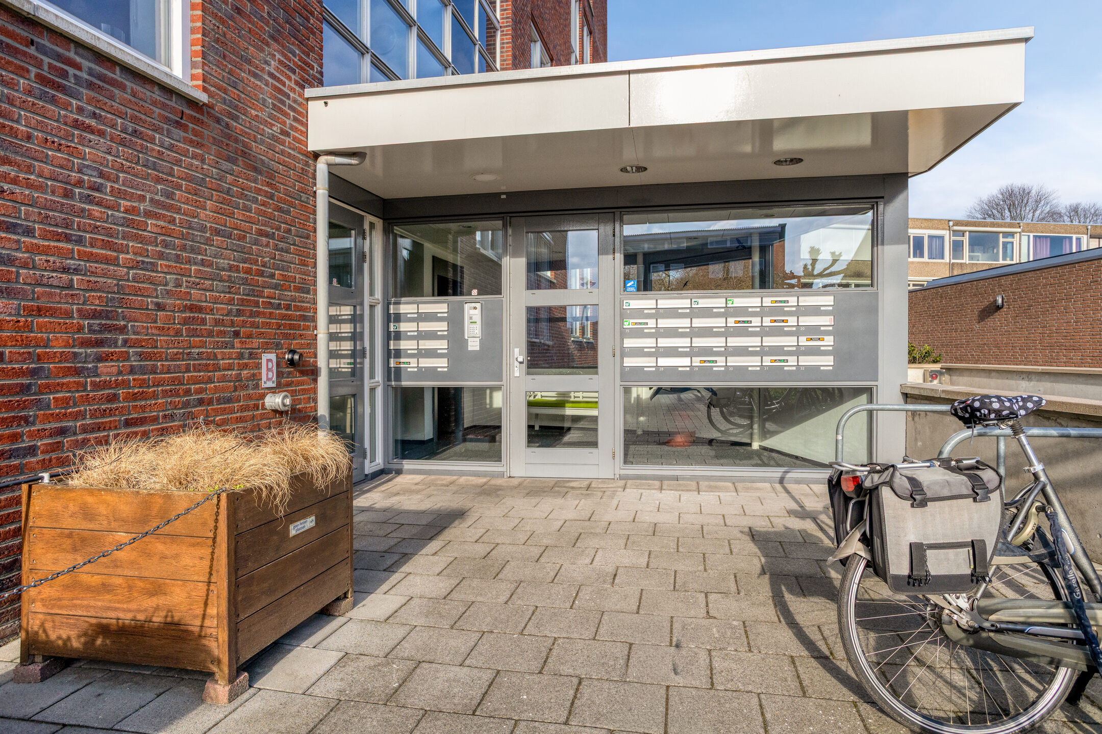 Representatieve centrale entree met brievenbussen, bellentableau met videofoon, lift en trappenhuis. Vanuit de afgesloten entree is de fraai aangelegde binnentuin bereikbaar via trap of lift. Dit is een heerlijke plek om even te ontspannen.