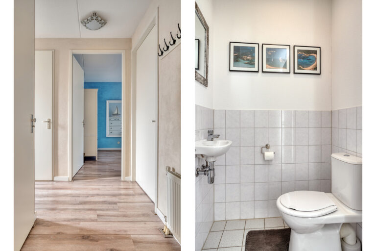 Via de hal/entree met meterkast en toiletruimte zijn alle vertrekken bereikbaar. Het toilet is uitgevoerd in lichte kleurstelling en voorzien van een duoblok en fonteintje.