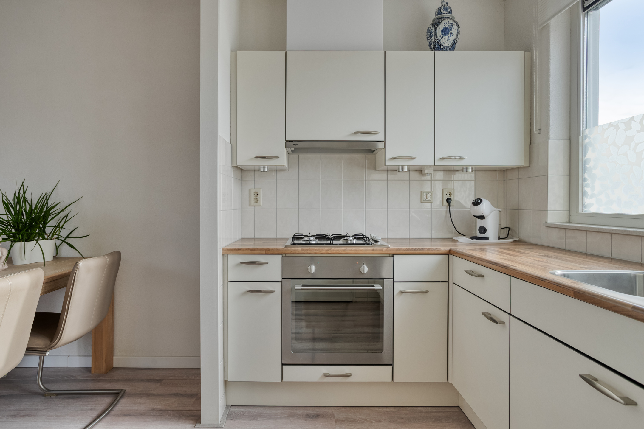 De moderne keuken is voorzien van een L-vormige inrichting voorzien van diverse inbouwapparatuur, waaronder een gaskookplaat, koelkast, oven en afzuigkap.