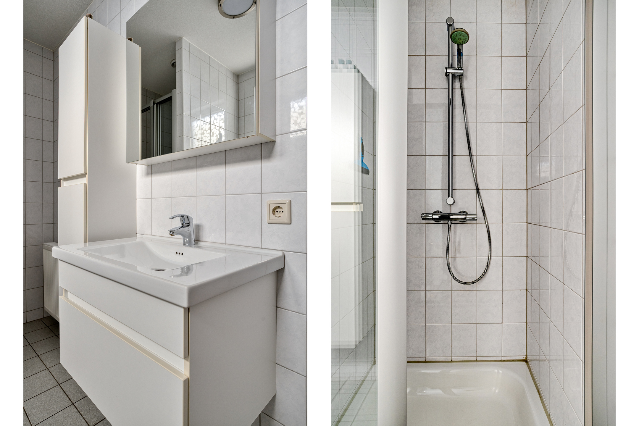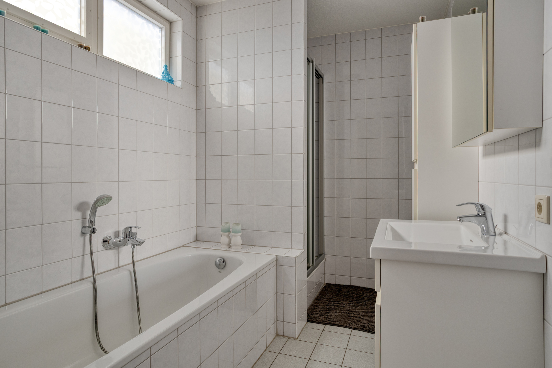 Moderne licht betegelde badkamer met douchecabine, ligbad en vast wastafelmeubel.