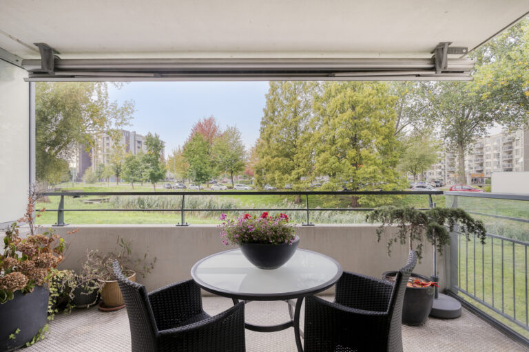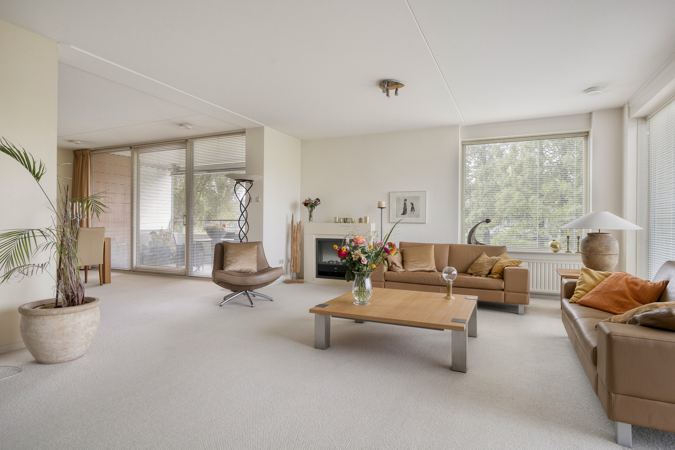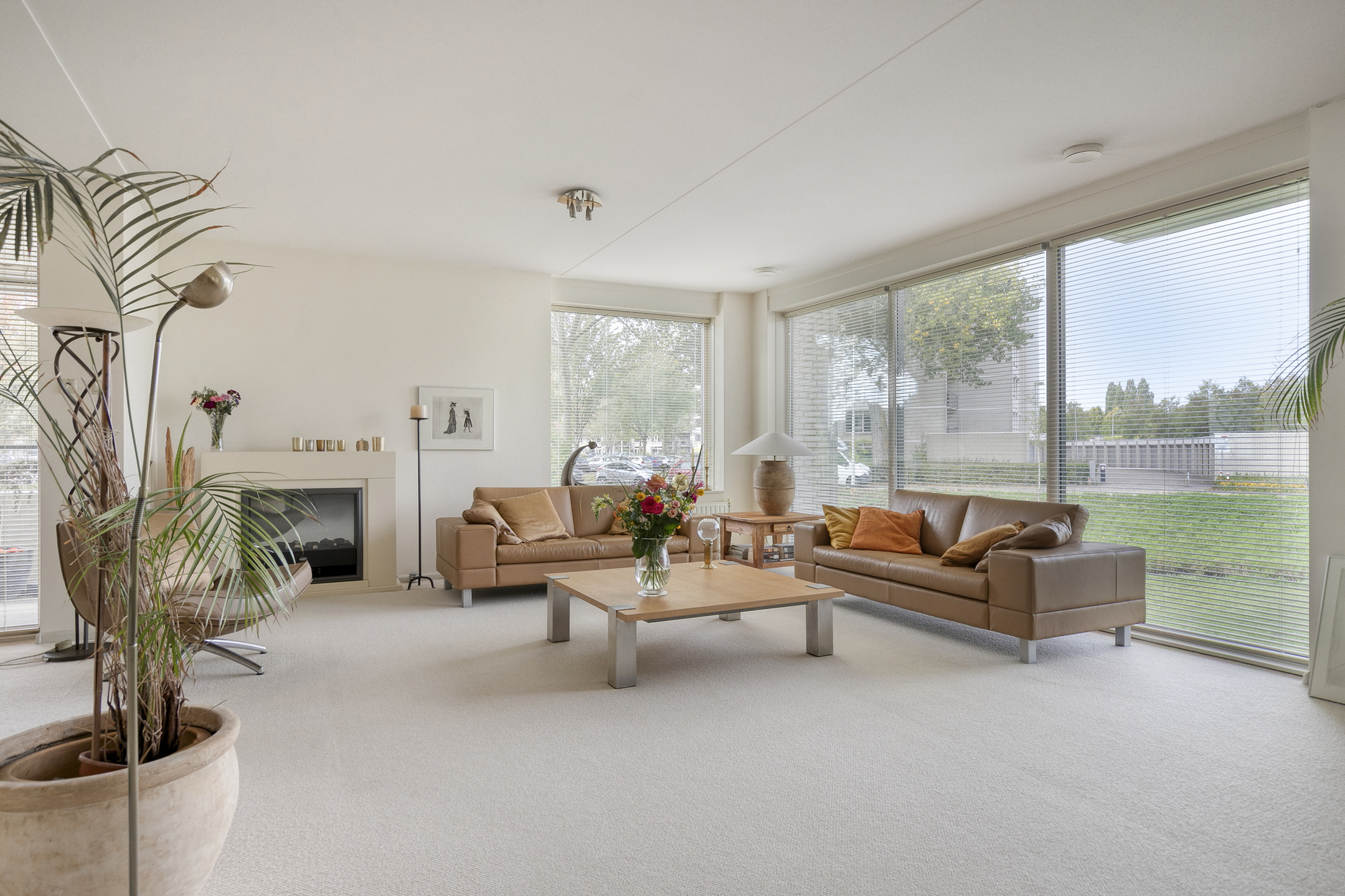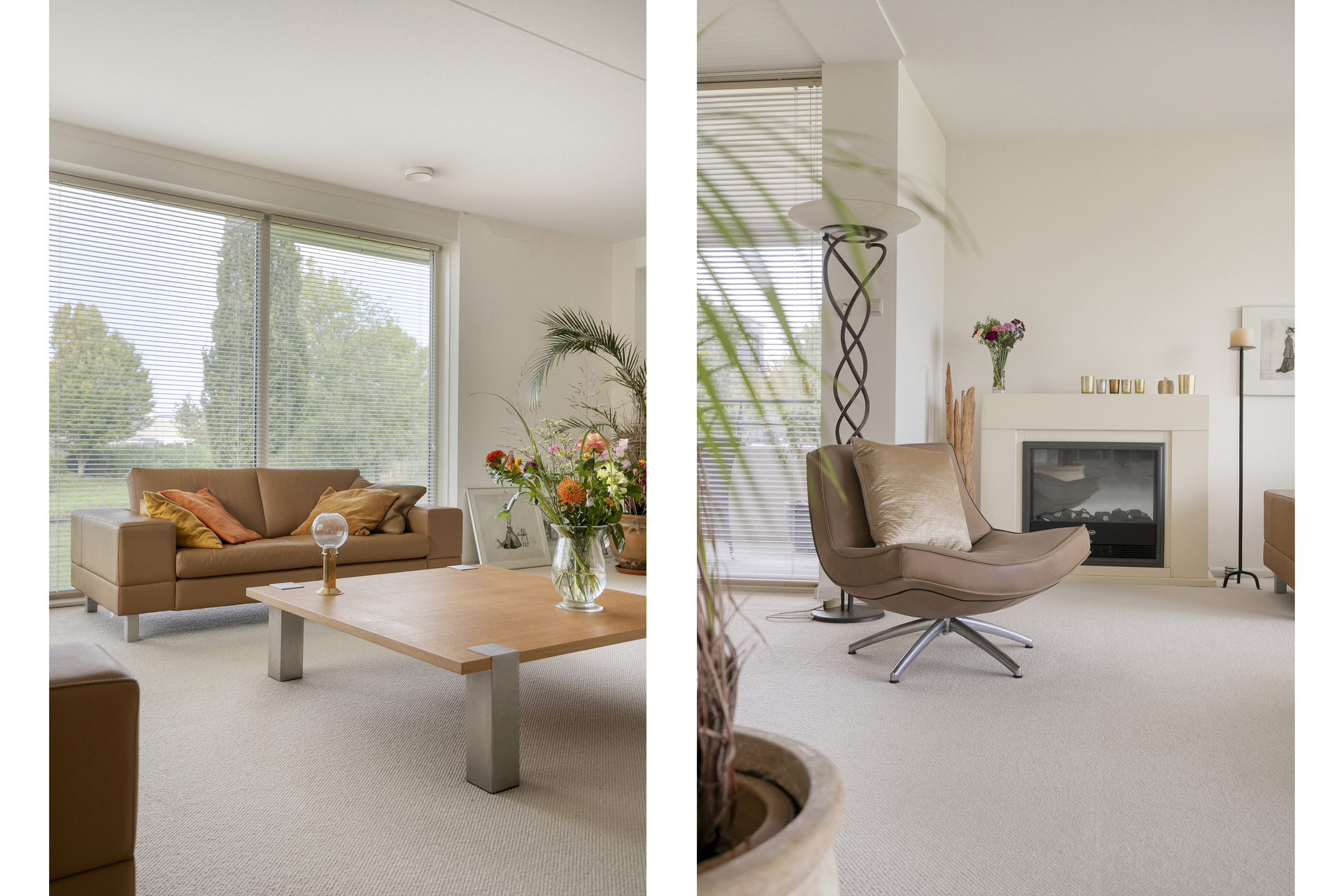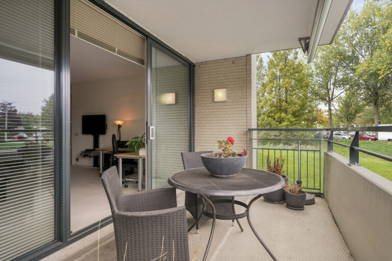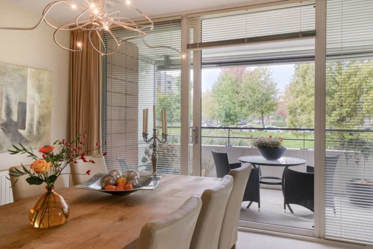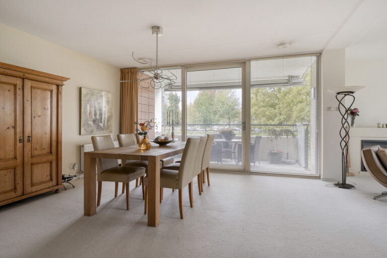 De ruime woonkamer vormt het hart van het appartement. Hier is plaats voor een comfortabele zithoek én een gezellige loungeplek, naast een aparte eetruimte. De grote raampartijen, die van vloer tot plafond reiken, zorgen voor een overvloed aan daglicht en creëren een prettige, open sfeer. Vanuit de eetkamer is er toegang tot het ruime, op het zuiden gelegen balkon, waar je optimaal van de zon kunt genieten.