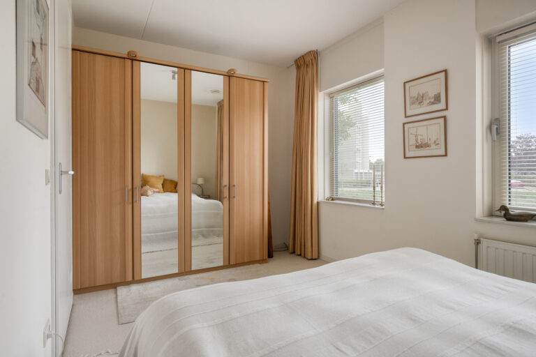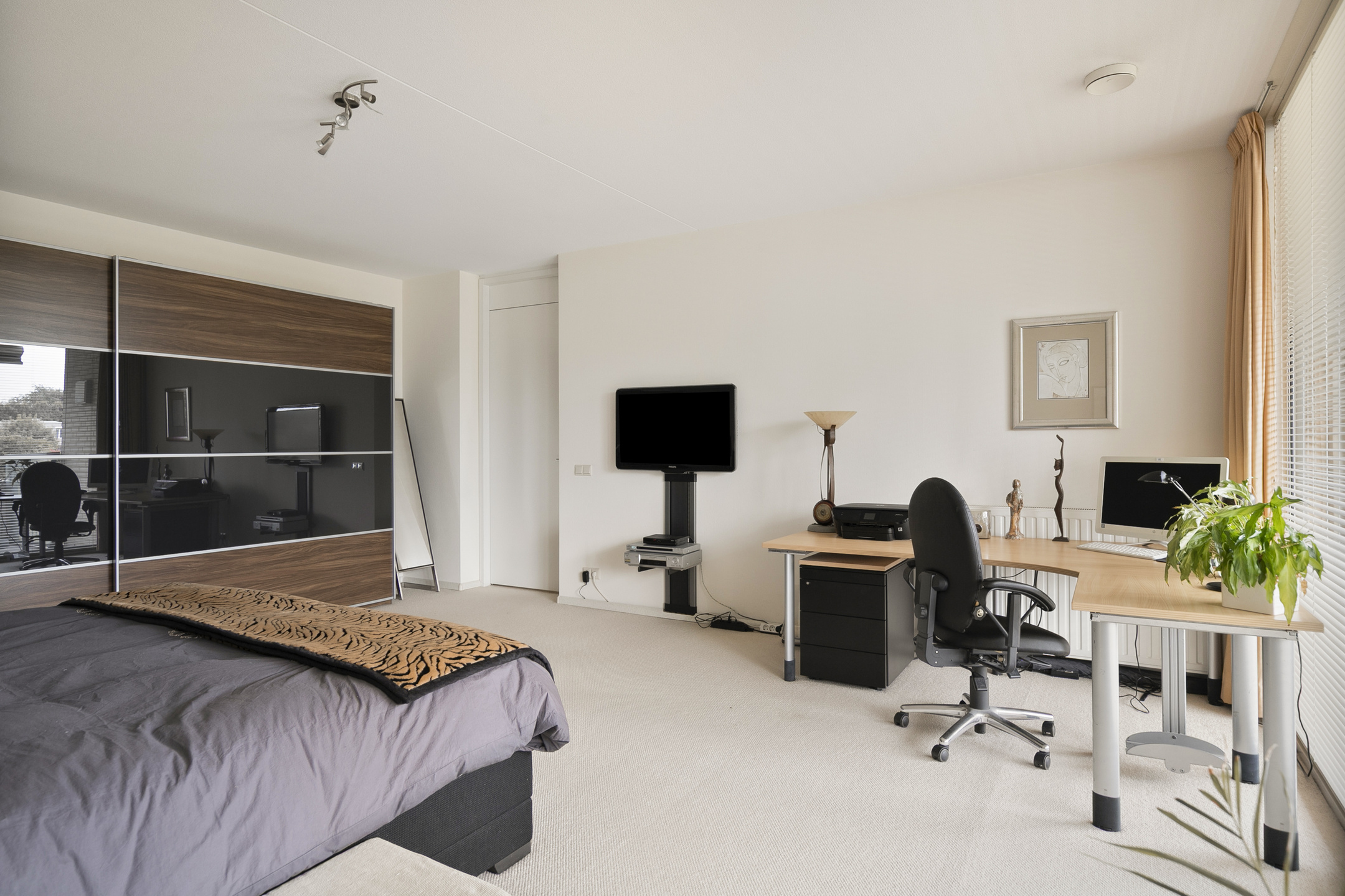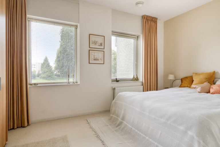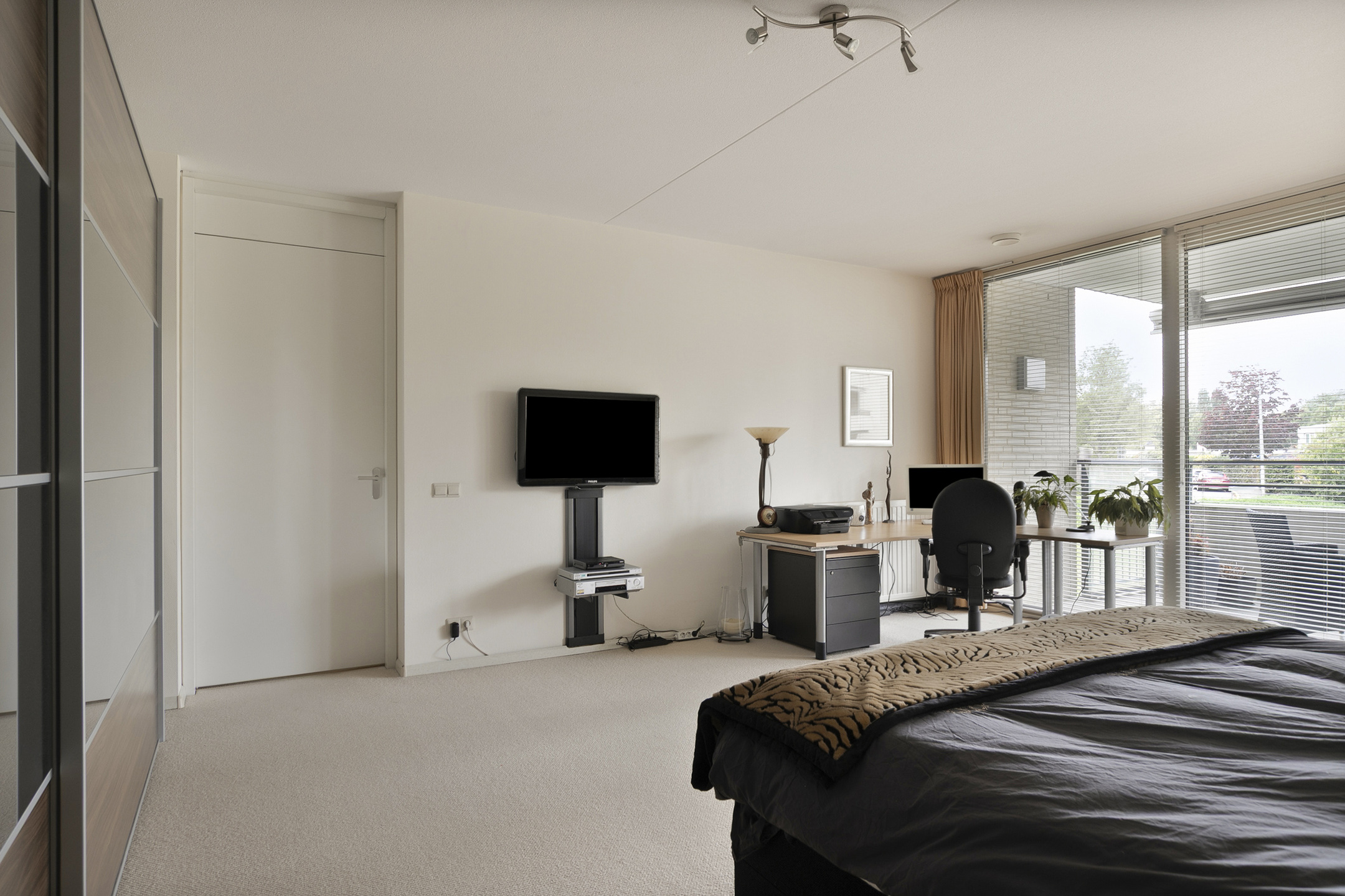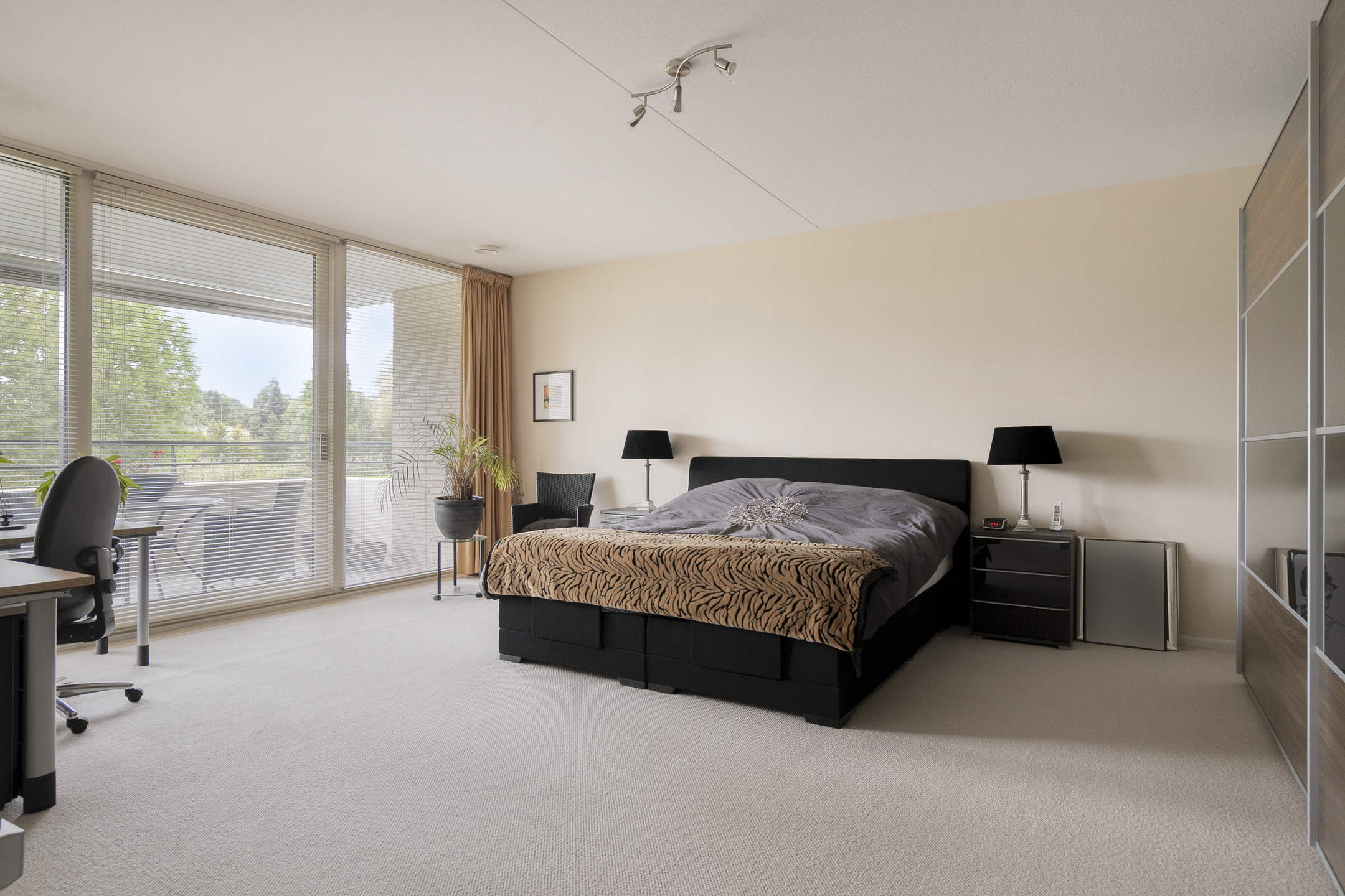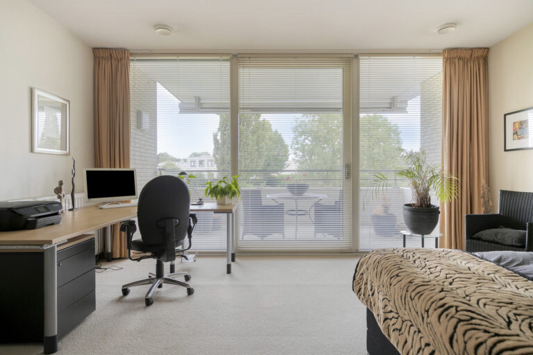 De twee slaapkamers zijn royaal van formaat. De masterbedroom beslaat maar liefst 28 m² en biedt direct toegang tot het tweede balkon, gelegen op het westen. De tweede slaapkamer/werkkamer is eveneens prettig van formaat en meet circa 12 m².