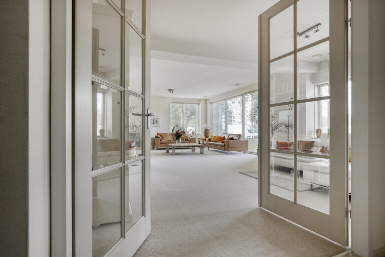 Royale woonkamer met plafondhoge ramen en veel natuurlijk licht.