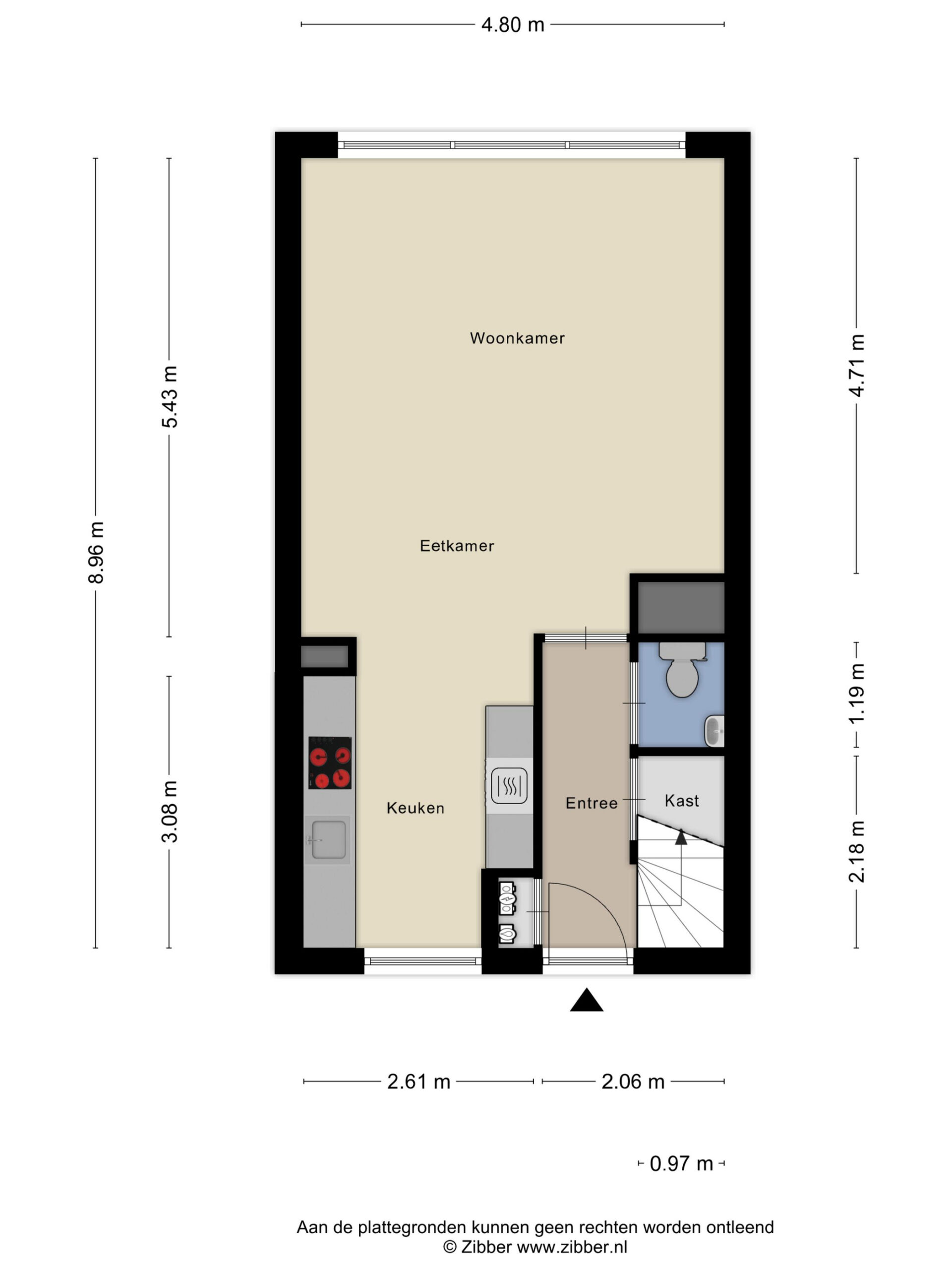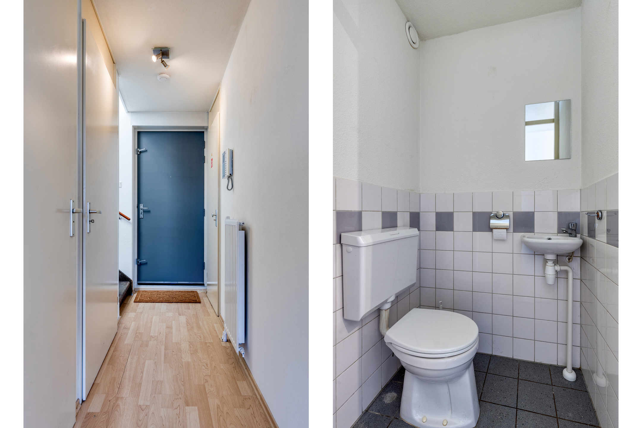 Vanuit is er de trap naar 2e verdieping, toilet, trapkast en woonkamer.
