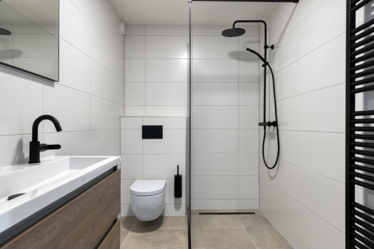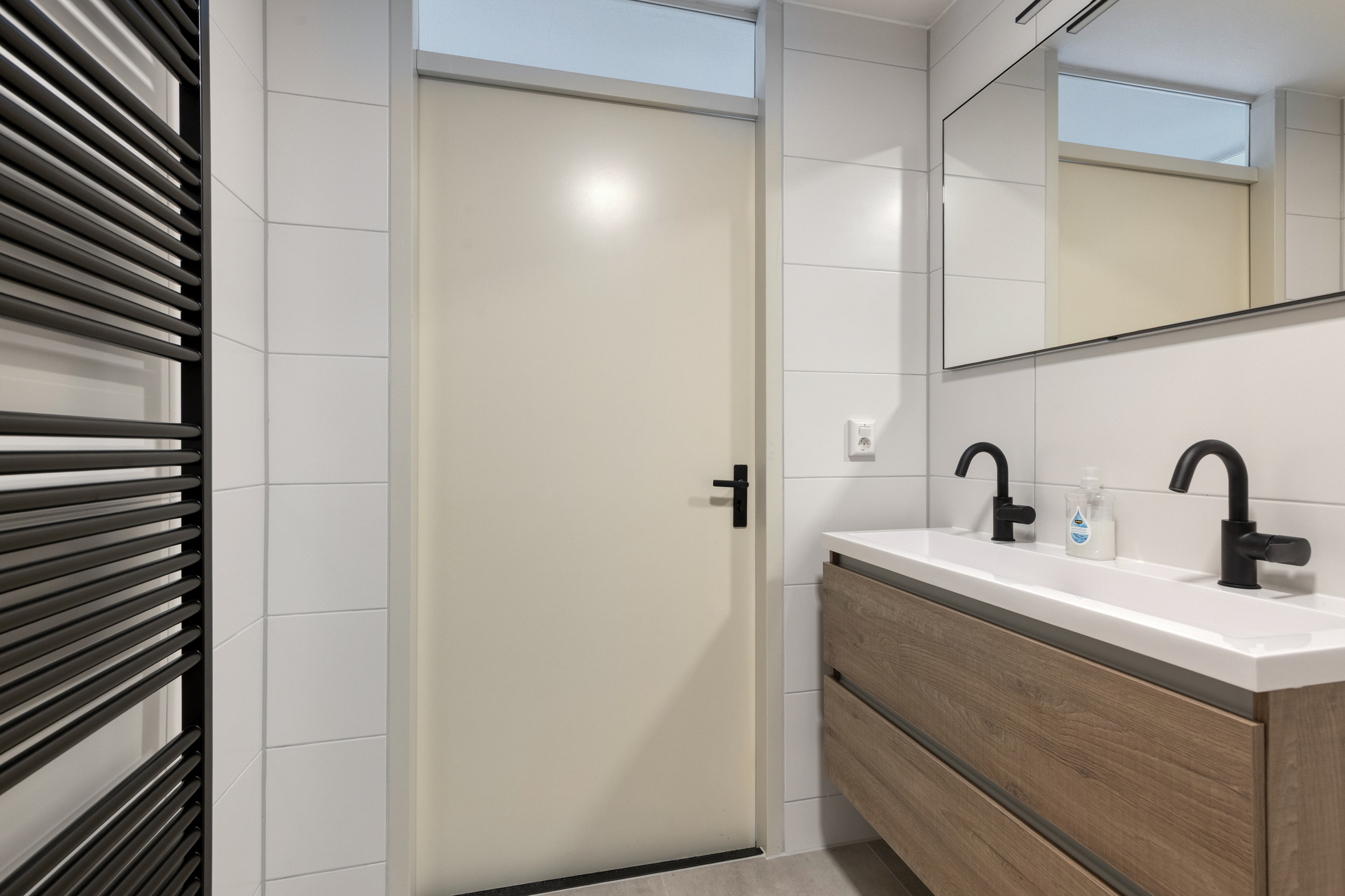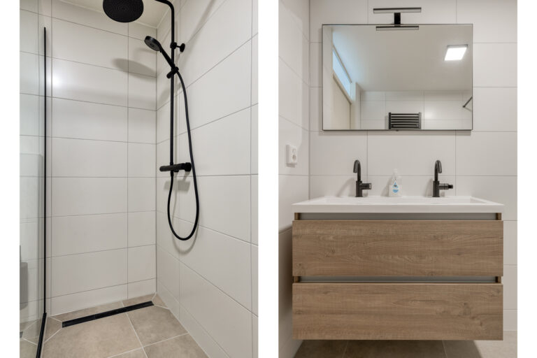 De nieuwe luxe badkamer is voorzien van een inloopdouche met glazen wand, 2e toilet, designradiator en badkamermeubel met twee kranen en een spiegel.