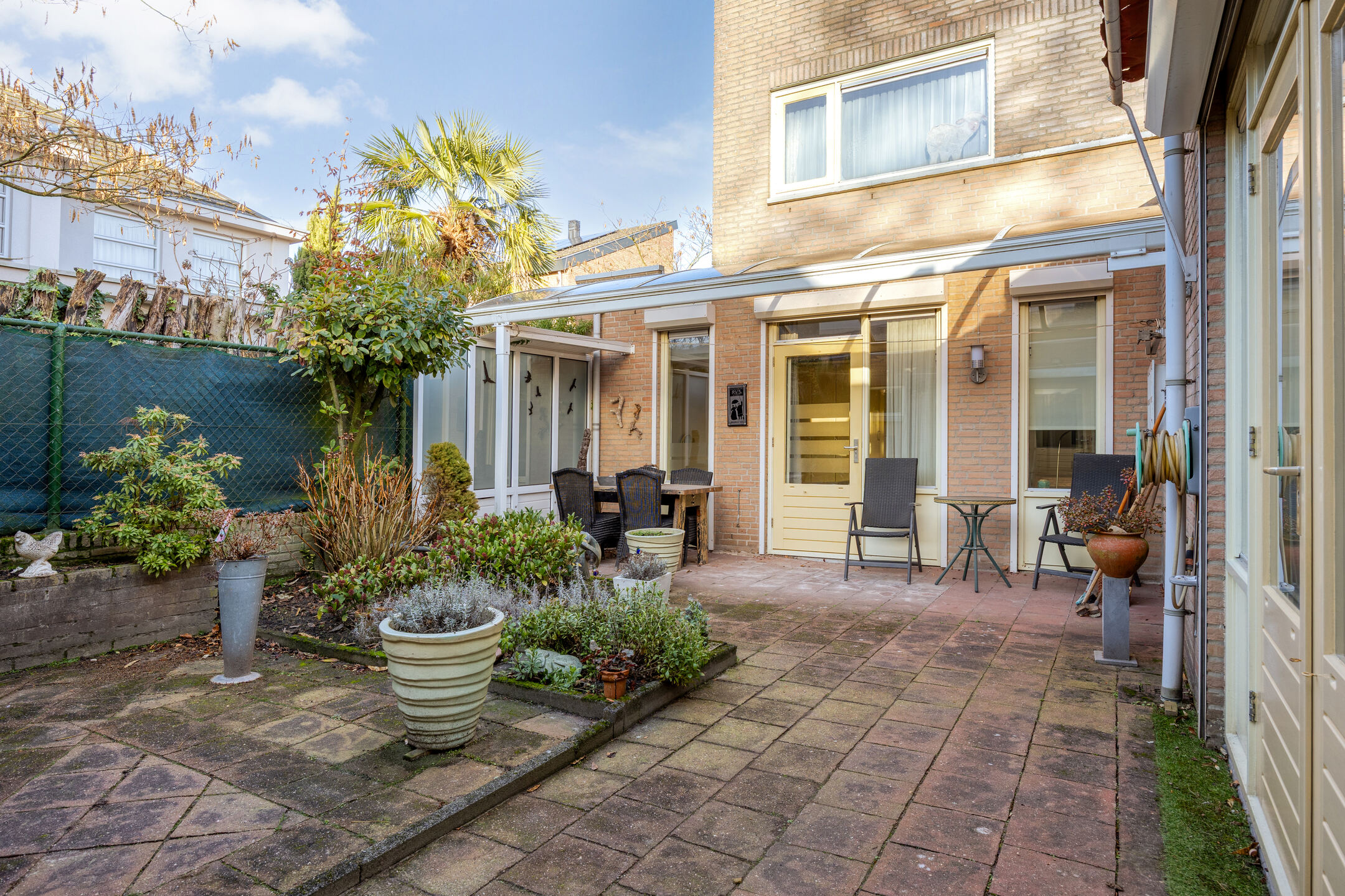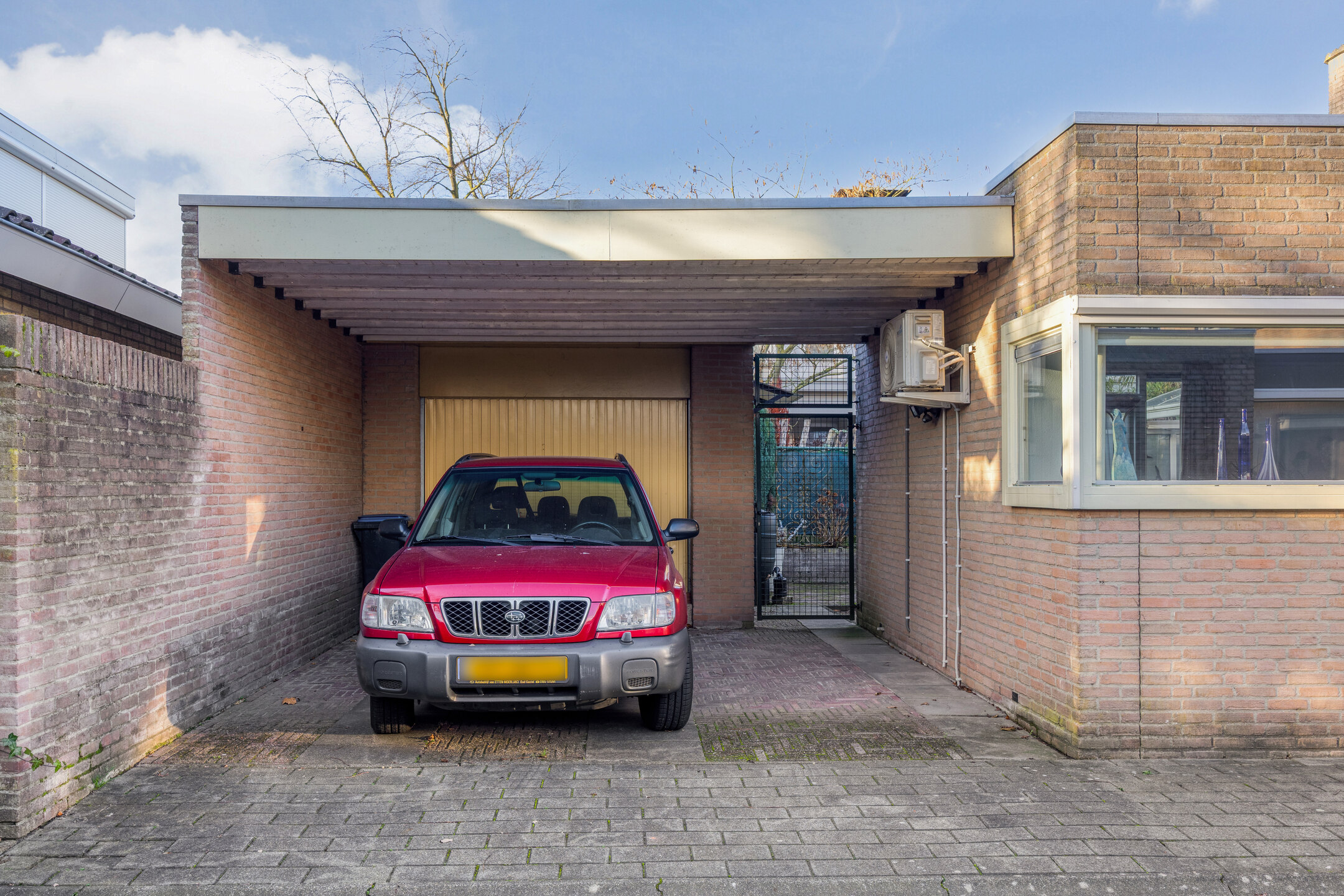 De patiotuin is volledig bestraat, voorzien van een overkapping en biedt veel privacy en geeft toegang tot zowel de garage als een poort met achterom richting de carport. De ruime uitgebouwde garage beschikt over een kanteldeur en een doorgang naar de carport