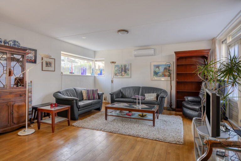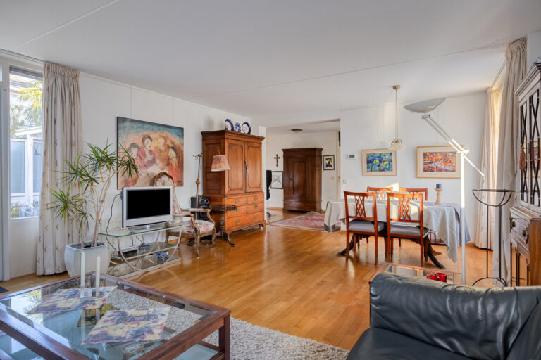 De lichte woonkamer met parketvloer biedt volop leefruimte en staat via dubbele openslaande deuren in directe verbinding met de patiotuin. Woonkamer en keuken samen zijn ca. 49 m² groot. De woonkamer beschikt tevens over een airco installatie (2023).