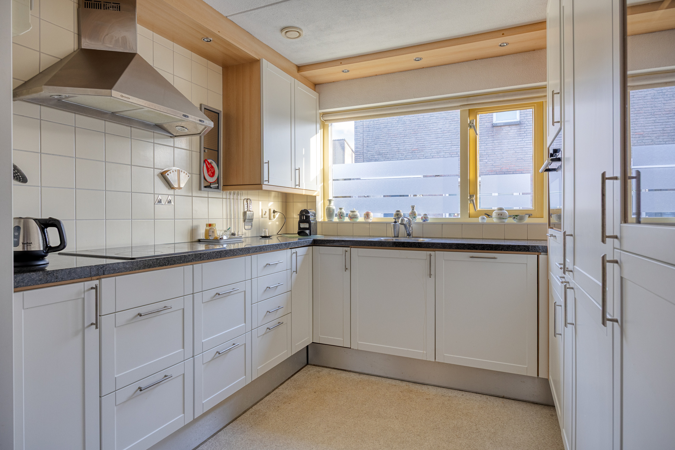 Via de hal met meterkast, toiletruimte en trapopgang bereikt u de royale leefruimte. De open keuken is modern uitgevoerd in een praktische U-vormige opstelling en voorzien van diverse inbouwapparatuur, waaronder een combi-oven/magnetron, koelkast, vaatwasser, keramische kookplaat en afzuigkap.