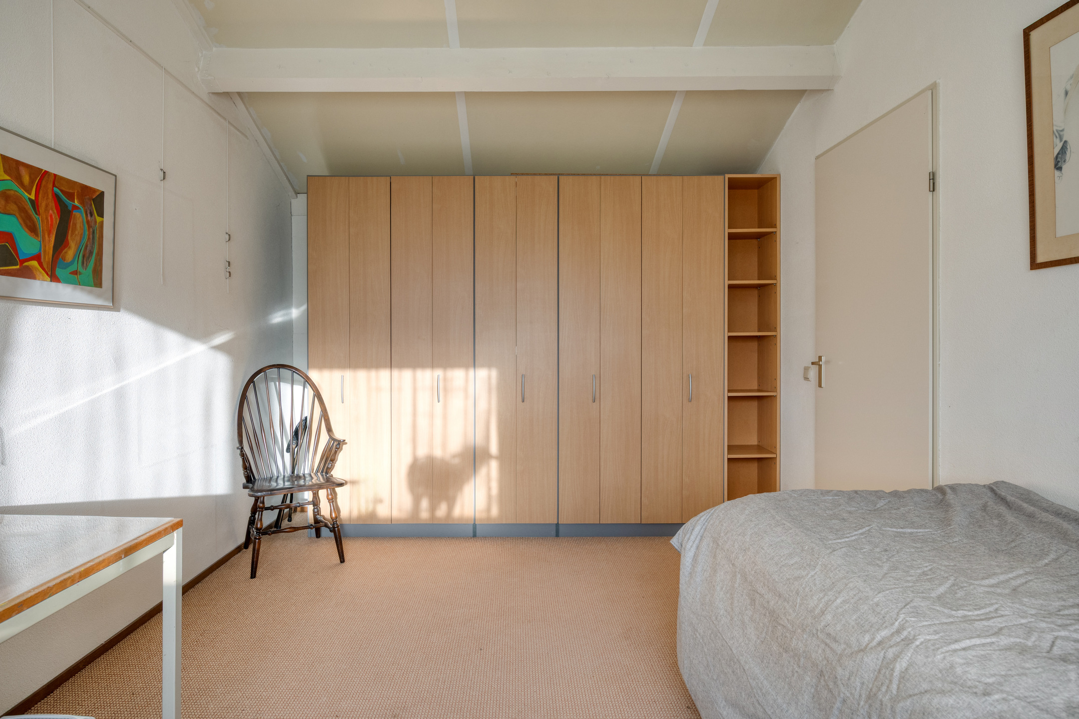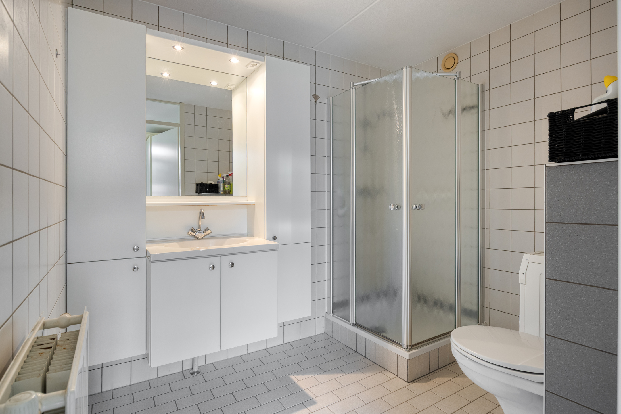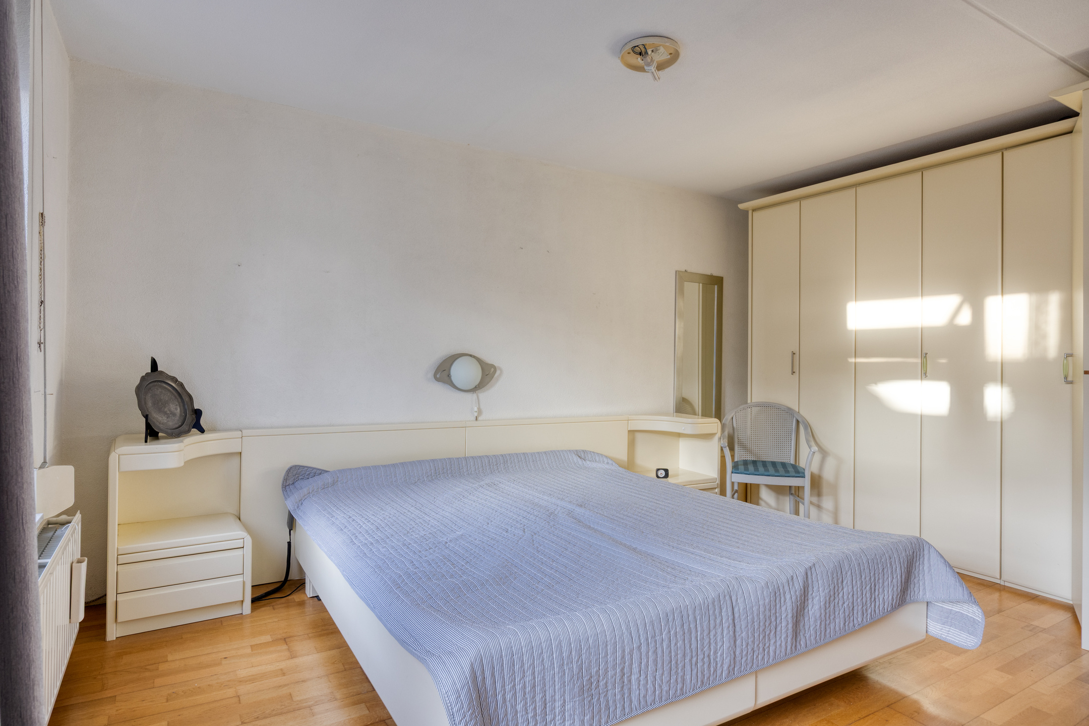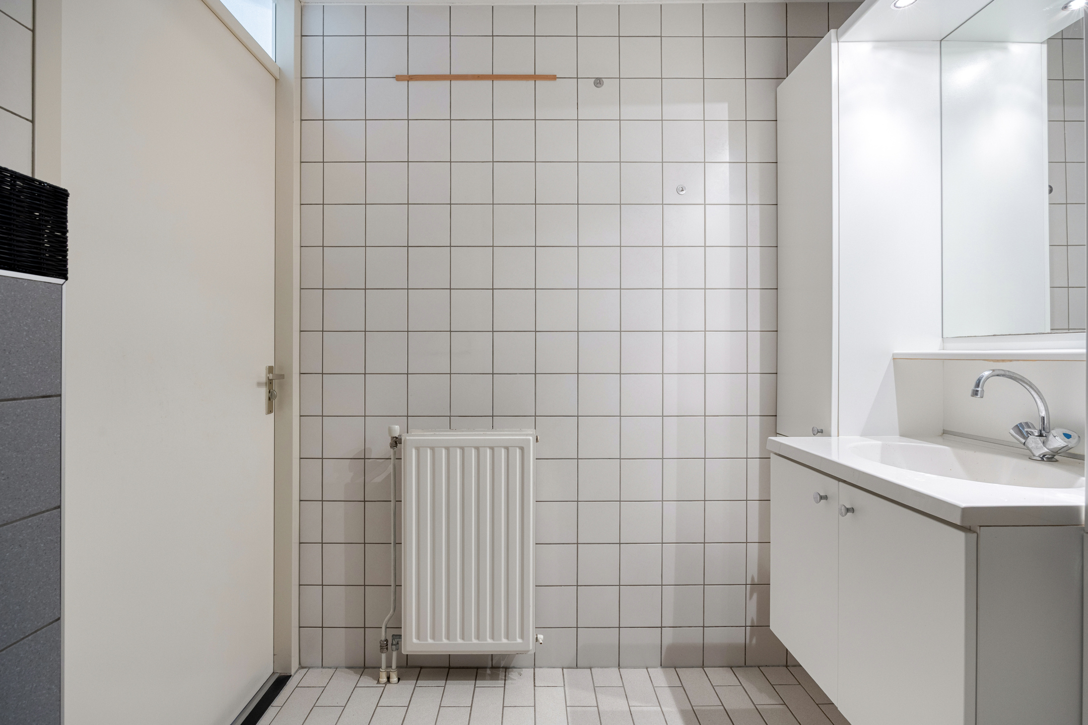 Aangrenzend bevindt zich een ruime slaapkamer van ca. 18 m², voorzien van een parketvloer en een tuindeur. De volledig betegelde badkamer is bereikbaar vanuit de slaapkamer en uitgerust met een douchecabine, wastafelmeubel en een tweede toilet. Ook is hier de aansluiting voor de wasmachine aanwezig.