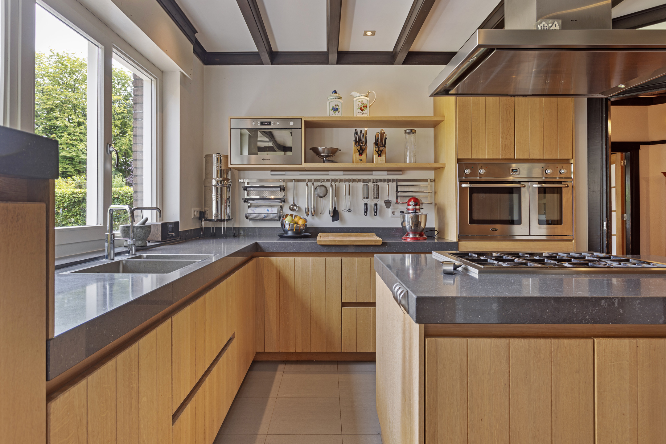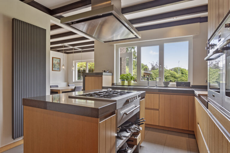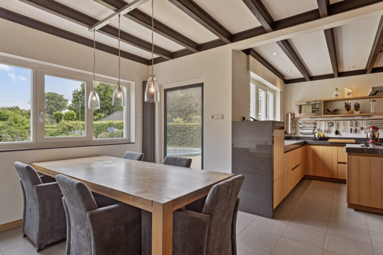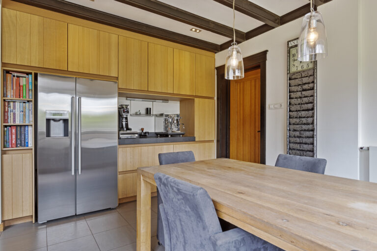 De centrale hal biedt ook toegang tot de zeer royale woonkeuken door de huidige eigenaar volledig nieuw ingericht en voorzien van een moderne keukeninrichting in massief eiken met een aantal composiet werkbladen en diverse moderne apparatuur. Apparatuur o.a. een inox 5-pits gaskookplaat in eiland opstelling, een ingebouwde dubbele Boretti oven, een ingebouwde magnetron, een dubbele inox spoelbak met aparte mengkraan en Quooker en een inbouw vaatwasser op hoogte (voorkomt bukken). Daarnaast zijn er tal van opbergmogelijkheden in de diverse kasten onder en boven de werkbladen. Het zitgedeelte van de woonkeuken heeft een vaste kastenwand met een composiet werkblad voor een koffiecorner en een nis voor een Amerikaanse koelkast. De woonkeuken is gesitueerd tegen de achtertuin met wijds uitzicht en biedt toegang tot de tuin en de bijkeuken.