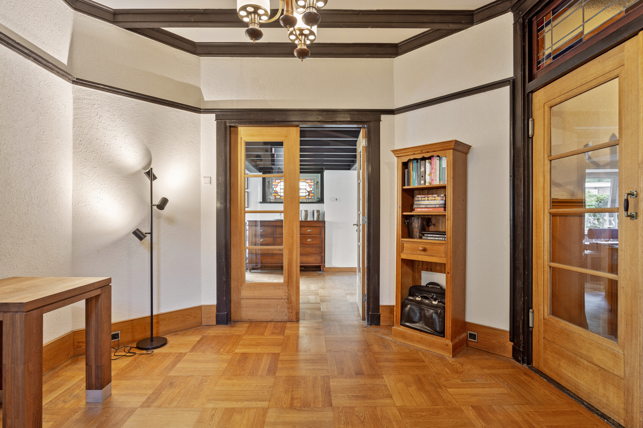 Alle verdiepingen voorzien van houten vloeren in massief eiken parket, in verschillende dessins en kleurstelling;