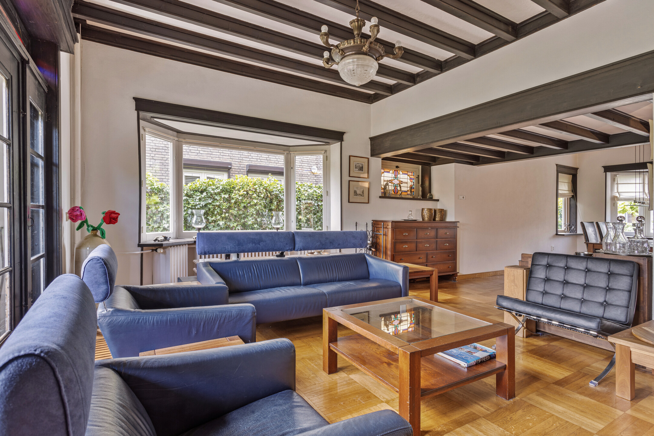 De zeer lichte woonkamer aan de andere zijde van de centrale hal is bereikbaar via dubbele openslaande deuren en heeft nog de kenmerkende authentieke elementen, zoals glas in lood. Het zitgedeelte links van de toegang met open haard biedt een prachtig uitzicht over de achtertuin. Het eetgedeelte rechts van de toegang is aan de voorzijde van het vertrek gesitueerd. De woonkamer wordt verder gekenmerkt door twee prachtige erkers.