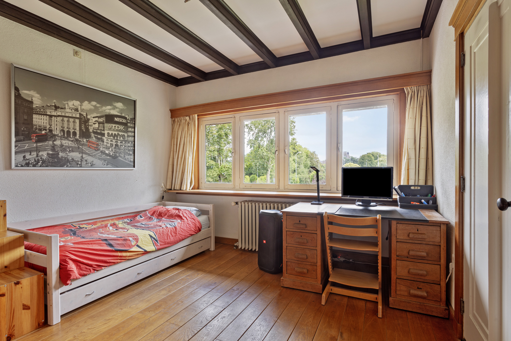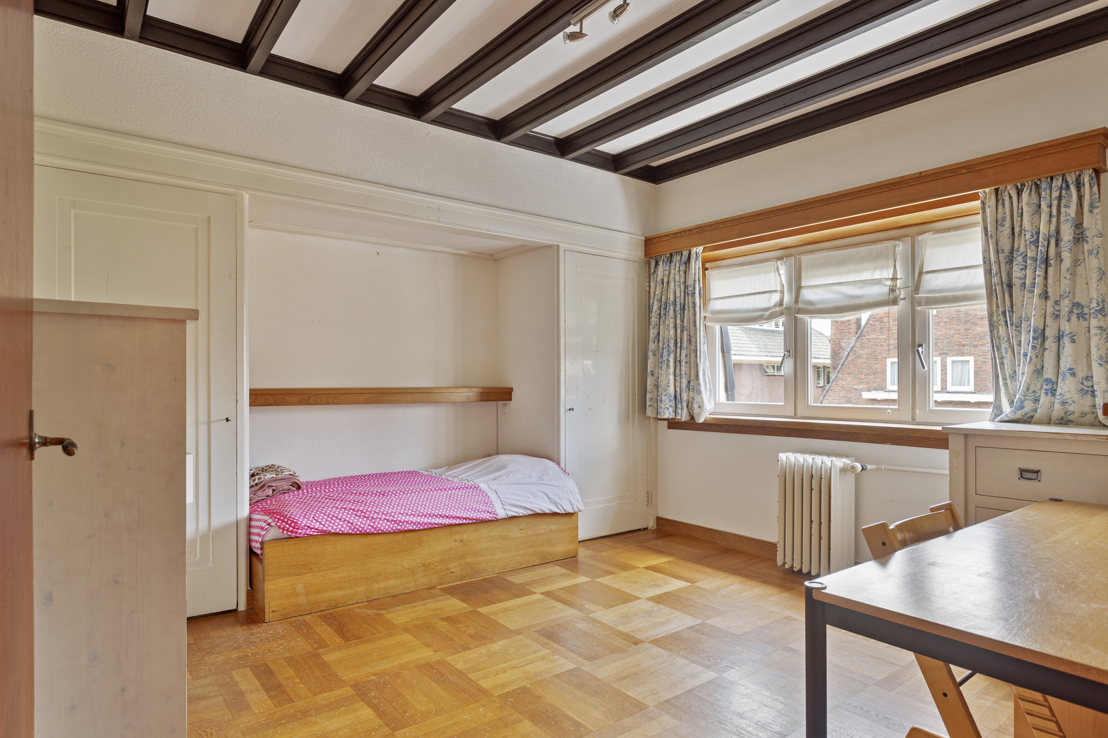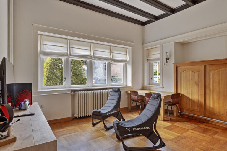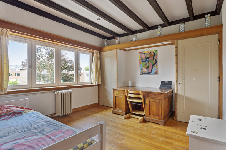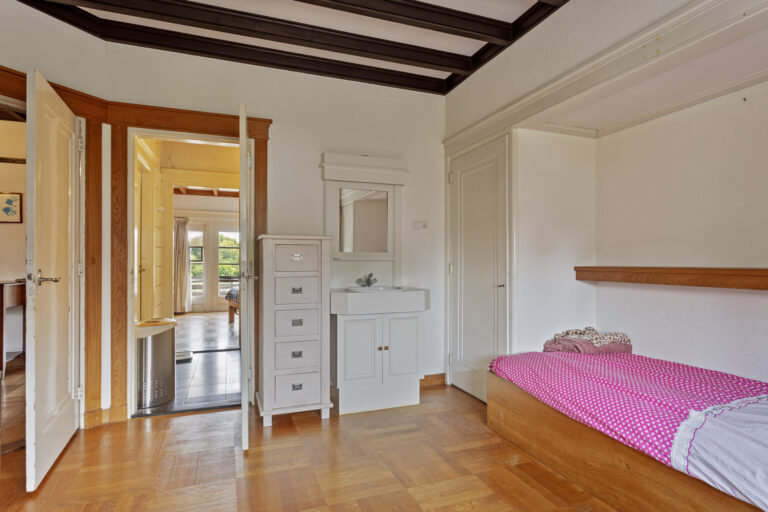 Aan de voorzijde van de woning tegen de oprit is een ruime werkkamer/slaapkamer gesitueerd met een ingebouwde kast voorzien van massief eiken schuifdeuren.