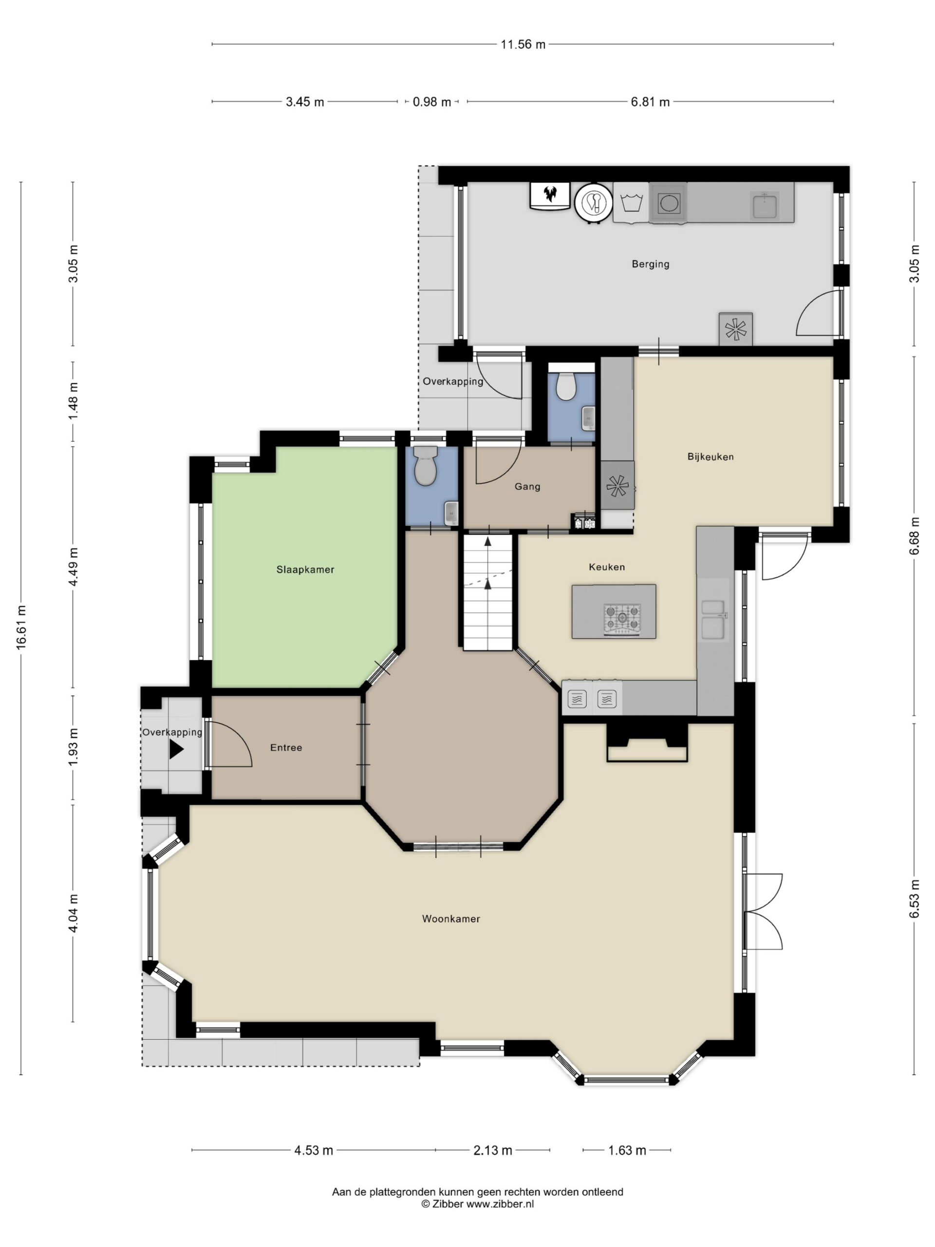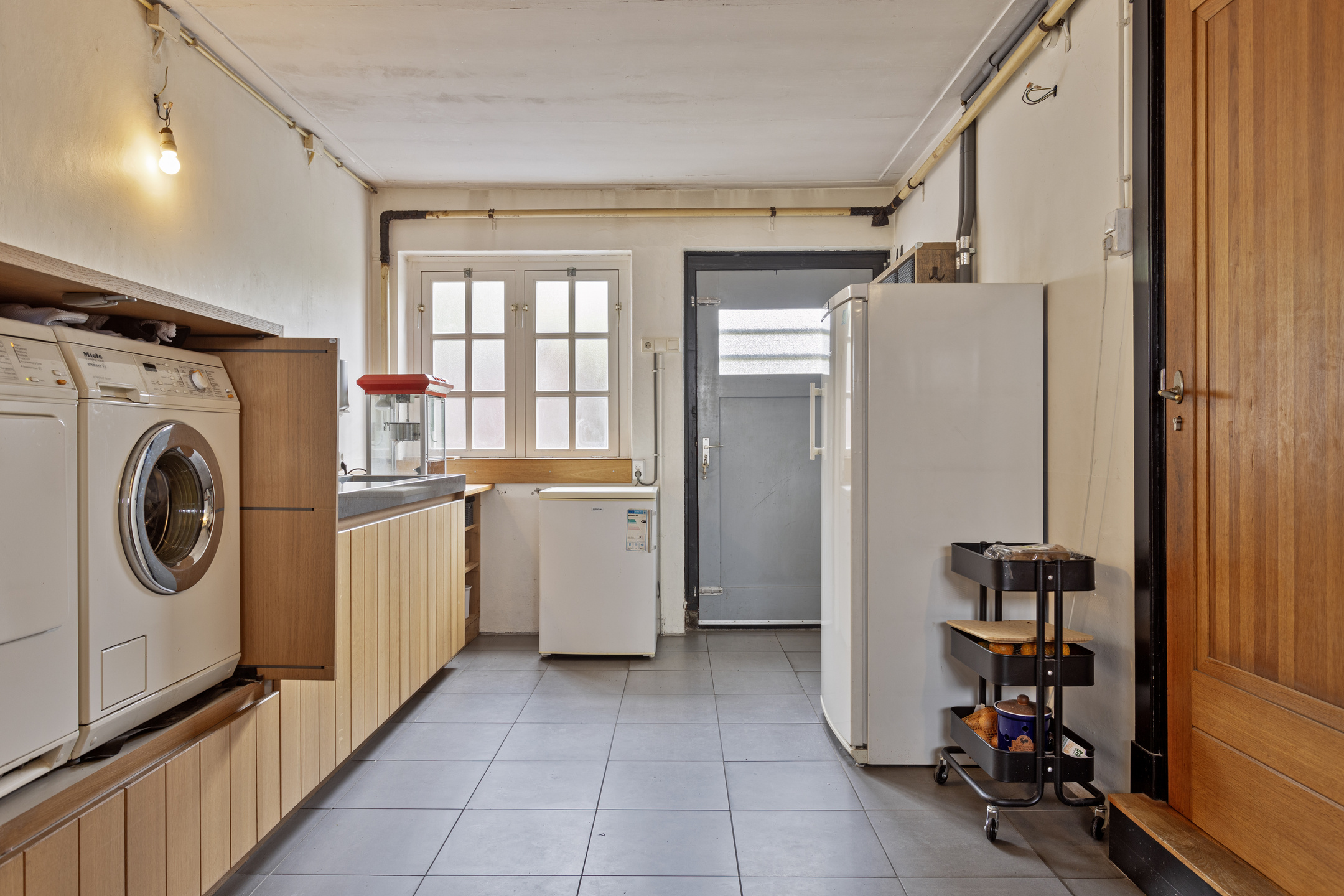 In de bijkeuken is dezelfde keukeninrichting doorgezet als de woonkeuken met een composiet werkblad en ruime inox spoelbak voorzien van een horeca mengkraan. In het keukenmeubel bevinden zich tevens de aansluitingen voor wasmachine en wasdroger, evenals bij de vaatwasser in verhoogde opstelling. De aansluiting van de wasmachine is voorzien van een 3-klep mengkraan gevoed vanuit de wam water boiler. Hetgeen inhoudt dat de wasmachine op 30 graden Celsius wordt gevuld (
