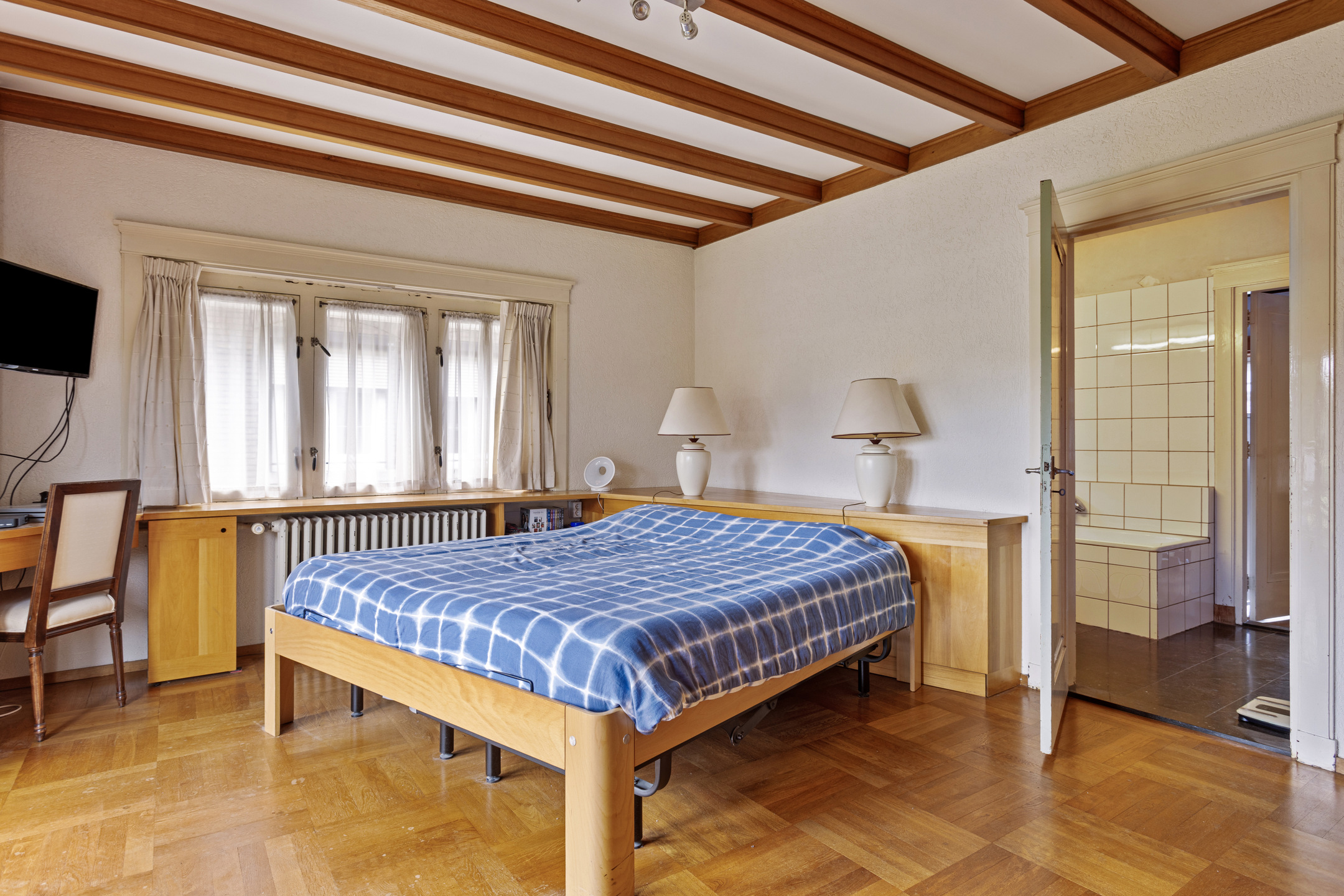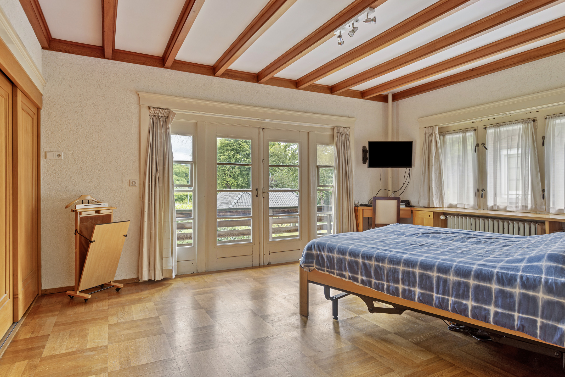 De ouderlijke slaapkamer aan de achterzijde heeft toegang tot een balkon met wijds uitzicht.