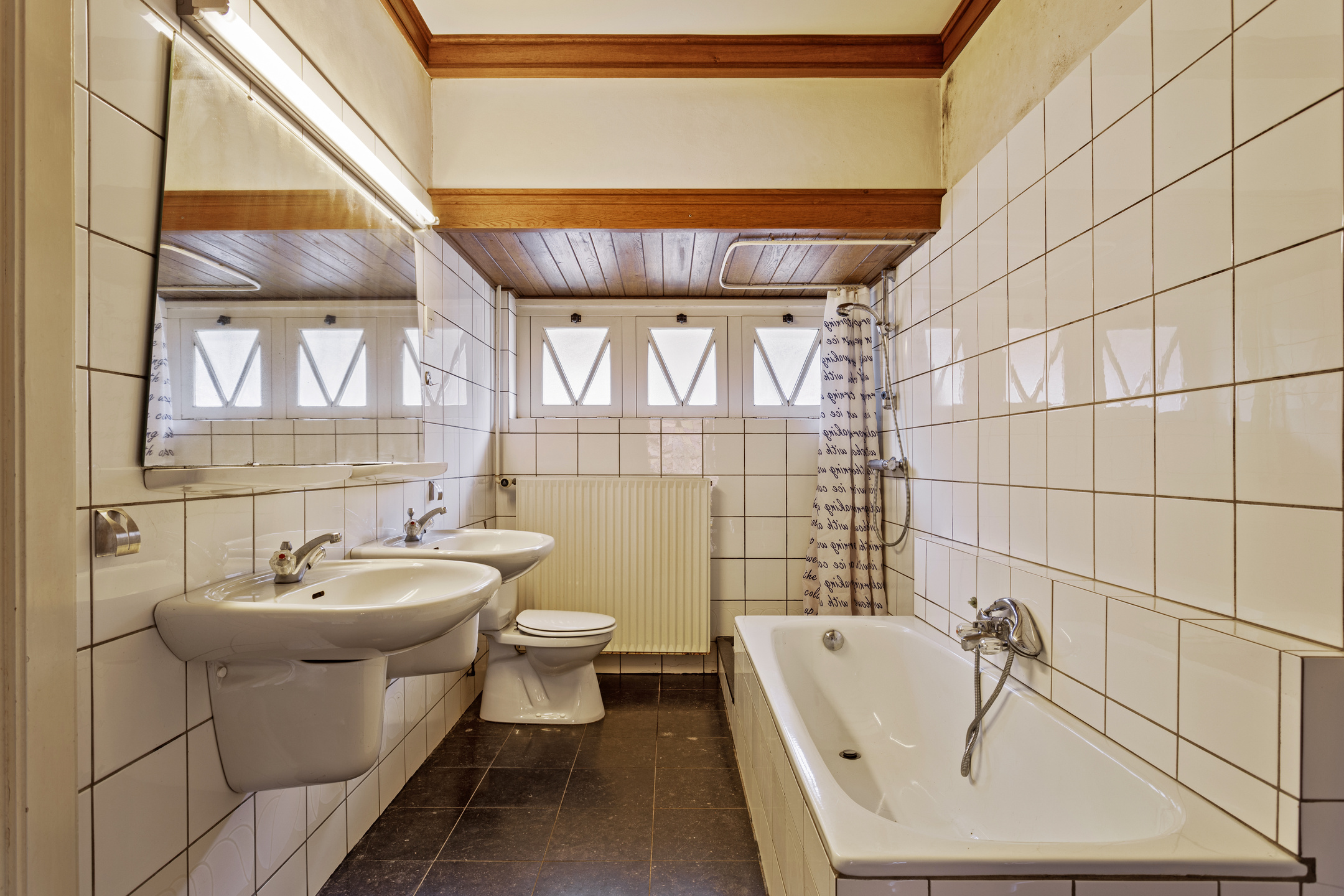 De grote badkamer is voorzien van een ligbad, dubbele wastafelmeubel, douche en derde toilet.