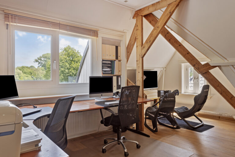 De zeer royale en lichte zolderverdieping is geheel open als studio ingericht en biedt vele functies, waaronder de opstelling van een logeerbed, een riant werkbureau onder de dakkapel en ingebouwde boekplanken, een game hoek en en een fitnessruimte. Daarnaast biedt deze zolderverdieping ruime opbergmogelijkheden.