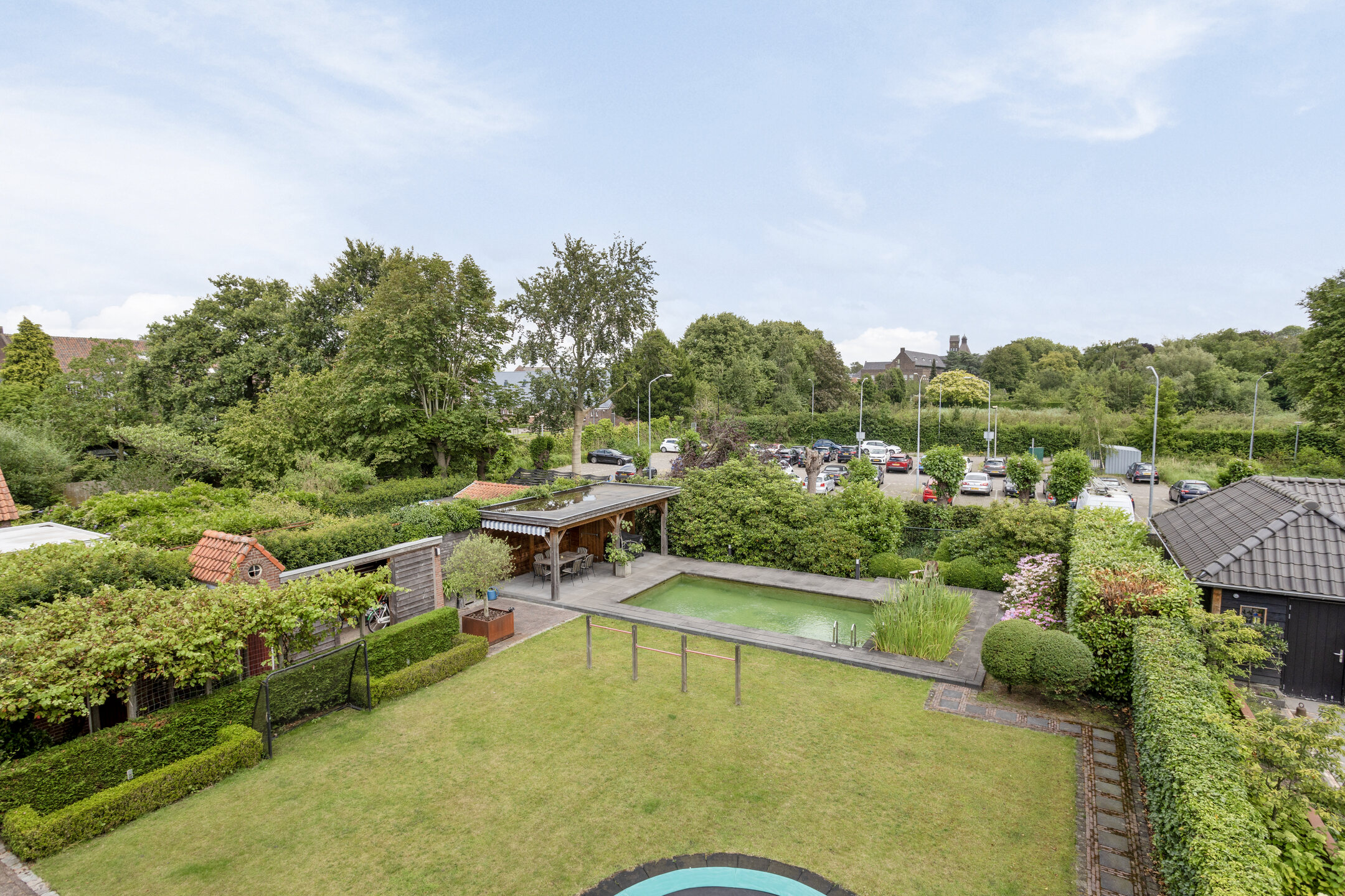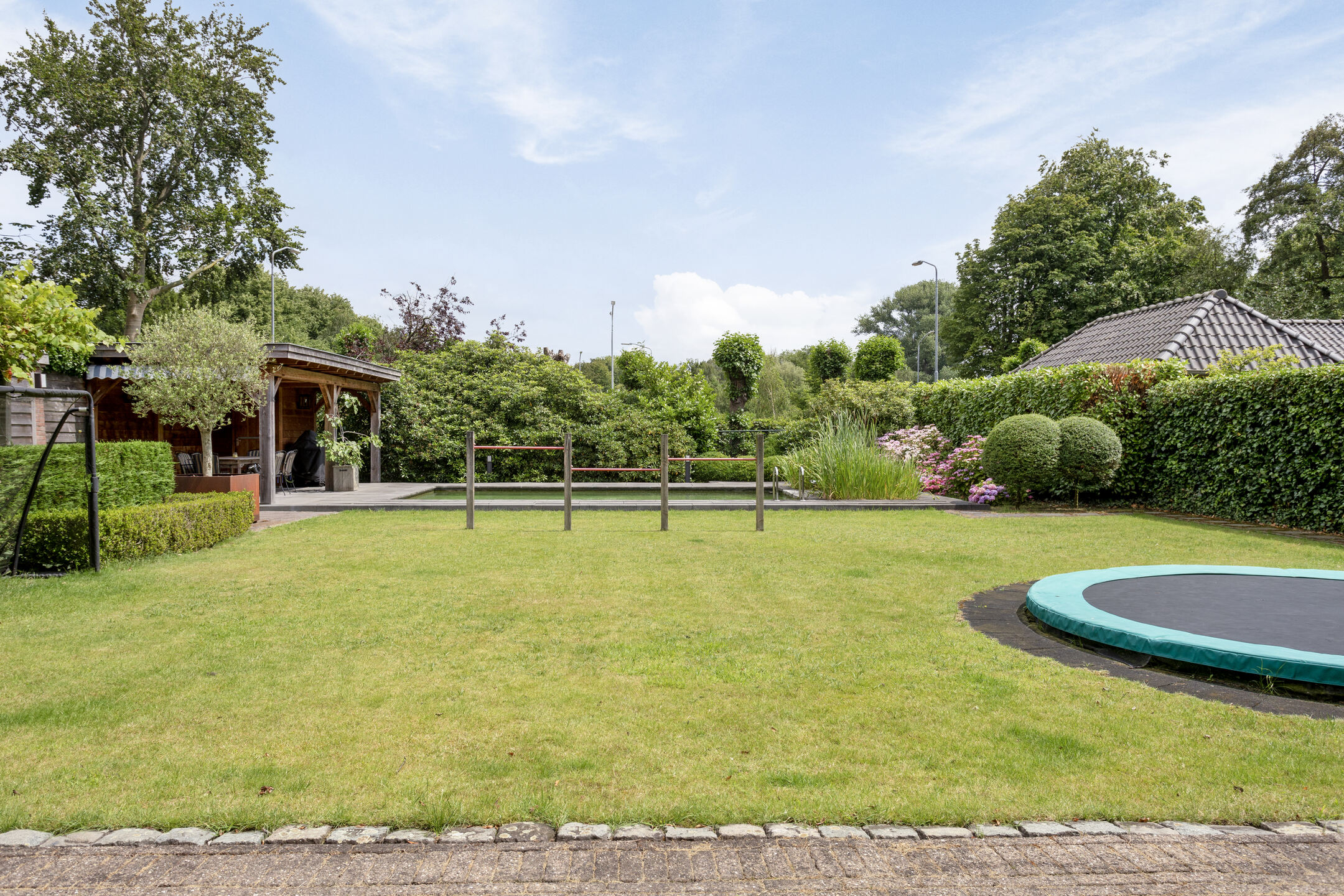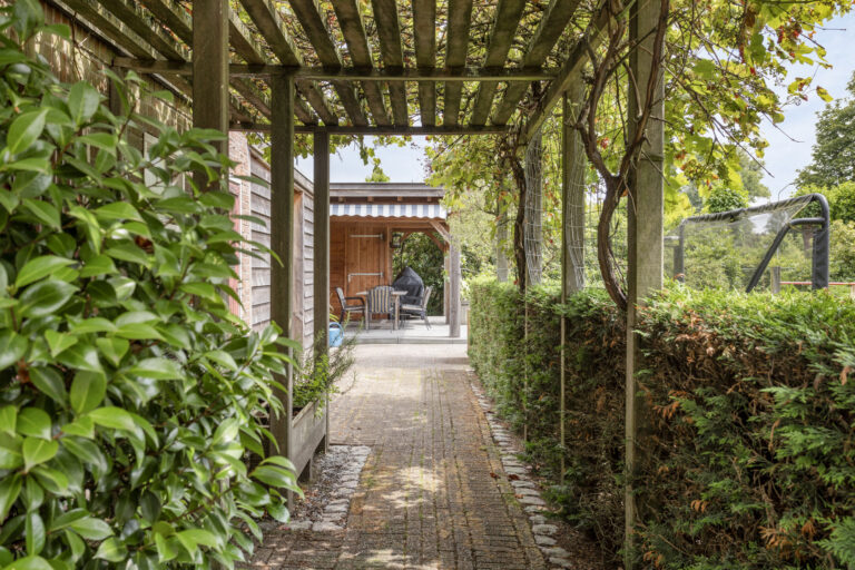 De prachtig aangelegde en wijds opgezette achtertuin is georiënteerd op het zuidoosten en biedt ruimte aan diverse terrassen, een pergola met kruidenkrib, een zwemvijver, een ingegraven trampoline, gras en groene borders. Daarnaast vindt u in de achtertuin een aantal bergingen en een halfopen fietsenberging. De parel van deze achtertuin is de natuurlijk gefilterde zwemvijver achter in de tuin met overkapping van circa 32 m² met extra berging. Onder de overkapping is het ideaal zitten om te ontspannen en door de oriëntatie van de tuin bent u de gehele dag verzekerd van zon.