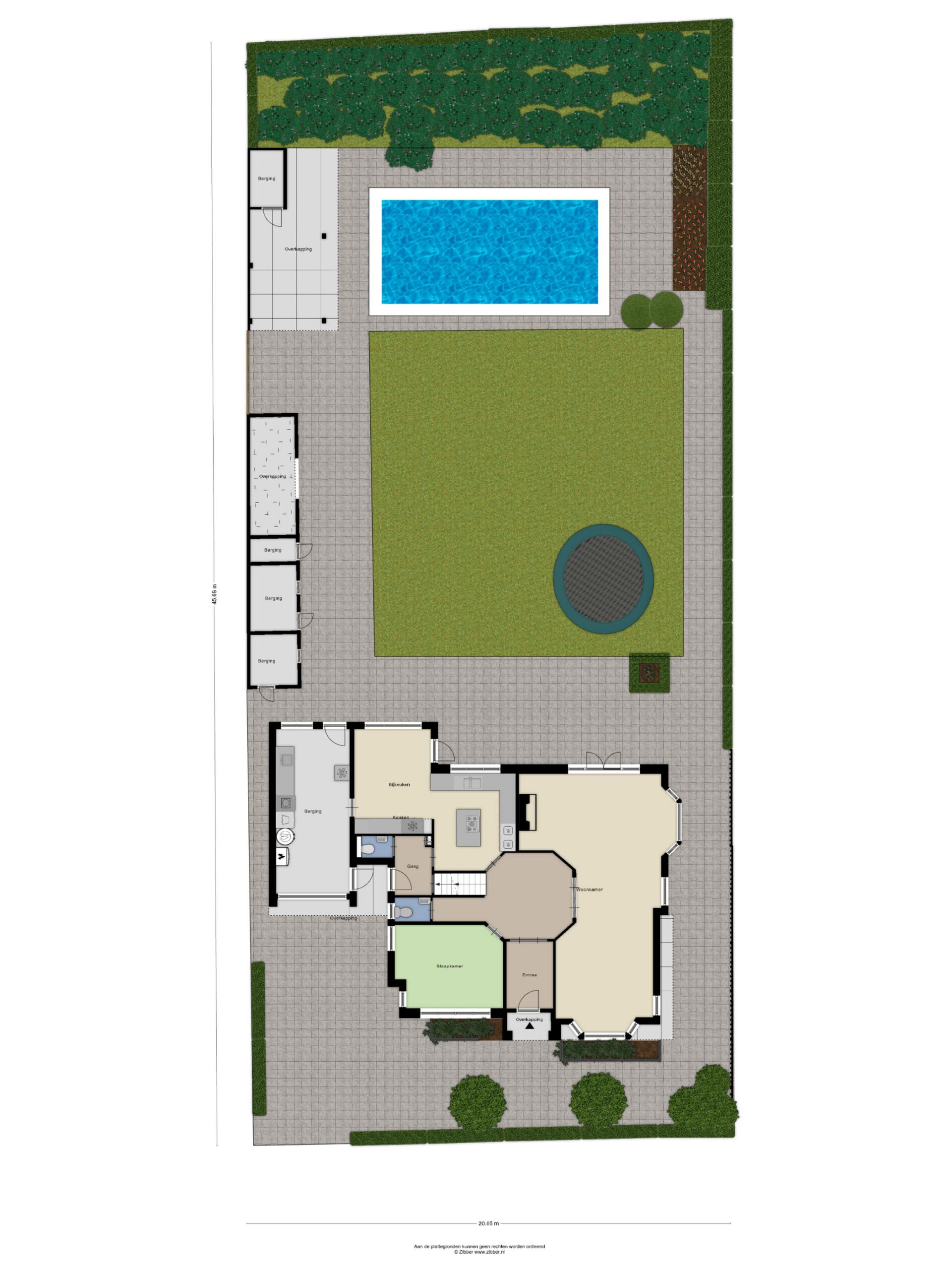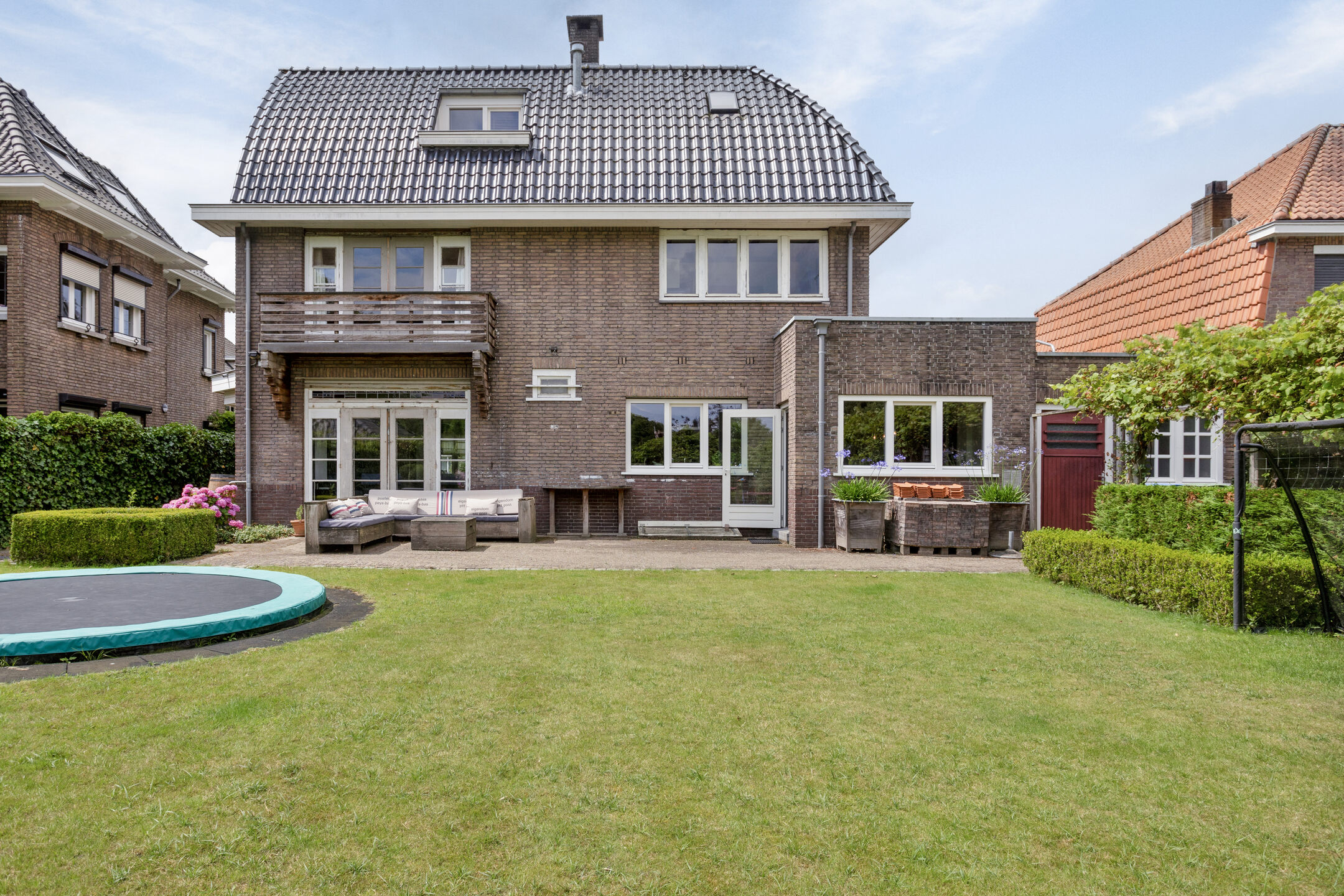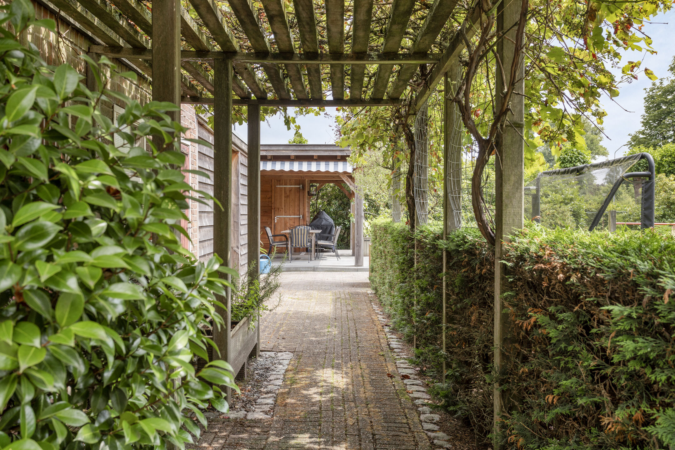 De prachtig aangelegde en wijds opgezette achtertuin is georiënteerd op het zuidoosten en biedt ruimte aan diverse terrassen, een pergola met kruidenkrib, een zwemvijver, een ingegraven trampoline, gras en groene borders. Daarnaast vindt u in de achtertuin een aantal bergingen en een halfopen fietsenberging. De parel van deze achtertuin is de natuurlijk gefilterde zwemvijver achter in de tuin met overkapping van circa 32 m² met extra berging. Onder de overkapping is het ideaal zitten om te ontspannen en door de oriëntatie van de tuin bent u de gehele dag verzekerd van zon.