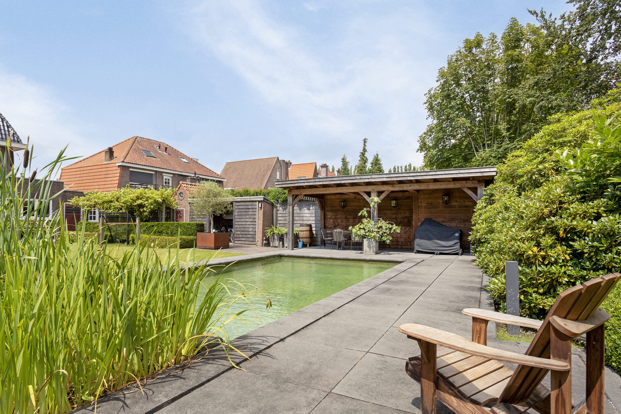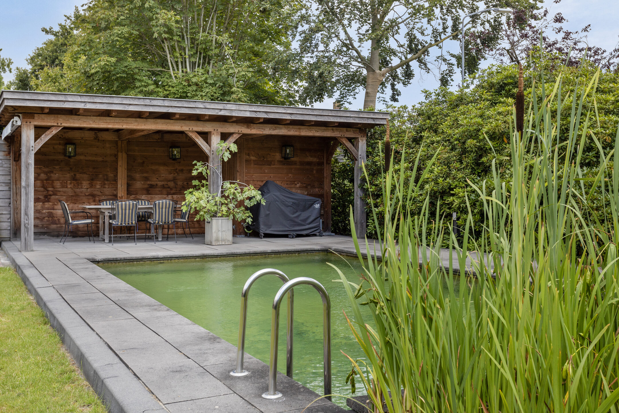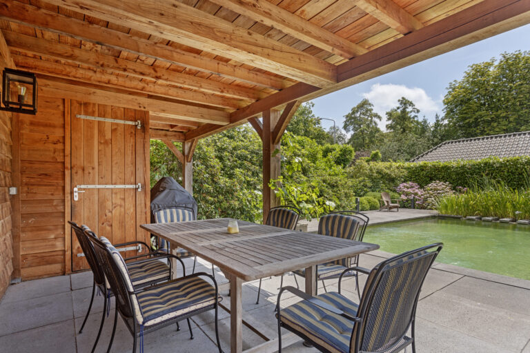Zonnige en besloten achtertuin op het zuidwesten met zwemvijver en houten overkapping.