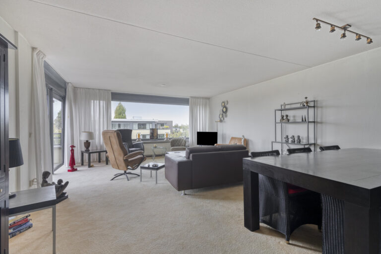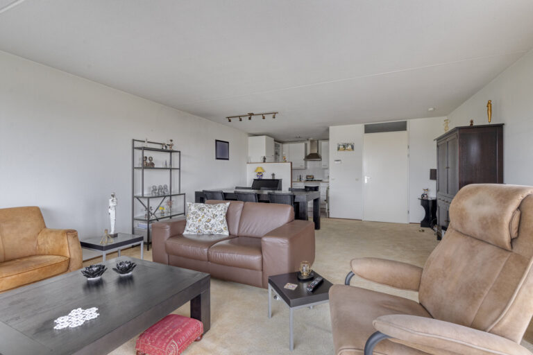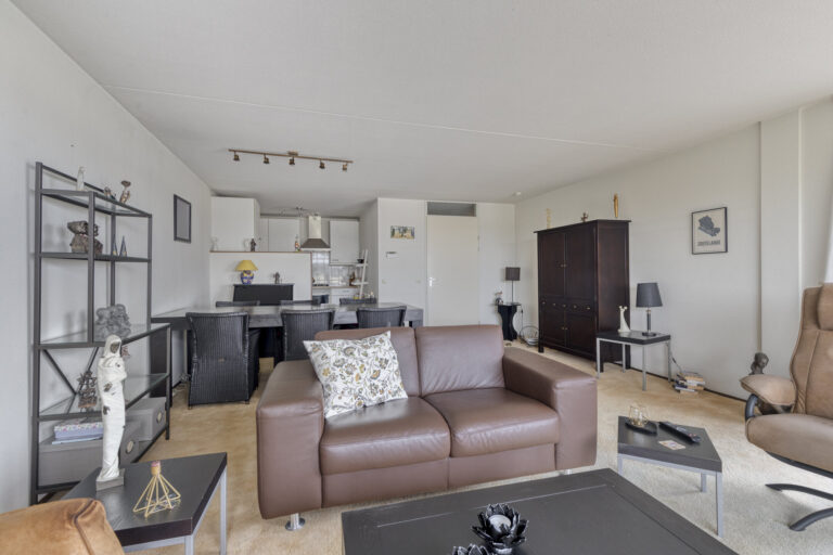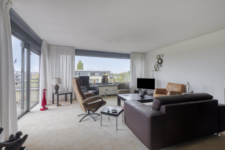 De woonkamer is praktisch ingedeeld en ontvangt veel natuurlijk licht. De ruimte is afgewerkt met vloerbedekking en spachtelputz wandafwerking. Via de schuifpui in de woonkamer heeft u toegang tot het ruime balkon van ca. 10 m², ook voorzien van zonwering. Hier is voldoende plek voor een fijne lounge set, waar u de hele dag door kunt genieten van de zon en de rust.