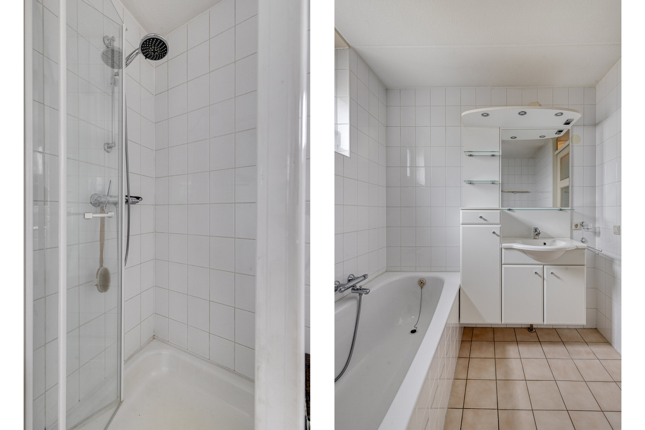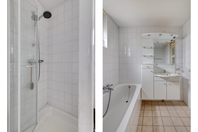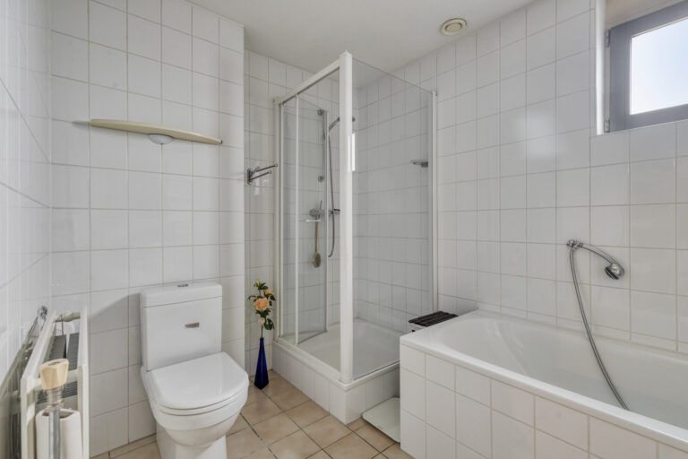 De badkamer is volledig betegeld en uitgerust met een douchecabine, ligbad, wastafelmeubel, een tweede toilet én een raam voor natuurlijke ventilatie.