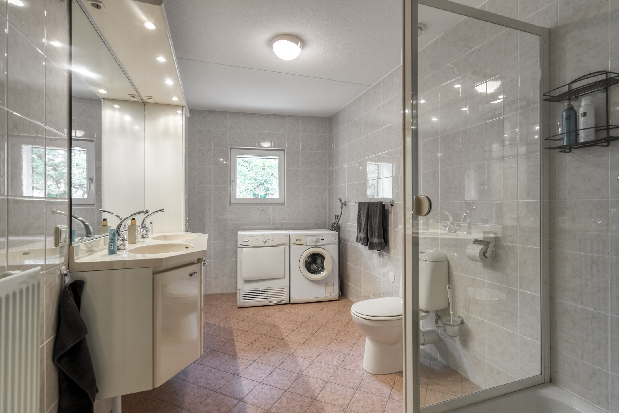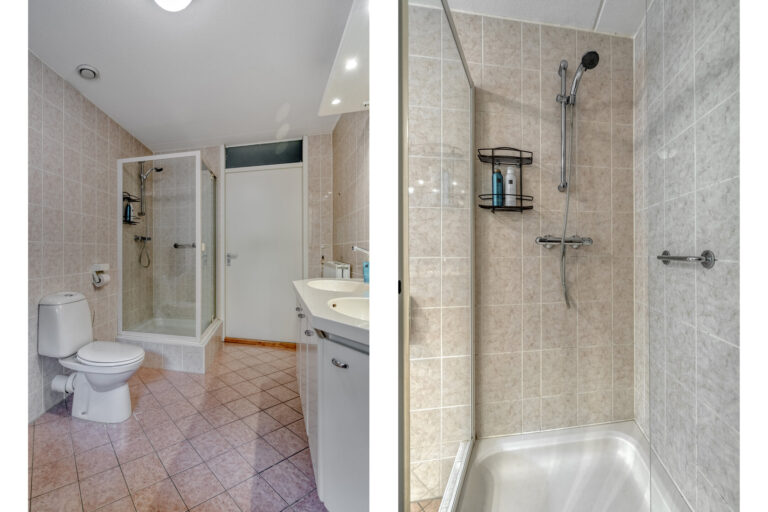 Badkamer (ca. 8,5 m²): Ruim en compleet met douchecabine, wastafelmeubel, 2e toilet, wasmachineaansluiting en mechanische ventilatie.