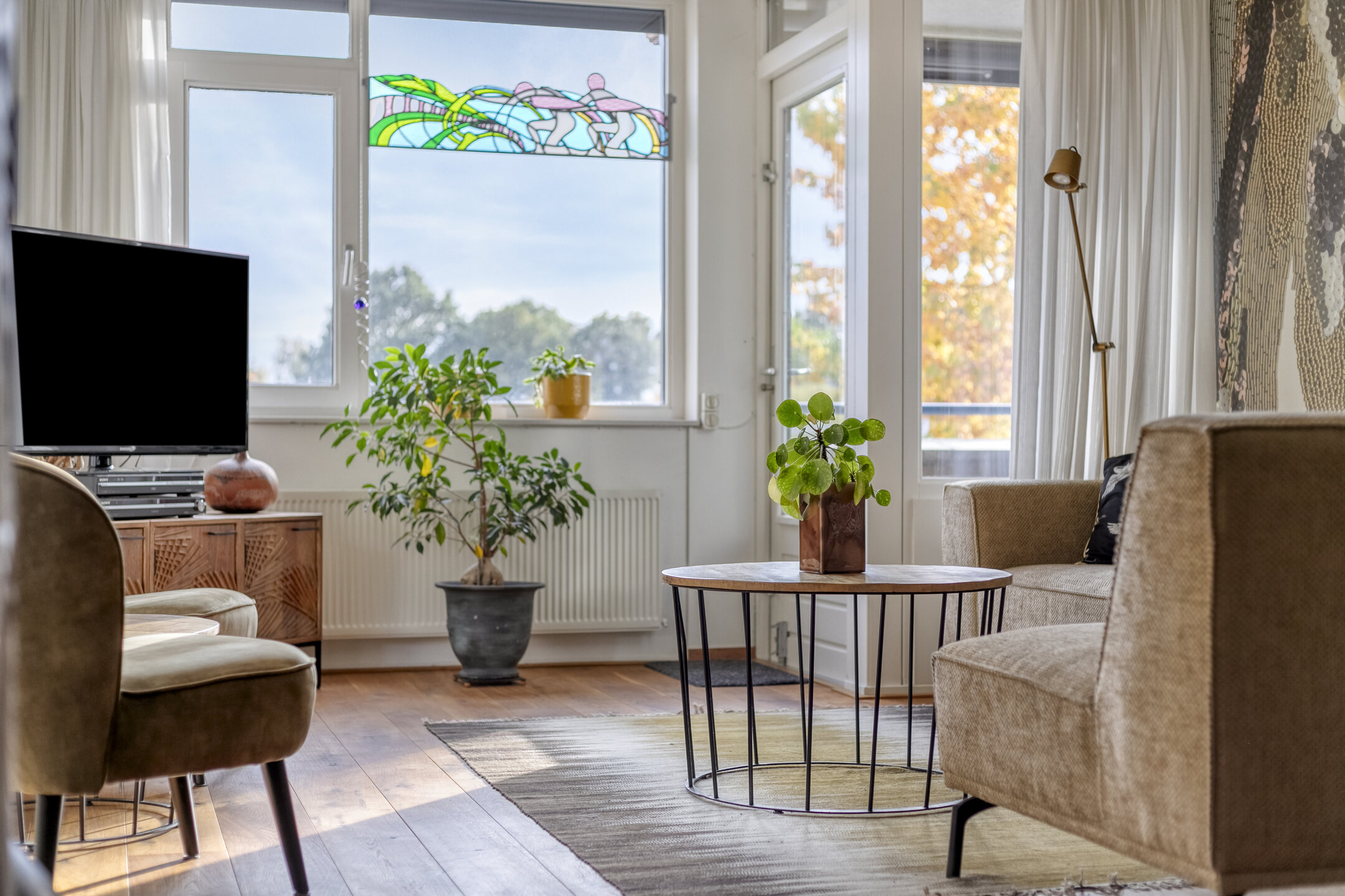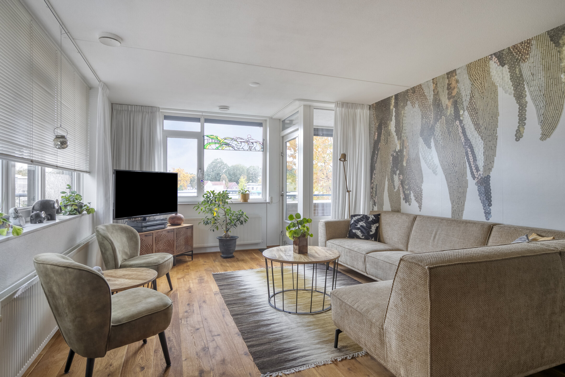 Woonkamer (ca. 33,5 m²): Zeer licht dankzij de vele raampartijen, met houten vloer, natuurstenen vensterbanken, gespoten wanden/plafond en videofoon. Direct toegang tot het balkon én het riante dakterras van ca. 36 m².
