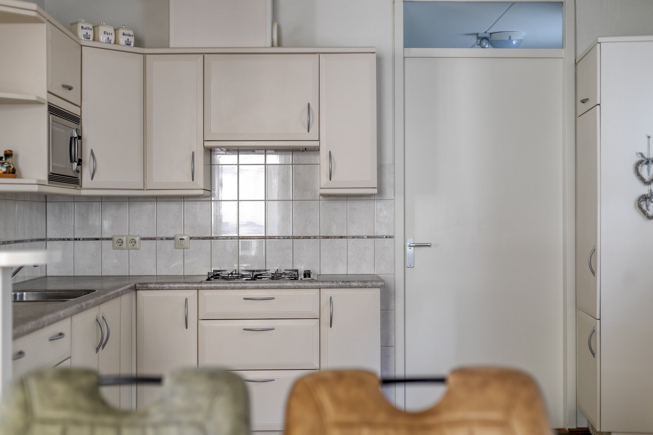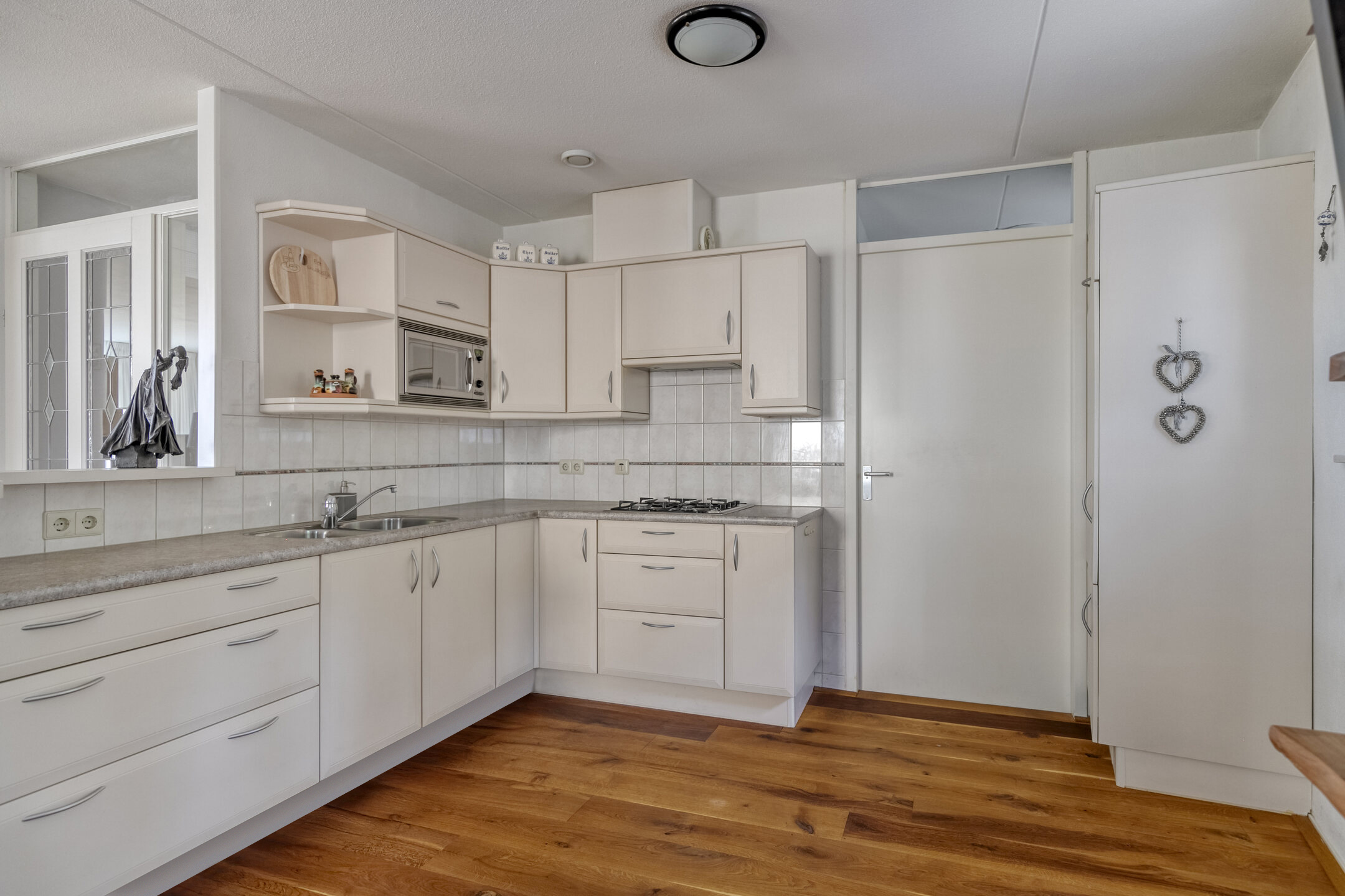 Semi-open keuken (ca. 9,5 m²) met keurig ingerichte hoekopstelling en voorzien van diverse inbouwapparatuur te weten een koelkast, oven, magnetron en gaskookplaat.