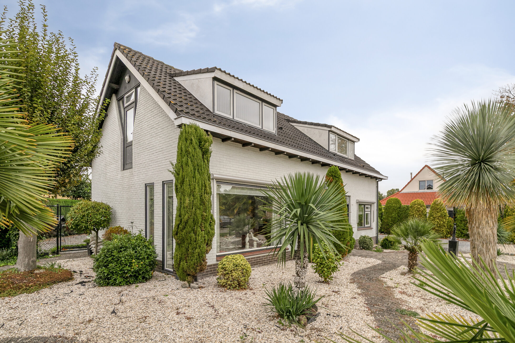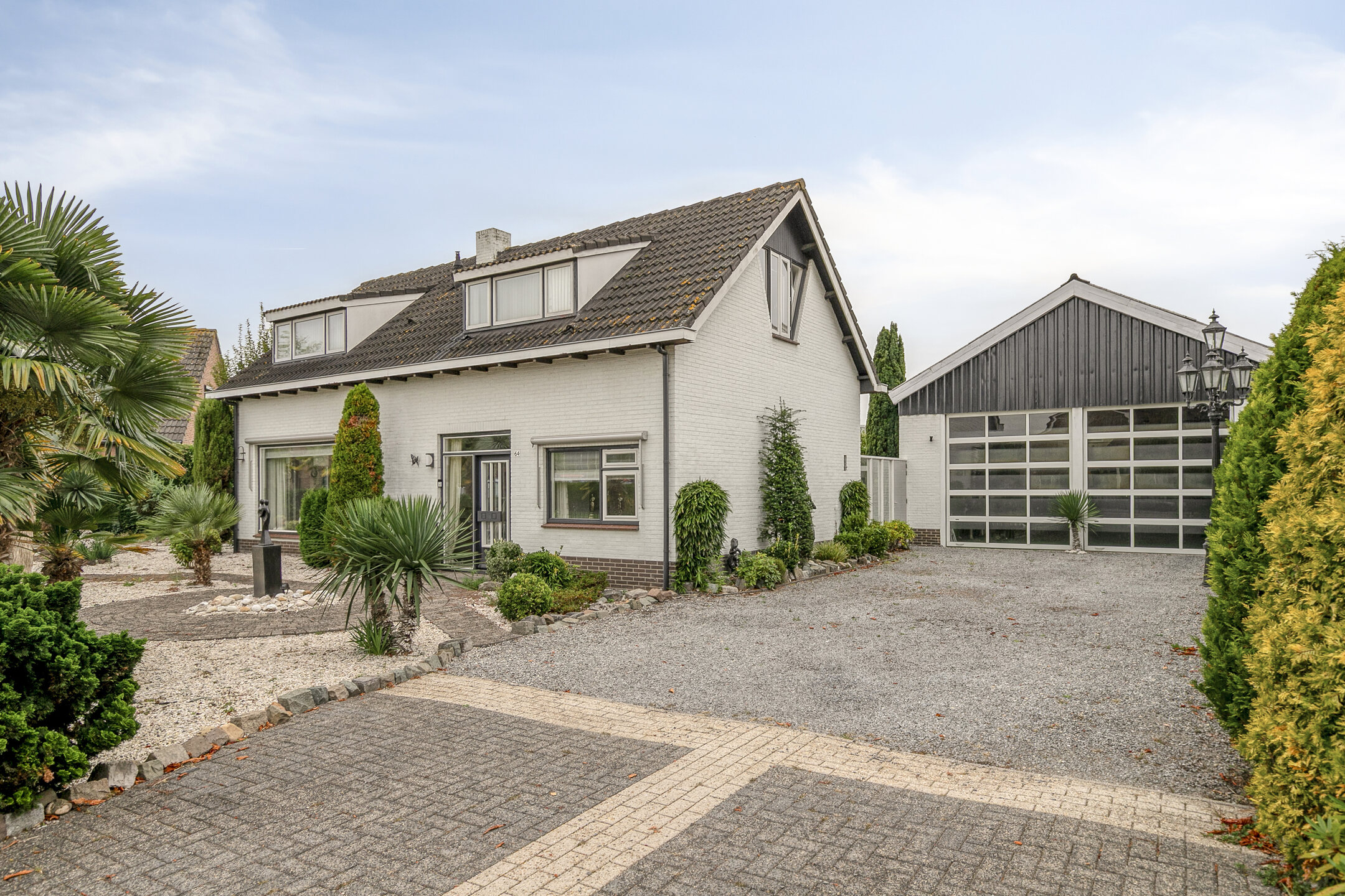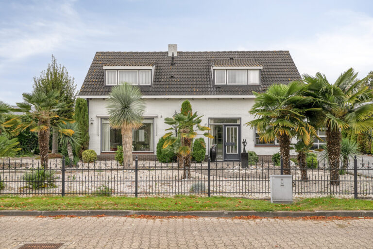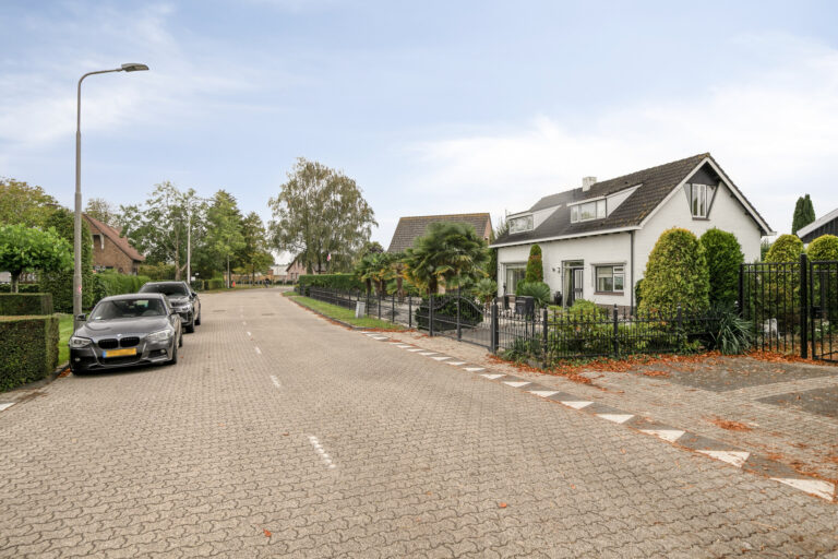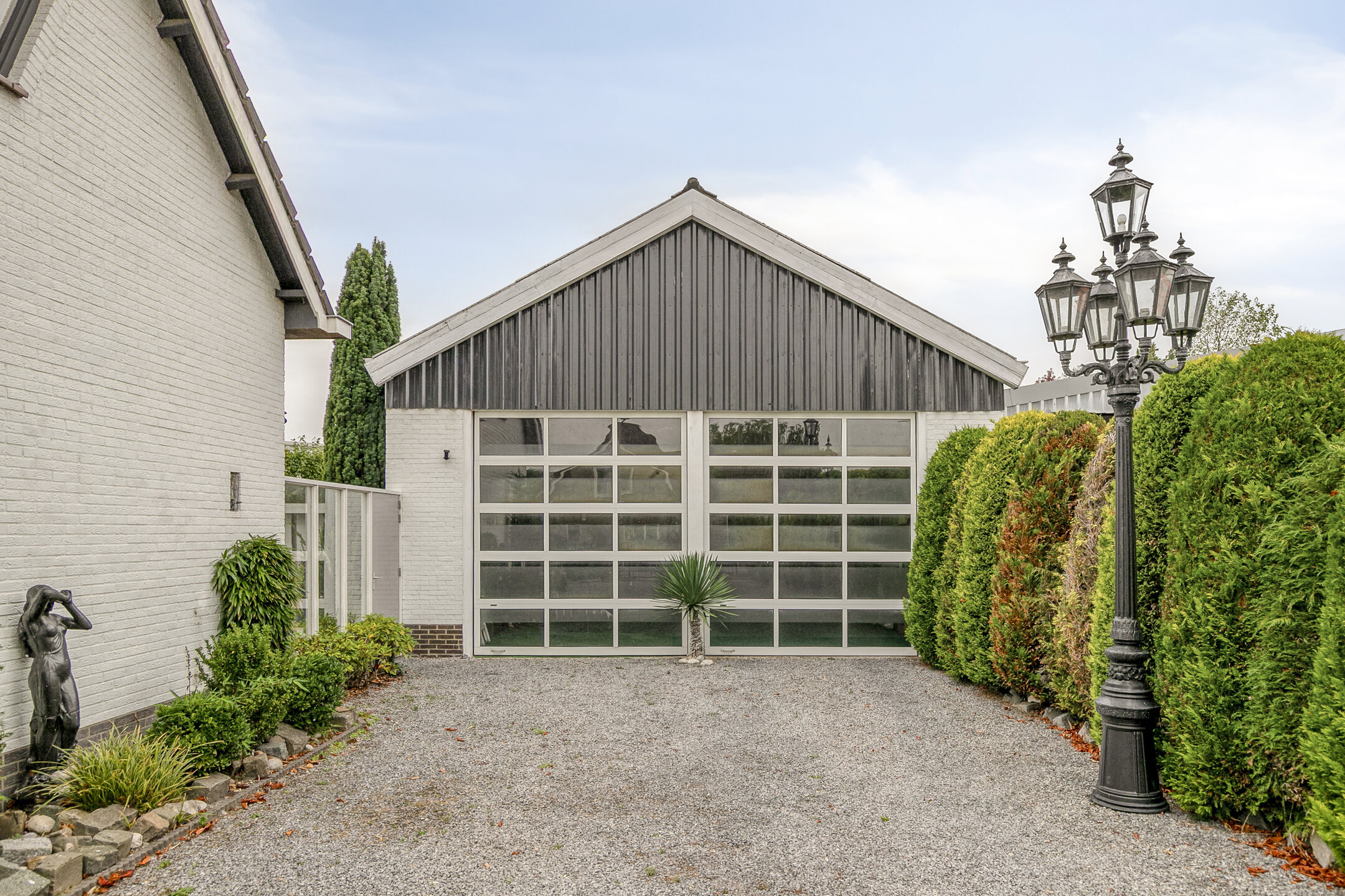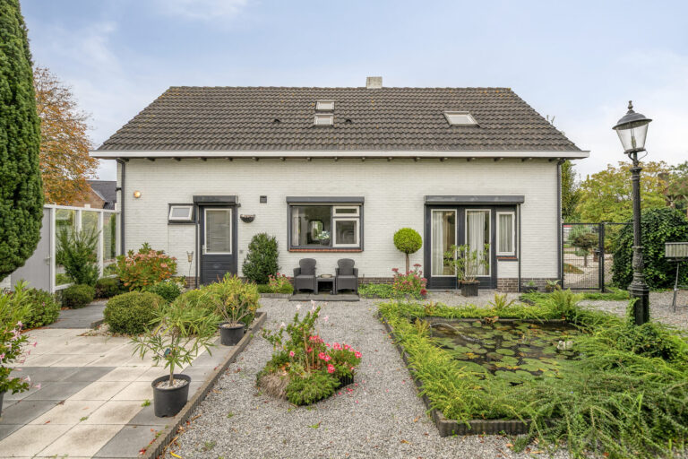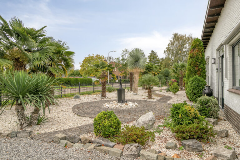 Ruime voortuin met brede oprit naar de loods, geschikt voor meerdere auto’s naast elkaar. De woning is omringd door een verzorgde tuin rondom.