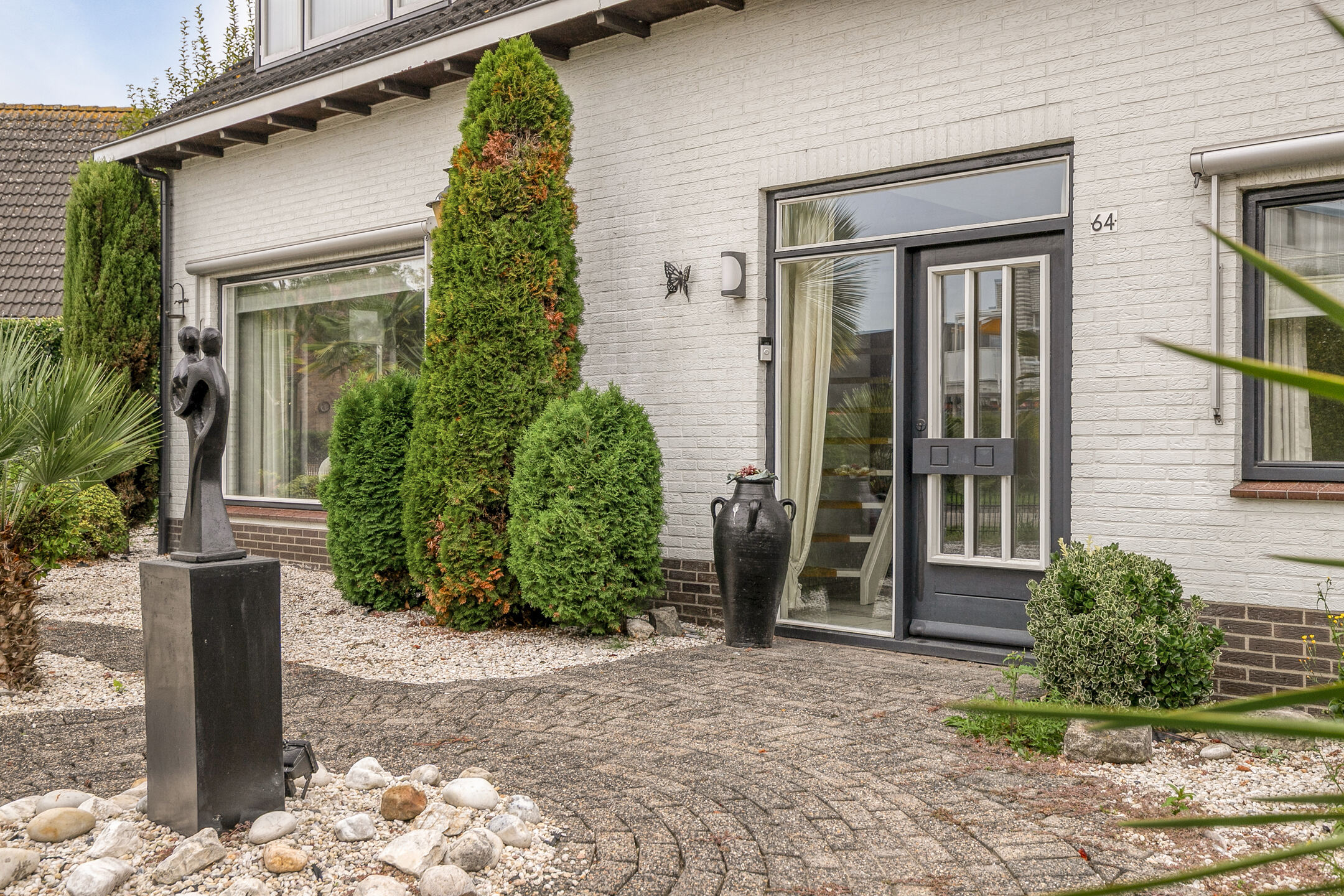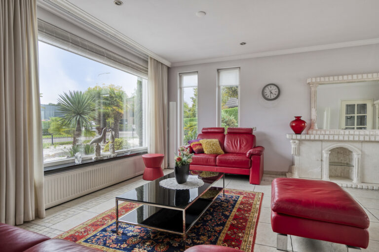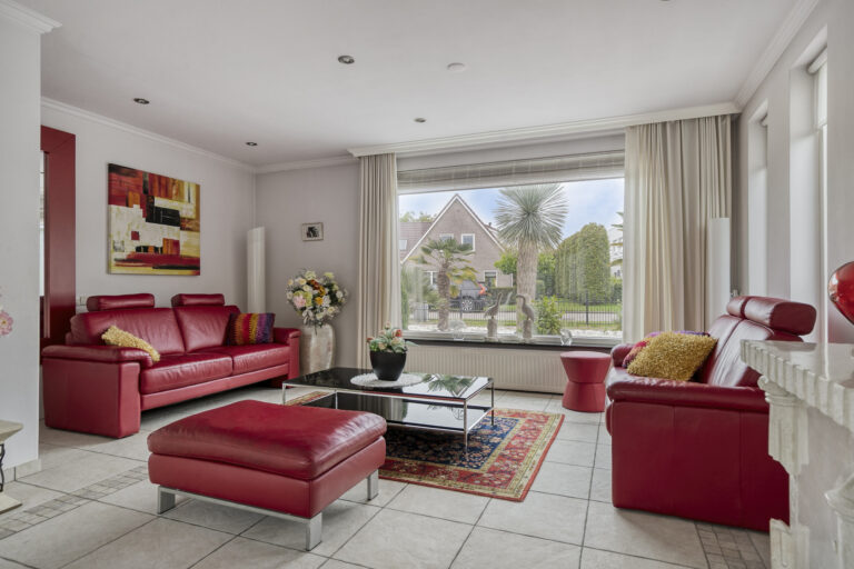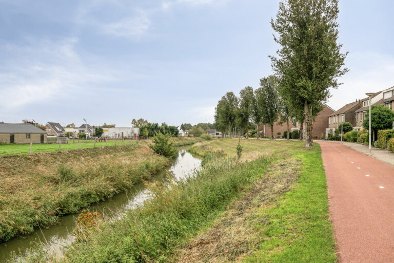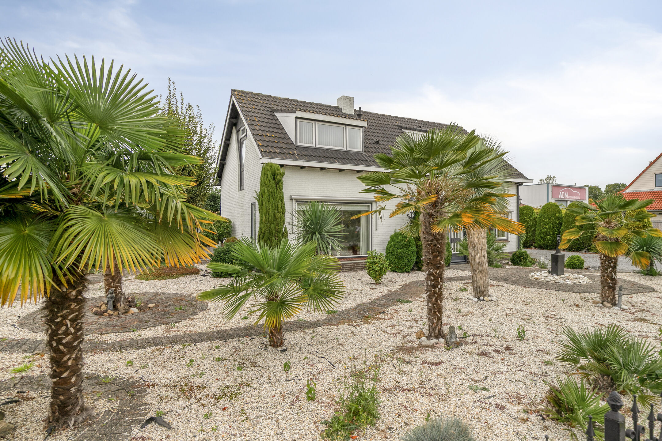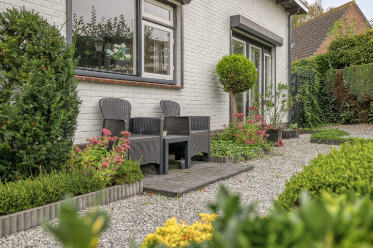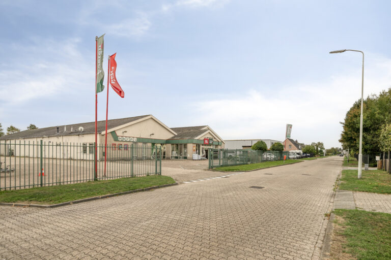 Ruime voortuin met brede oprit naar de loods, geschikt voor meerdere auto’s naast elkaar. De woning is omringd door een verzorgde tuin rondom.