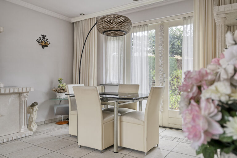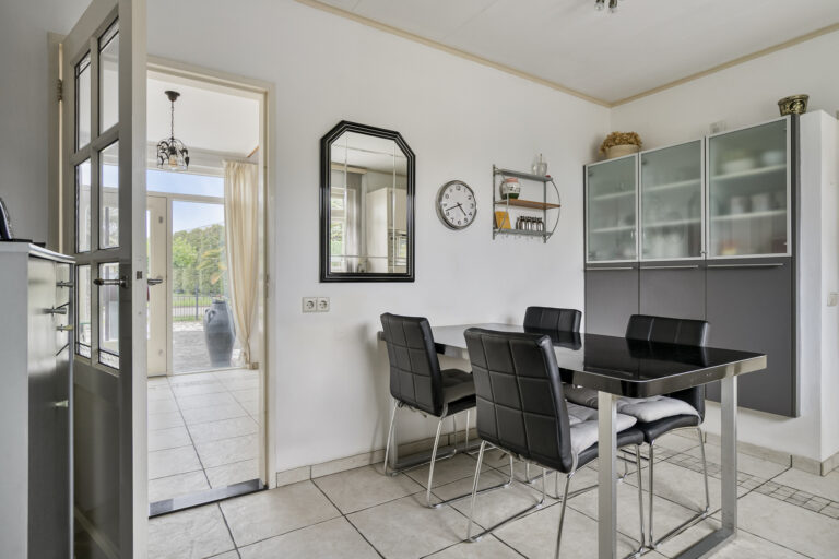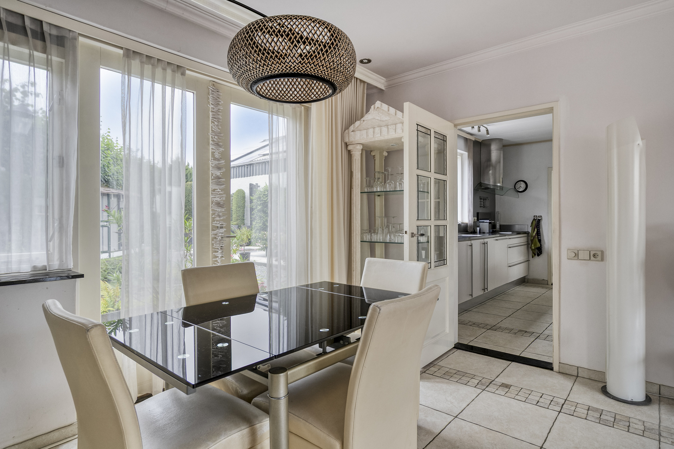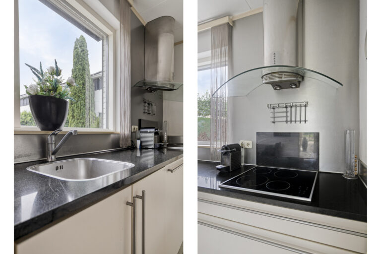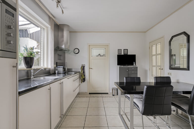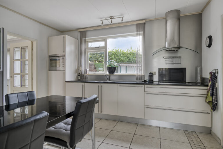 De moderne keuken is voorzien van een strak granieten werkblad, inbouwapparatuur en voldoende kastruimte. Dankzij het grote raam is de ruimte heerlijk licht en heb je een fijn uitzicht op de tuin. Er is bovendien plaats voor een eettafel, waardoor dit een gezellige eetkeuken vormt
